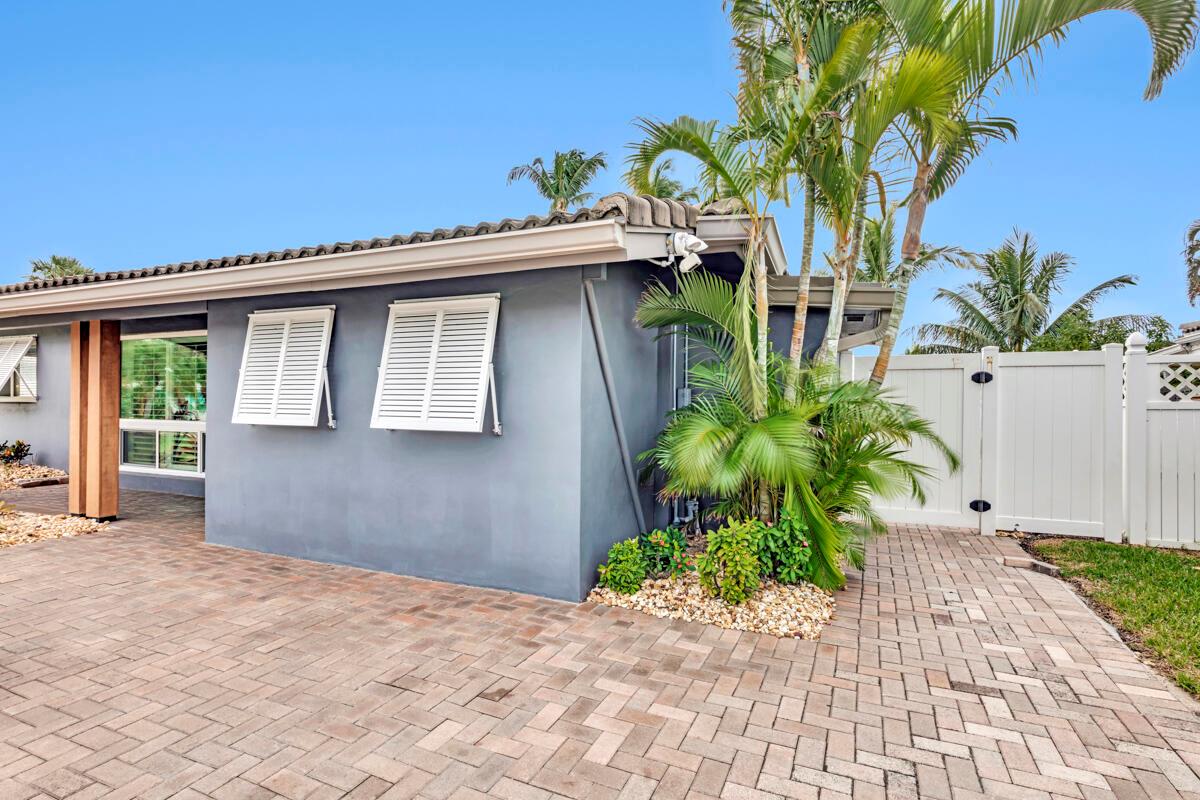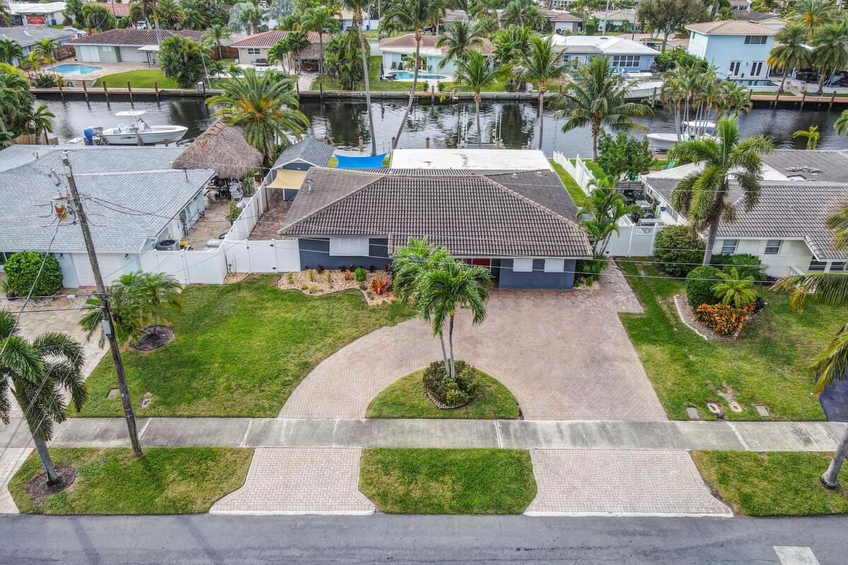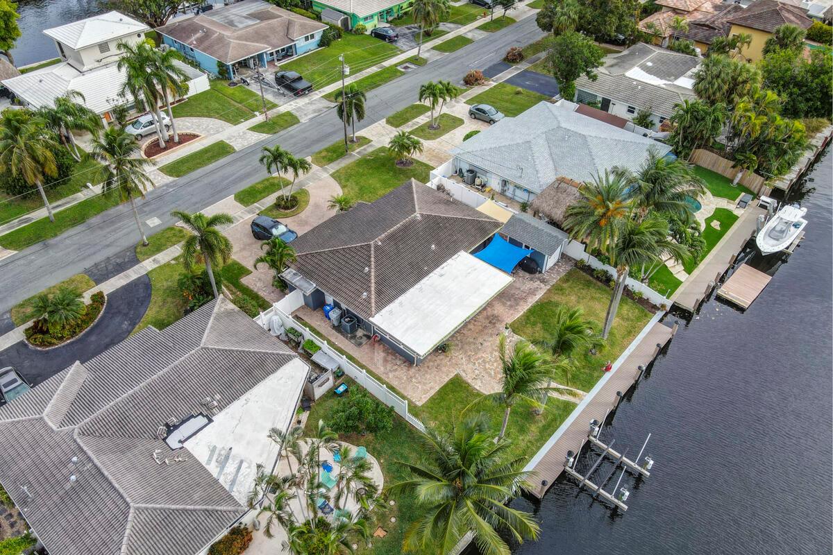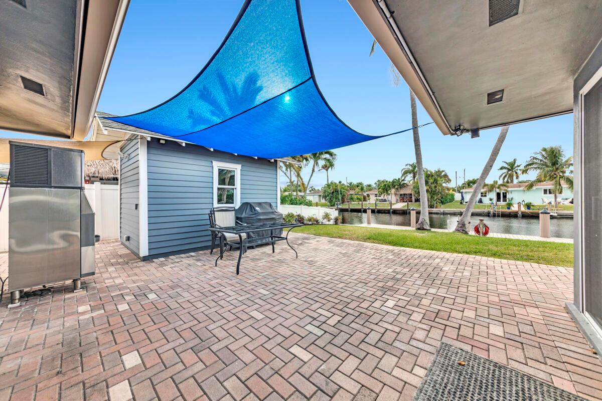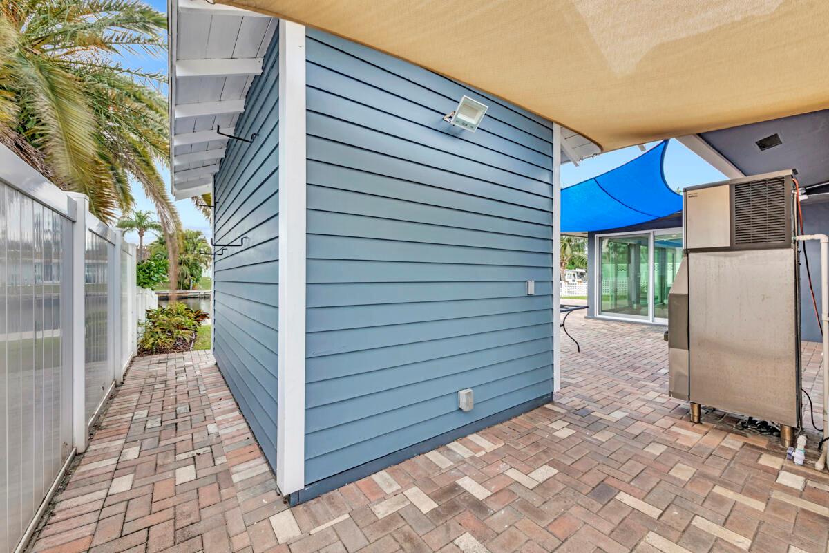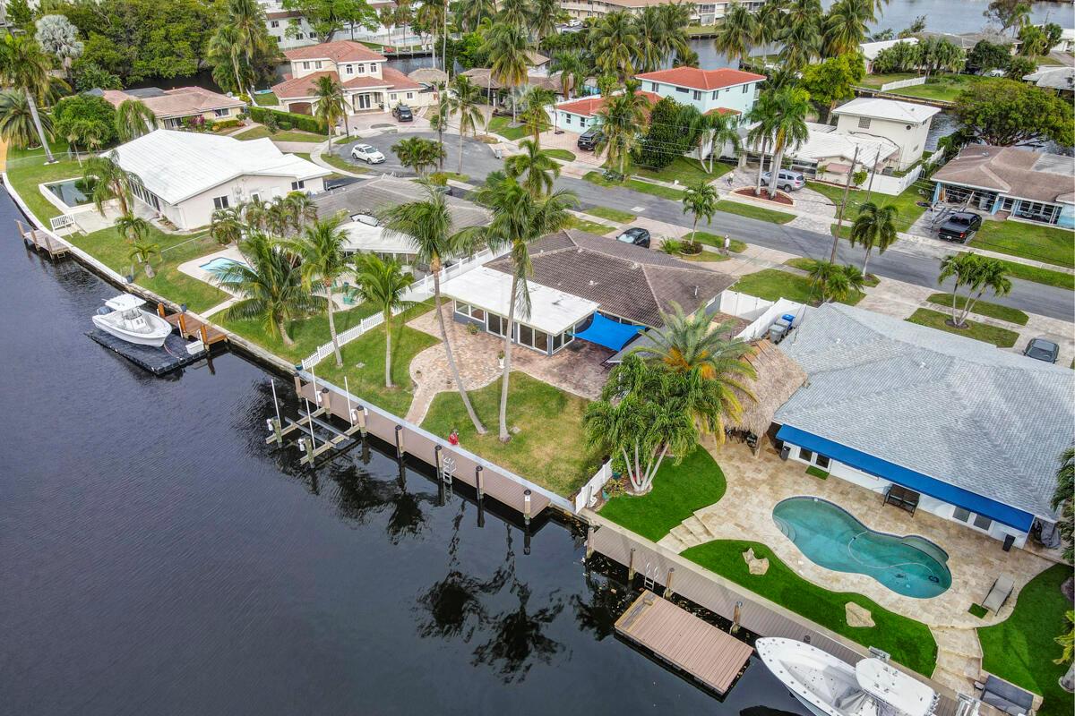 Waterfront Gem! 3 bedroom, 2 bath, waterfront Ranch just minutes to the Atlantic Ocean. Home boasts designer upgrades with Aga refrigerator and 5-burner gas stove w/ matching hood and pull-out pot filler, 2 Viking dishwashers, Kohler farmhouse porcelain sink, stone backsplash, white granite counter-top on island seats 8 people. Pull-out lower drawers, separate bar with pantry and glass-front cabinets. Impact windows throughout, custom blinds, plantation shutters and a 24 bottle wine holder. New 70' Weatherboard dock and upgraded seawall 2022/2023. New 16,500lb four post lift and Florida Historic Shed w/ electric. Plenty of storage w/ paver tiles on both sides of the home. bead board, ample high-hats, high-end ceiling fans, on-demand gas hot water heater.
