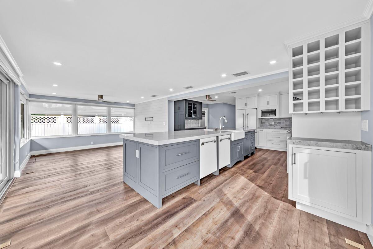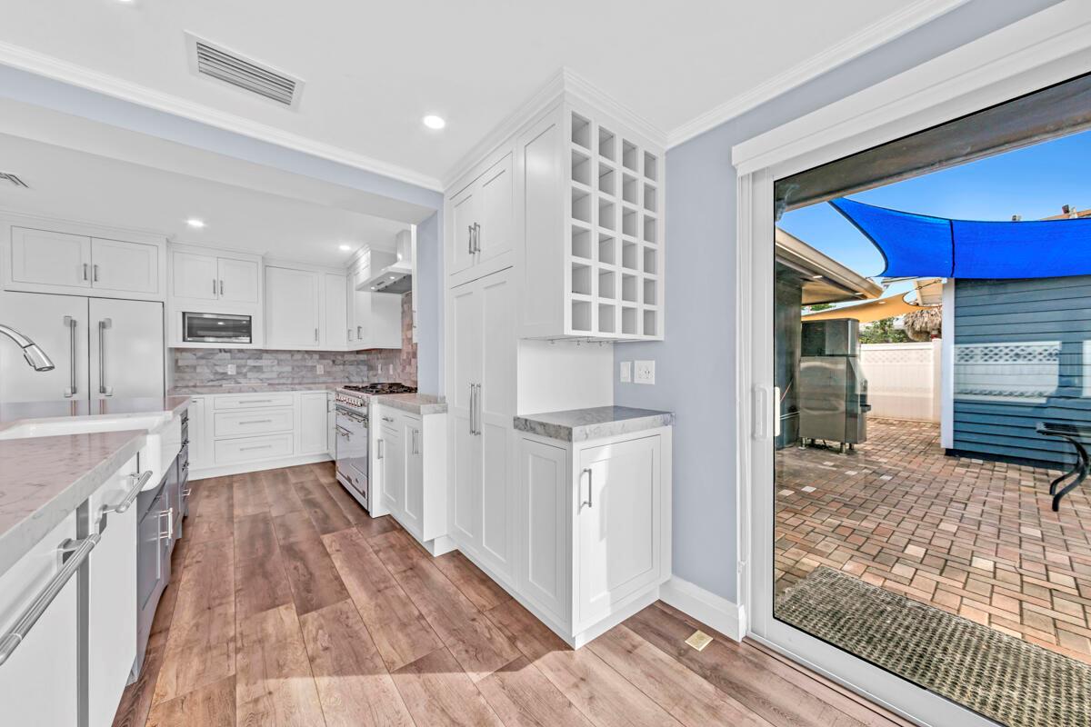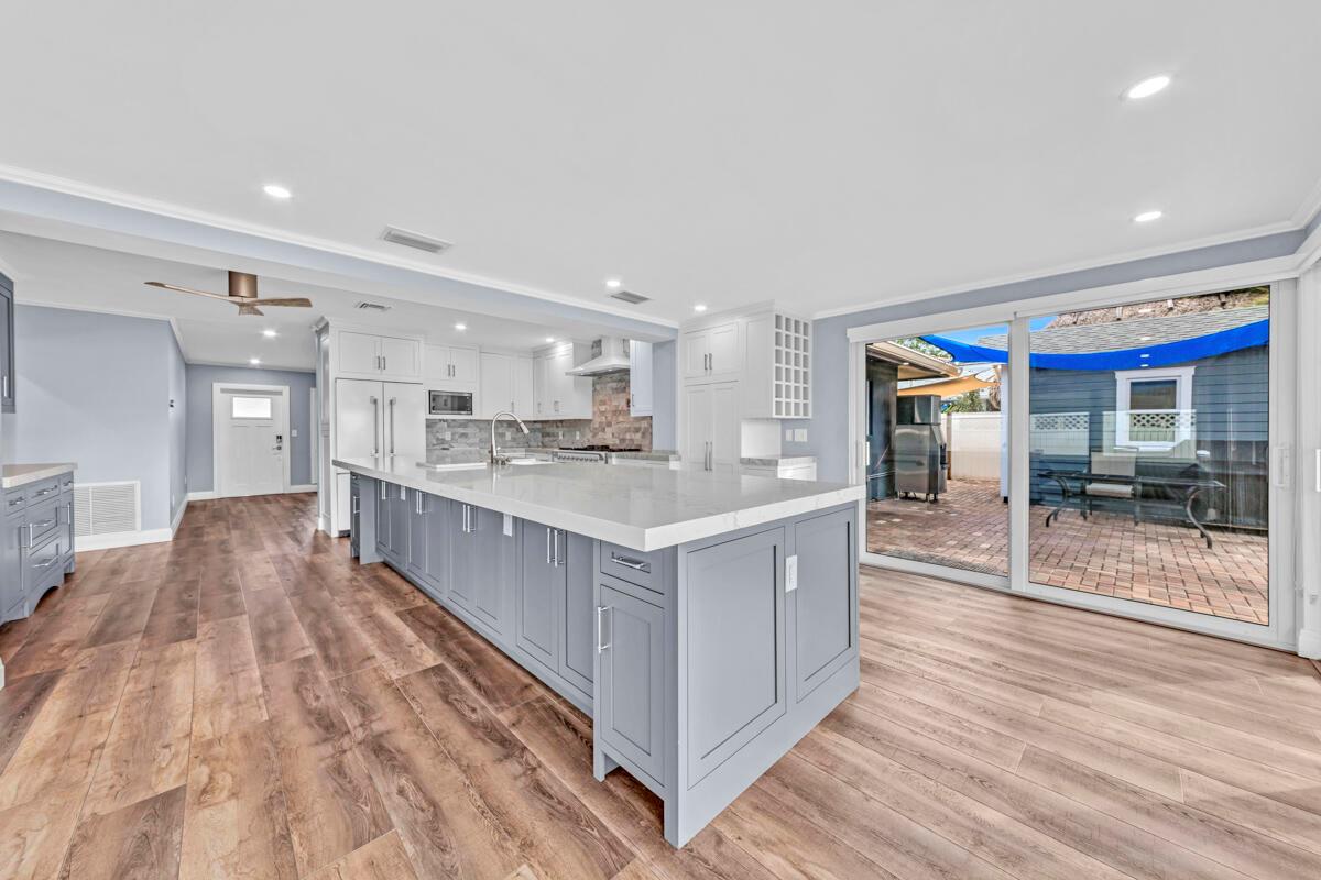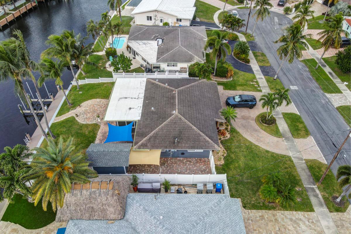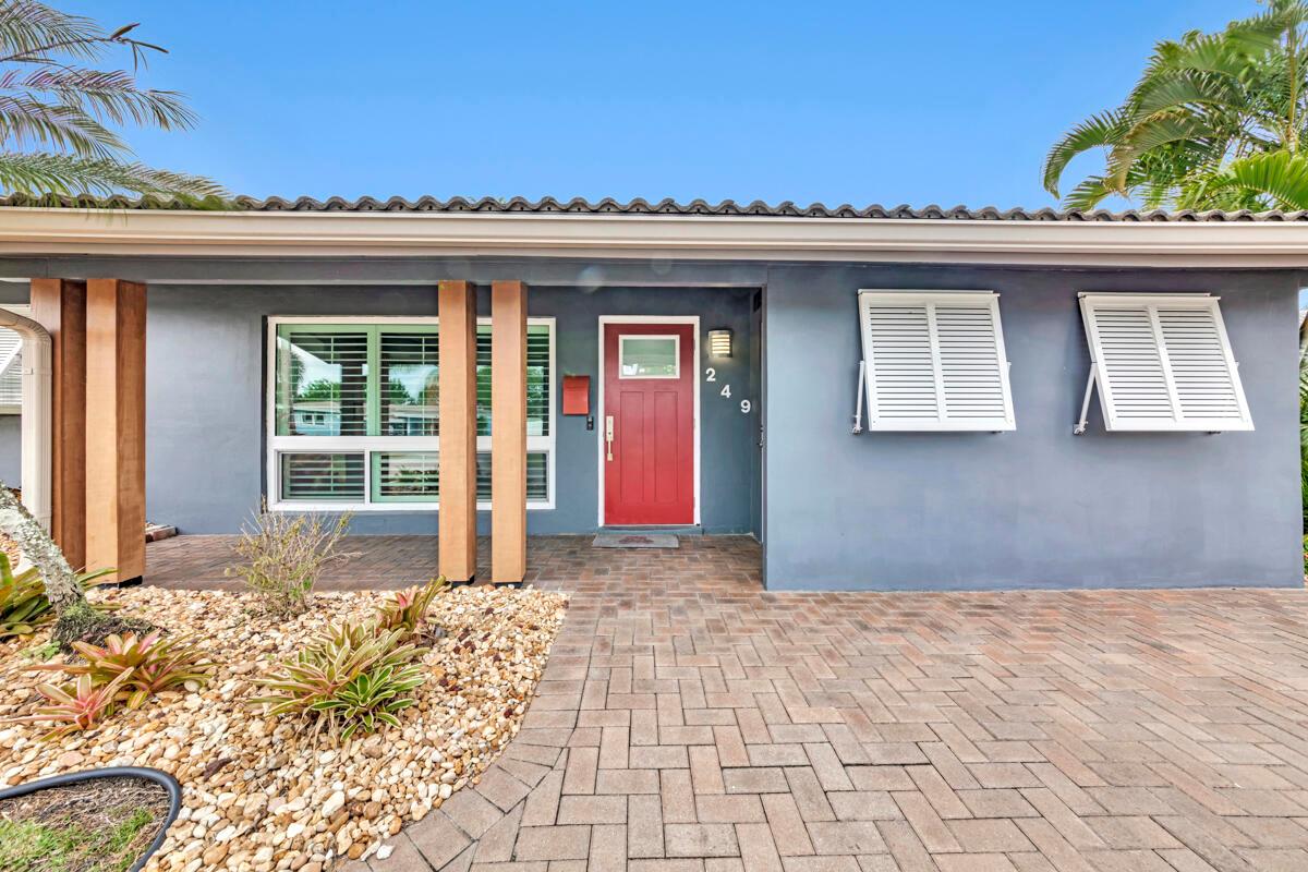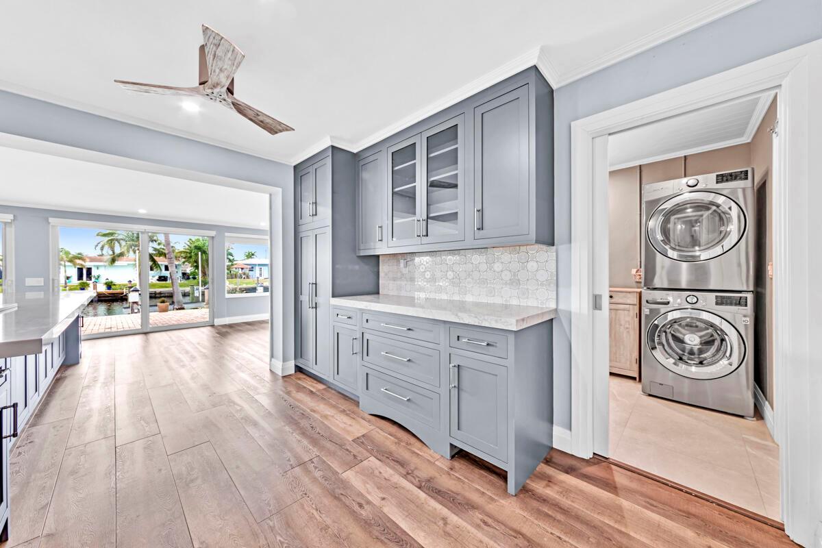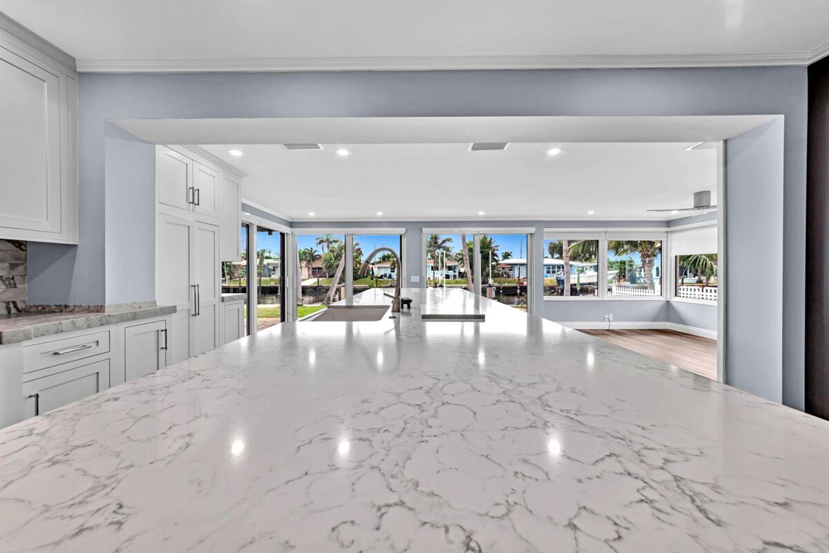 Waterfront Gem! 3 bedroom, 2 bath, waterfront Ranch just minutes to the Atlantic Ocean. Home boasts designer upgrades with Aga refrigerator and 5-burner gas stove w/ matching hood and pull-out pot filler, 2 Viking dishwashers, Kohler farmhouse porcelain sink, stone backsplash, white granite counter-top on island seats 8 people. Pull-out lower drawers, separate bar with pantry and glass-front cabinets. Impact windows throughout, custom blinds, plantation shutters and a 24 bottle wine holder. New 70' Weatherboard dock and upgraded seawall 2022/2023. New 16,500lb four post lift and Florida Historic Shed w/ electric. Plenty of storage w/ paver tiles on both sides of the home. bead board, ample high-hats, high-end ceiling fans, on-demand gas hot water heater.