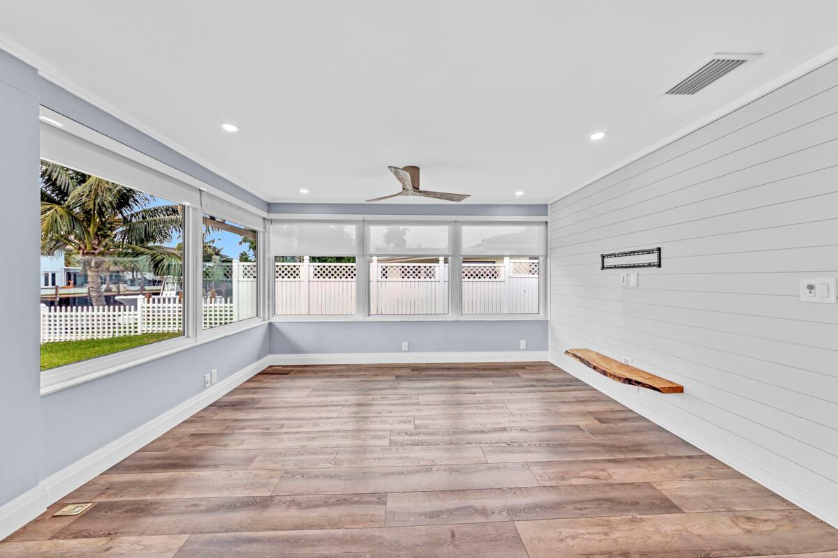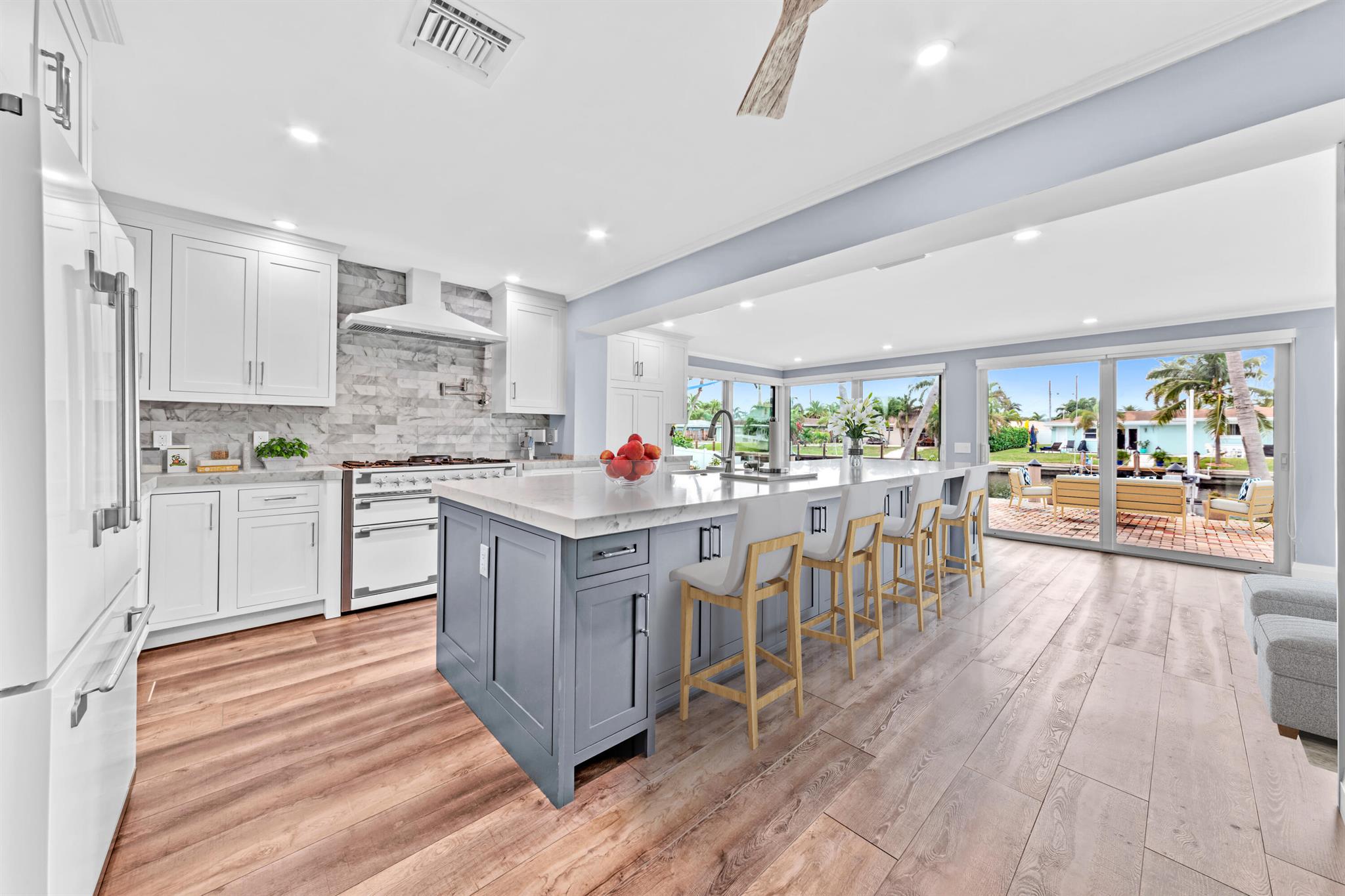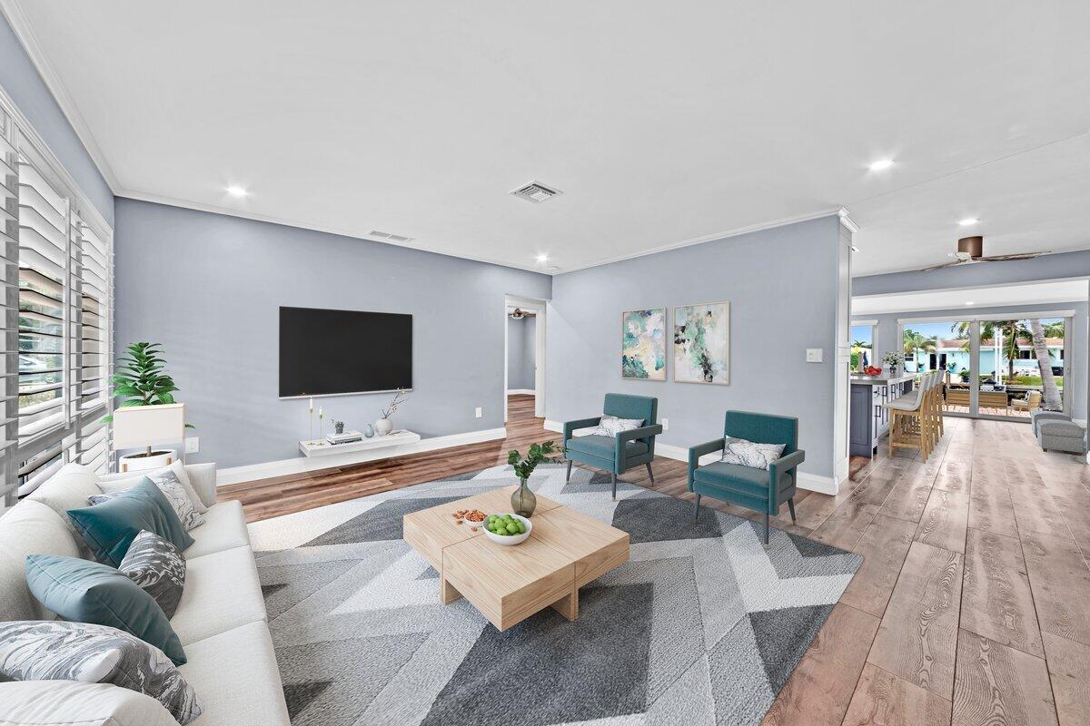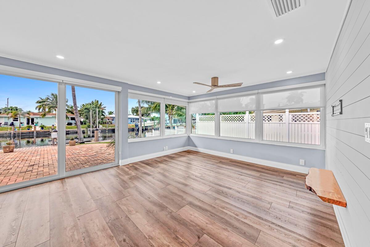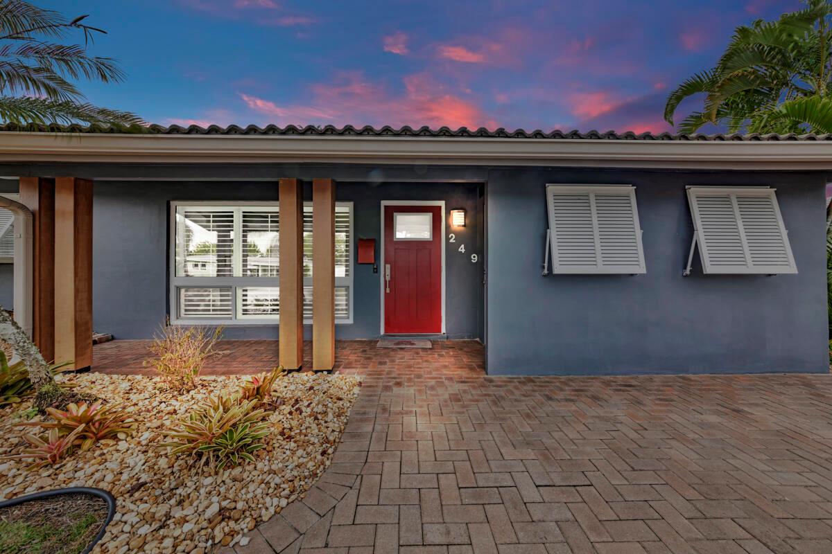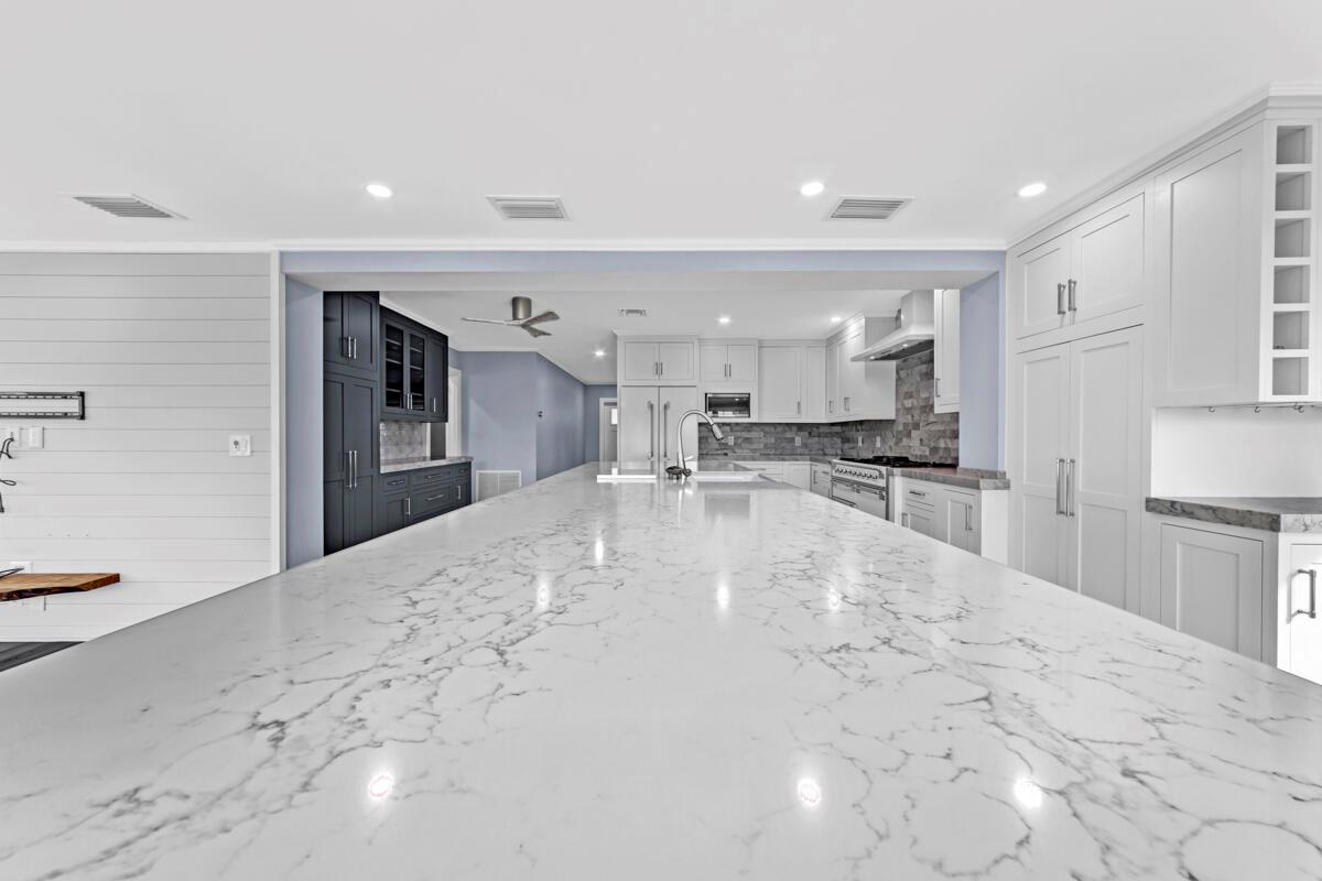 Waterfront Gem! 3 bedroom, 2 bath, waterfront Ranch just minutes to the Atlantic Ocean. Home boasts designer upgrades with Aga refrigerator and 5-burner gas stove w/ matching hood and pull-out pot filler, 2 Viking dishwashers, Kohler farmhouse porcelain sink, stone backsplash, white granite counter-top on island seats 8 people. Pull-out lower drawers, separate bar with pantry and glass-front cabinets. Impact windows throughout, custom blinds, plantation shutters and a 24 bottle wine holder. New 70' Weatherboard dock and upgraded seawall 2022/2023. New 16,500lb four post lift and Florida Historic Shed w/ electric. Plenty of storage w/ paver tiles on both sides of the home. bead board, ample high-hats, high-end ceiling fans, on-demand gas hot water heater.