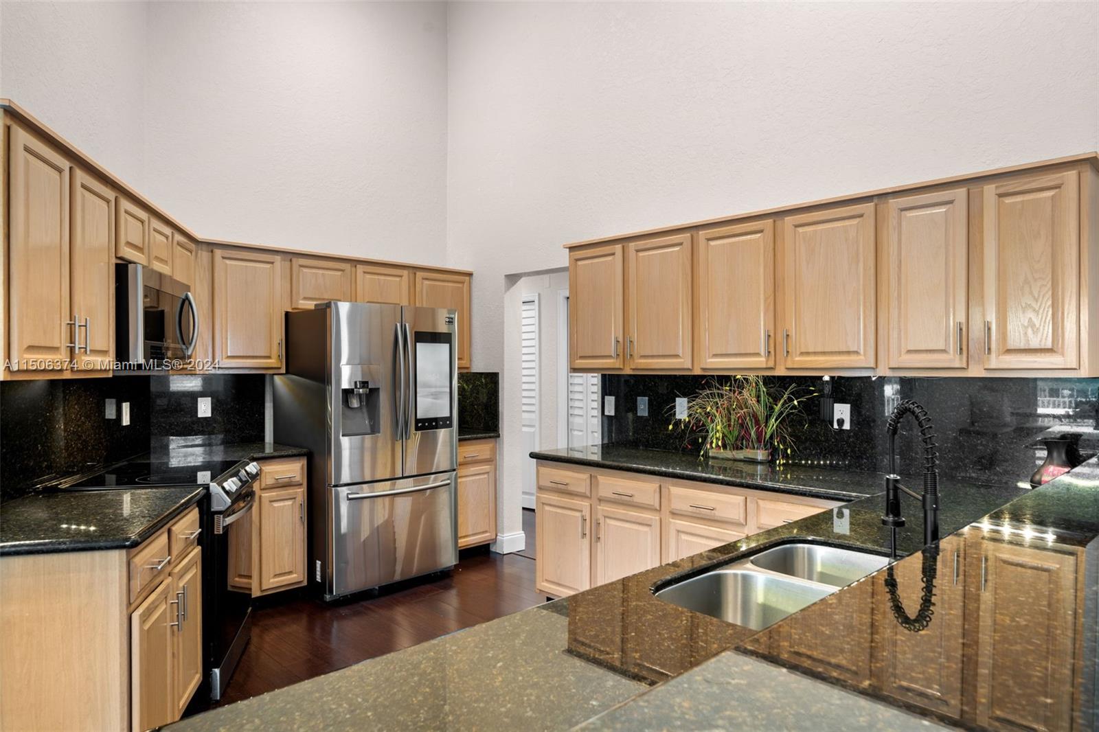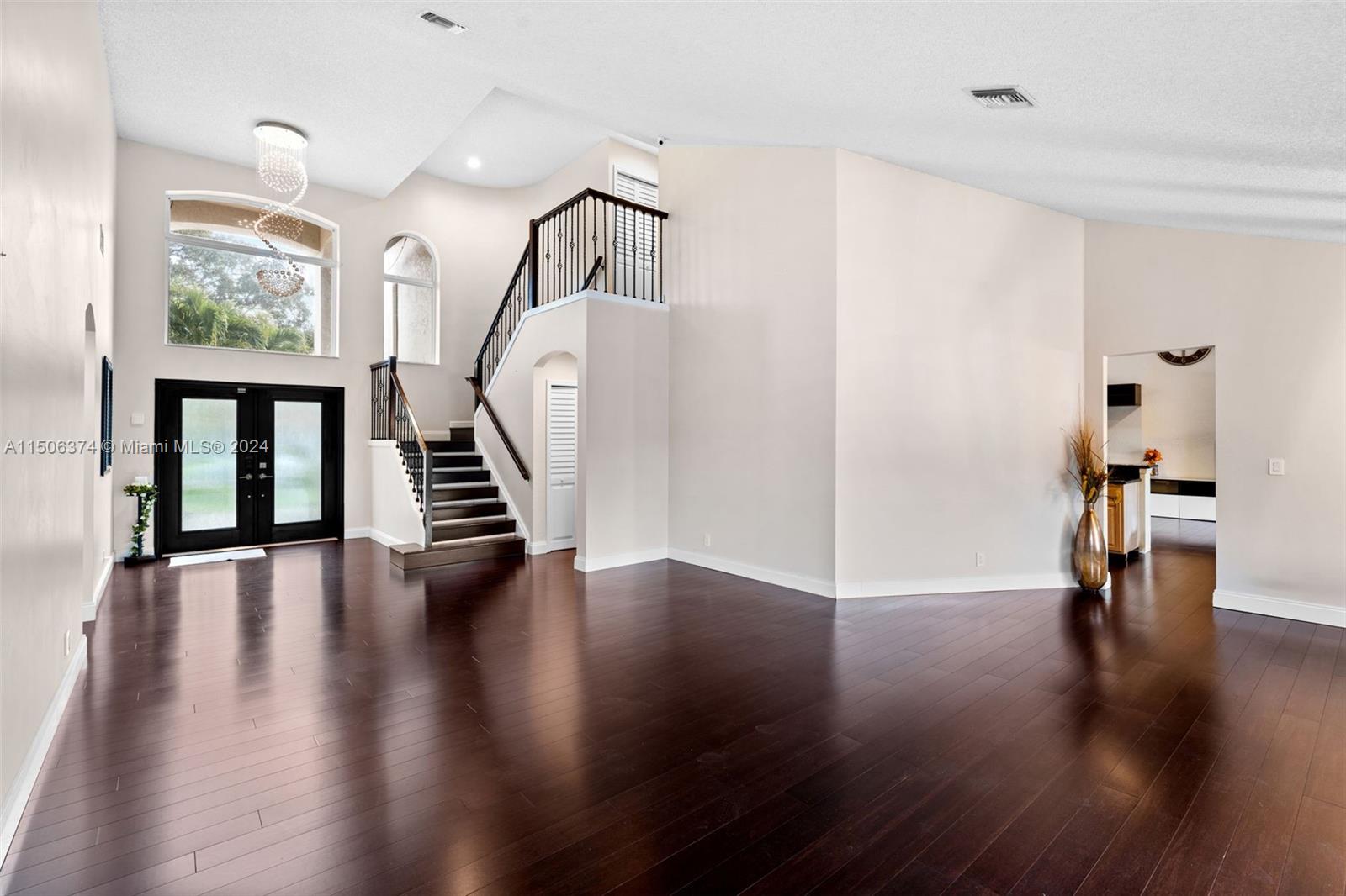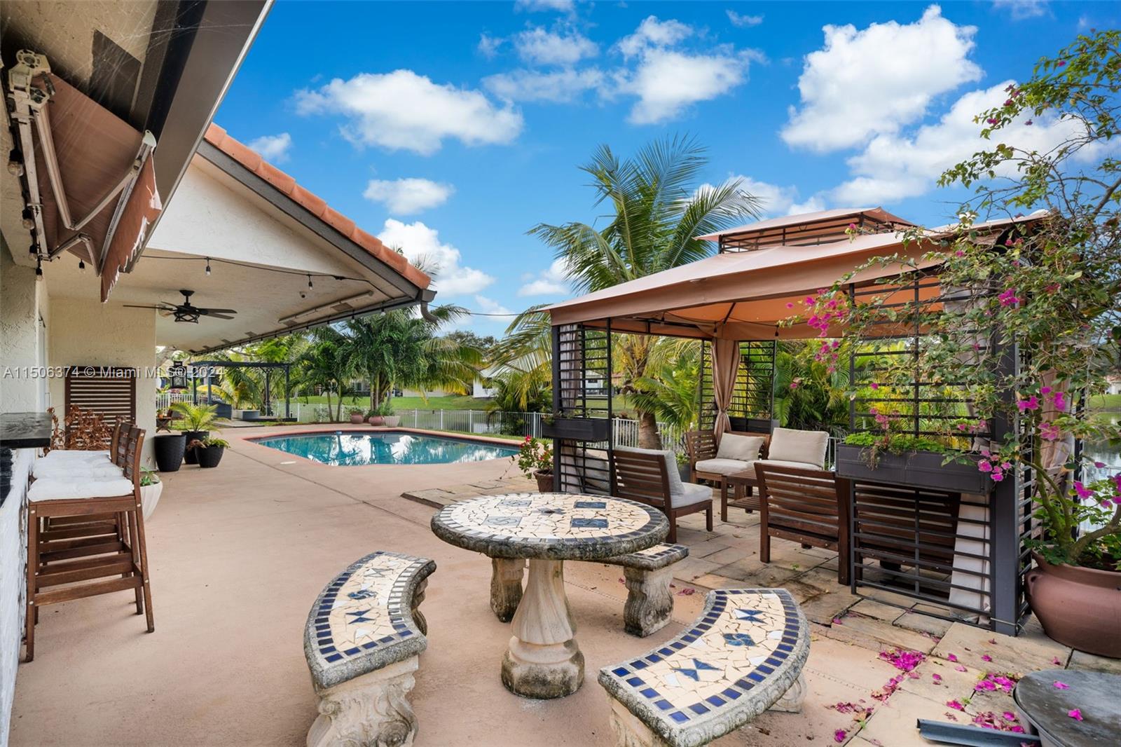 Upgraded & Spacious 4 Bed, 3 Bath Lakefront Home in Coral Spring's convenient Carriage Pointe Estates. With one of the largest lots in this guard-gated community, you'll enjoy outdoor life with beautiful long lake views, a large fenced yard with pool, fire pit, outdoor serving bar, 2 pergolas and plenty of space for outdoor playtime. Inside you'll appreciate the comforts and security of a newer impact windows and doors, rich look bamboo floors, Stainless Steel appliances including Smart Fridge, Smart Thermostat, and a smartly designed first floor primary suite with large bathroom, quite ample closets, and calm aura. With a bright yet large laundry/utility room, even work can be a pleasure. Two car garage, long flagstone drive, & cul-de-sac, there's room for guests to join in the fun.