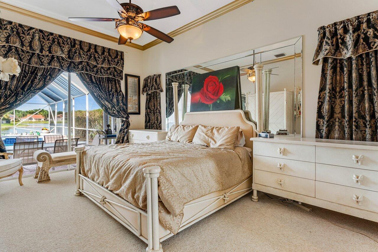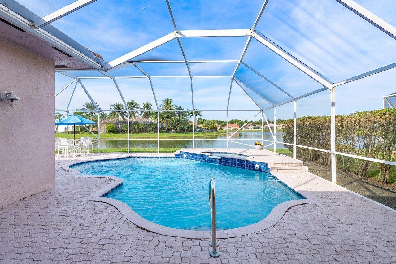 This single-story gem features a 4BR/3BA 3-car garage layout with a screened-in pool and spa boasting panoramic water views and a BRAND NEW concrete tile roof! Enjoy soaring high ceilings and a spacious three-way split open concept floor plan, with a beautifully renovated kitchen offering full size double ovens, cooktop, a walk-in pantry, and a massive island overlooking the family room all bathed in natural light. The entire home showcases porcelain tile on a diagonal with marble inlay. Wake up to water views from your primary suite with direct access to the patio, separate walk-in closets, and a breathtaking spa-like retreat for a bathroom. The remaining living quarters are split and separated, partitioned by doors enclosing each area as their own private en-suites.
