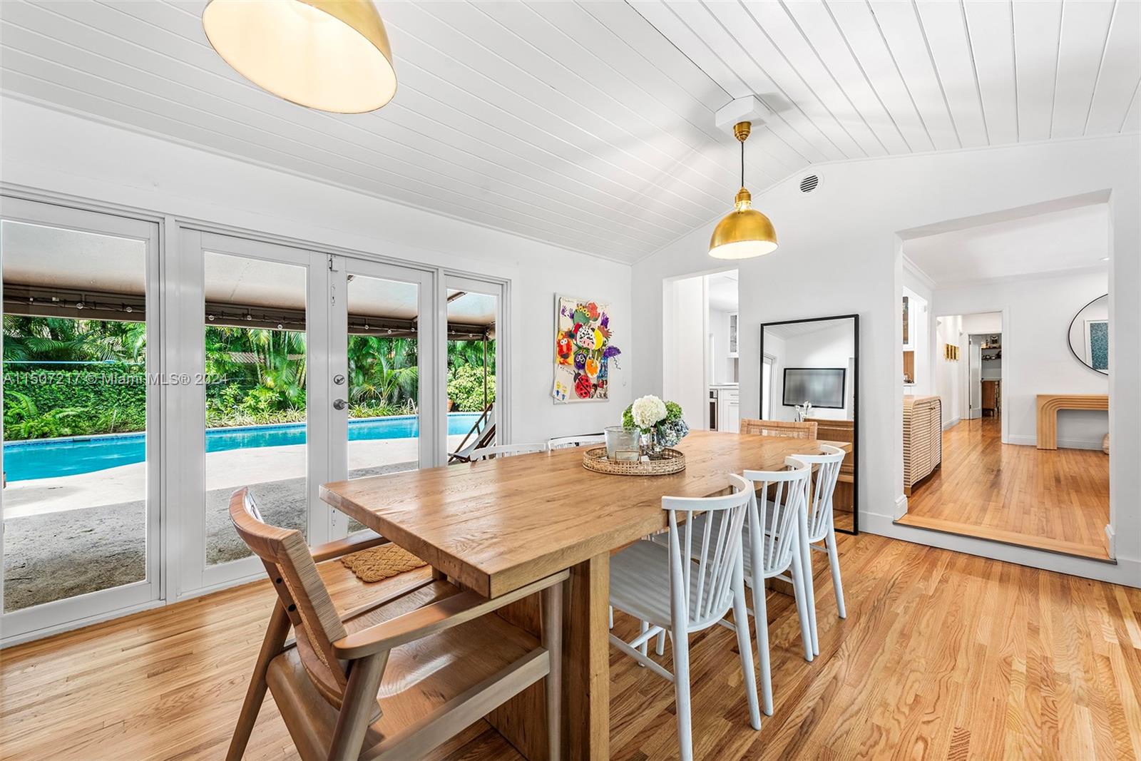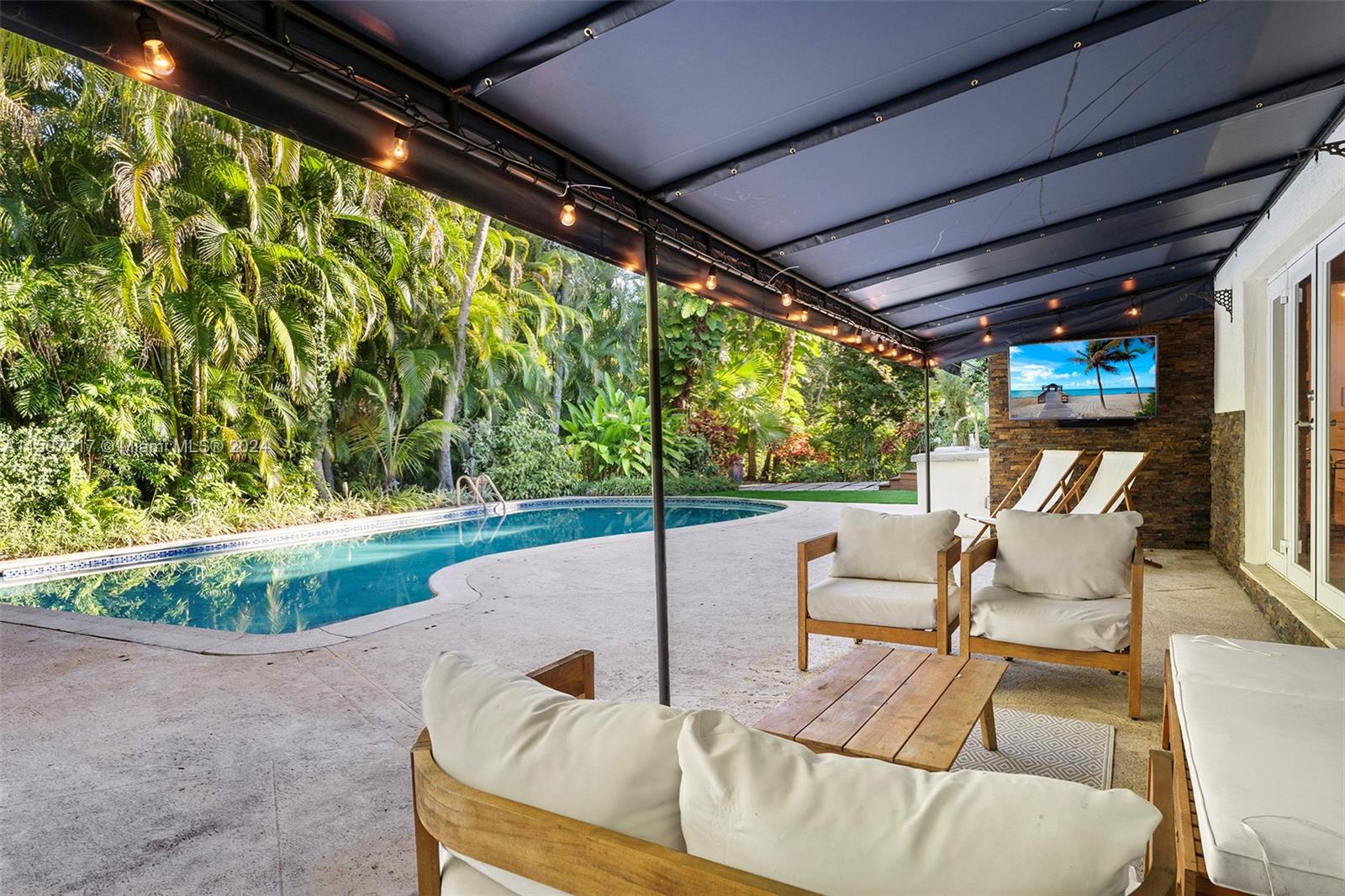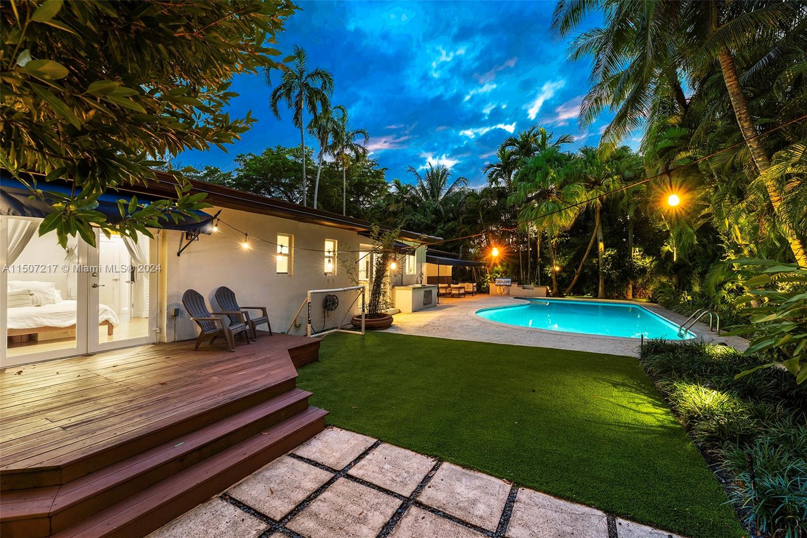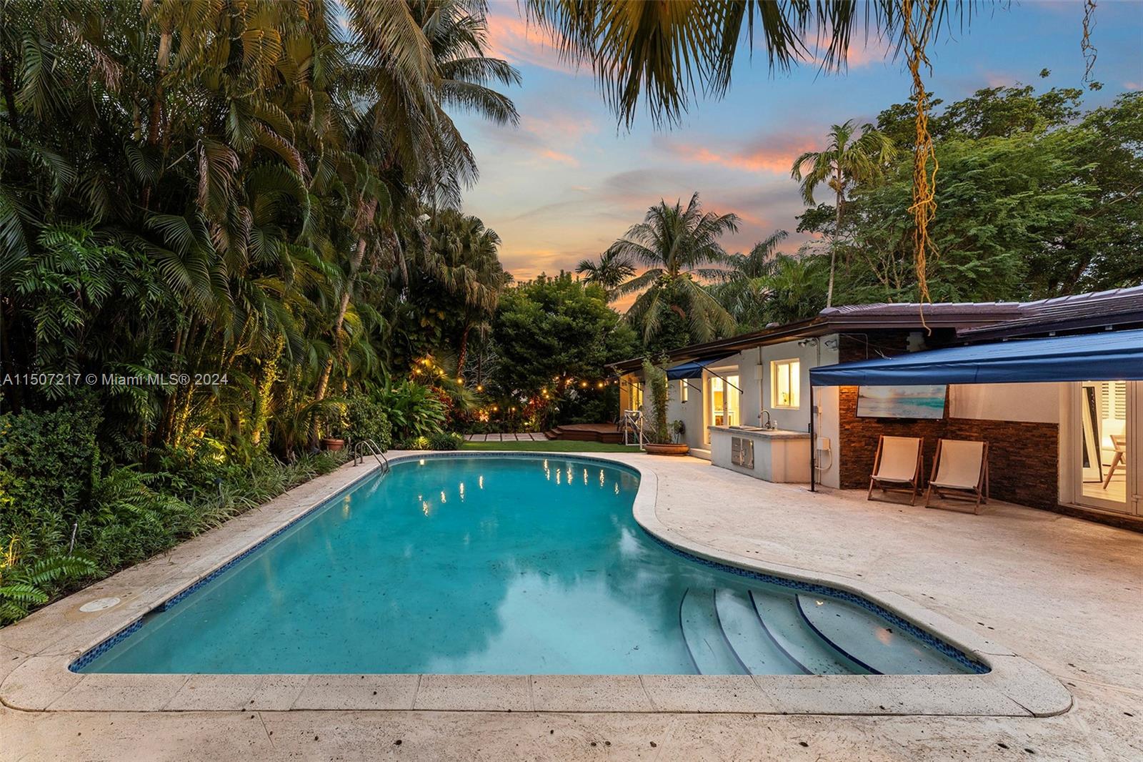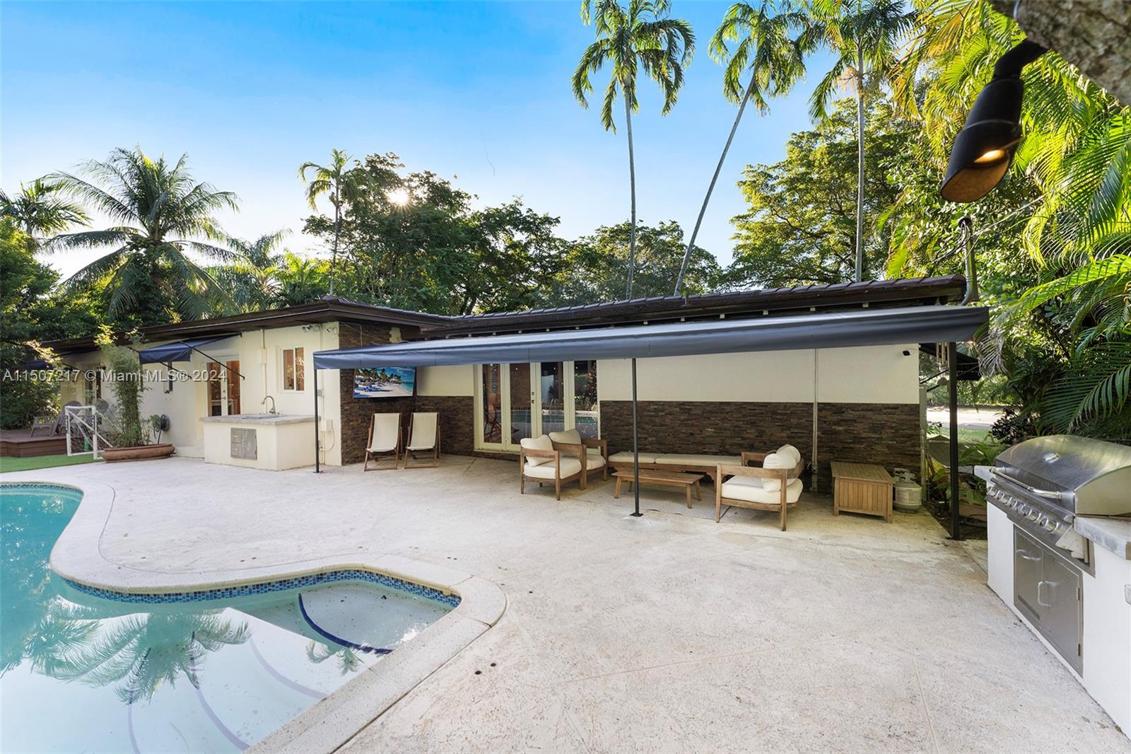 Brand new roof, awnings, gutters, and impact doors! Stunning residence in the heart of Coral Gables set just 1 block from the Gables Youth Center and Library. This timeless Gables residence is gracefully positioned on a generous 10,000 sqft lot with impact windows, new kitchen and brand-new roof, awnings, and gutters. Entering from tree-lined Aledo Ave, the light and bright living room with original hardwood floors leads to an expansive dining area, custom kitchen, large office/den, and captivating pool views from every angle. Lushly landscaped grounds extend a warm invitation to your own secluded pool sanctuary. Outdoor living spaces include covered terrace, outdoor kitchen, and deck off the primary suite offering ample opportunities to entertain and unwind poolside.