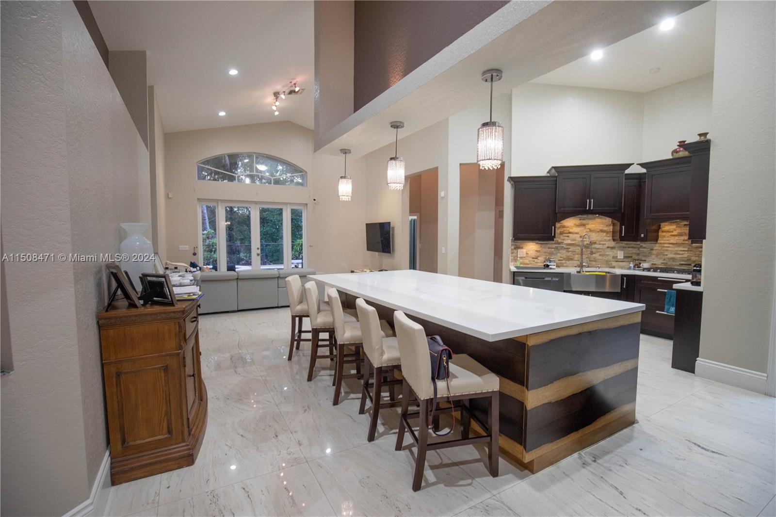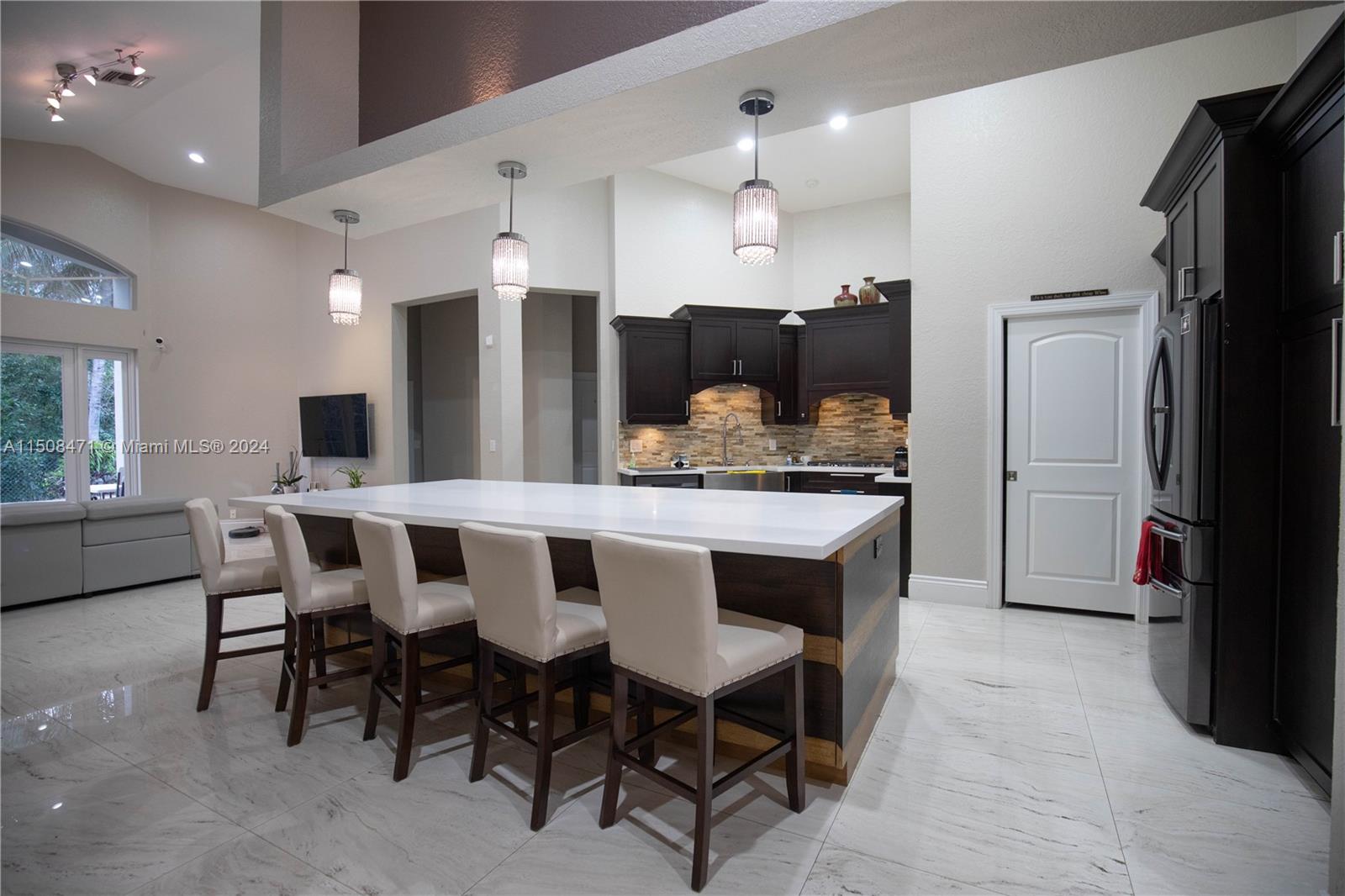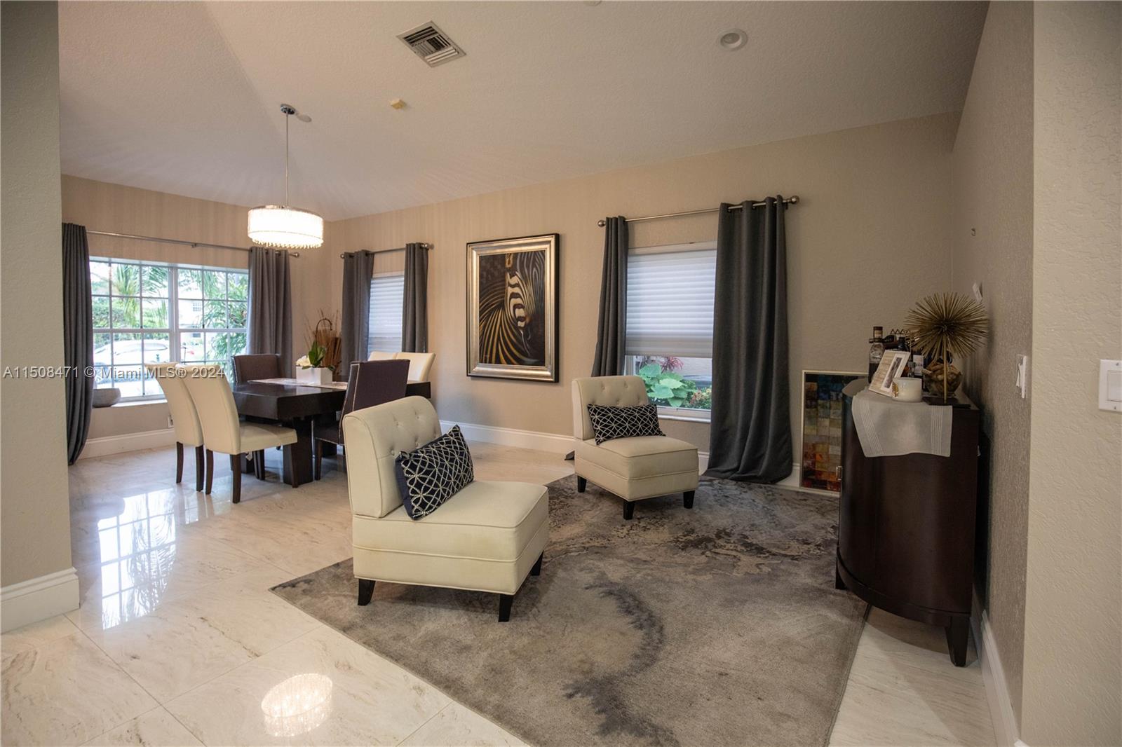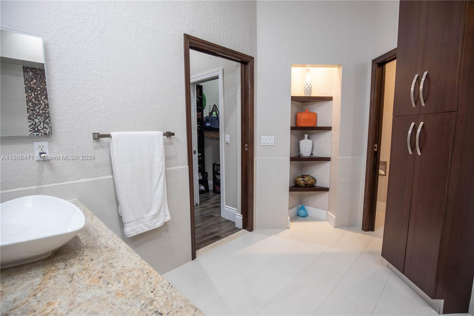 Priced to sell. Pride of ownership is evident throughout this remarkable ground-level home. Inviting spacious floorplan outlined by vaulted ceilings and 32"x32" porcelain tiles throughout the living areas. From the foyer you find the pool through the impact glass French doors. Free-form pool/spa with a marble paver deck overlooking a serene sanctuary with partial water views provides excellent entertaining. This popular split-floorplan features 5 beds, 3 full baths and a two-car garage. Open and spacious gas kitchen (2x250 gas gallon tanks) with an oversized island with incredible storage areas, quartz countertops, wooden cabinets and ss appliances. The clothes dryer is also gas. Elegant main suite with two walk-in closets and a split shower/tub and bidet. No HOA approval req'd for buyers.