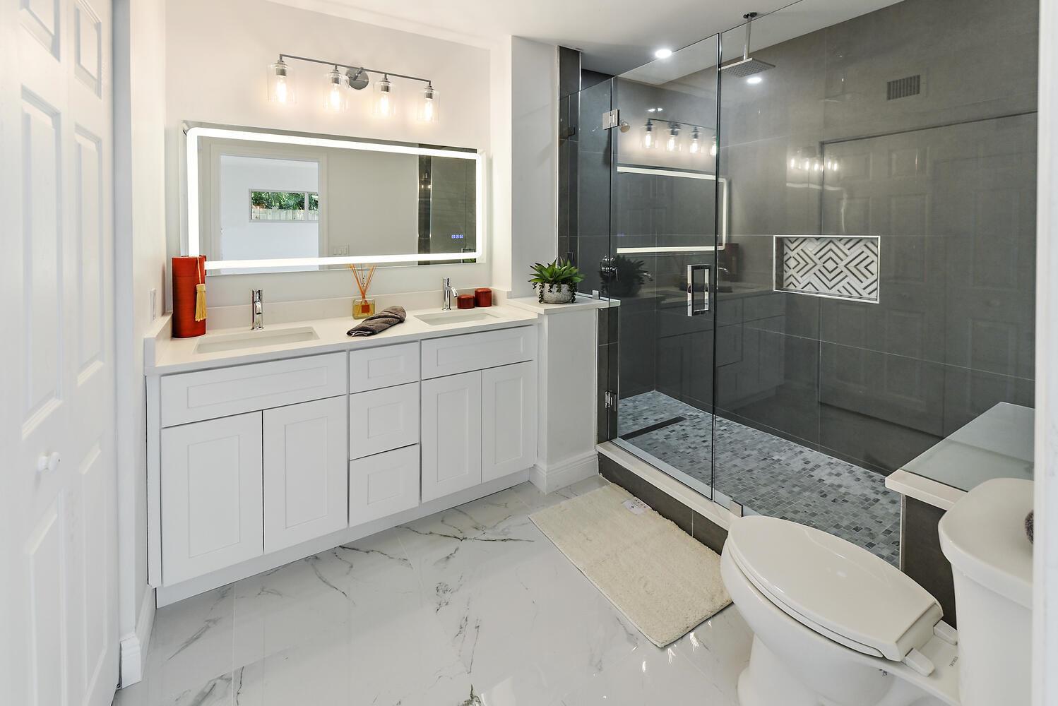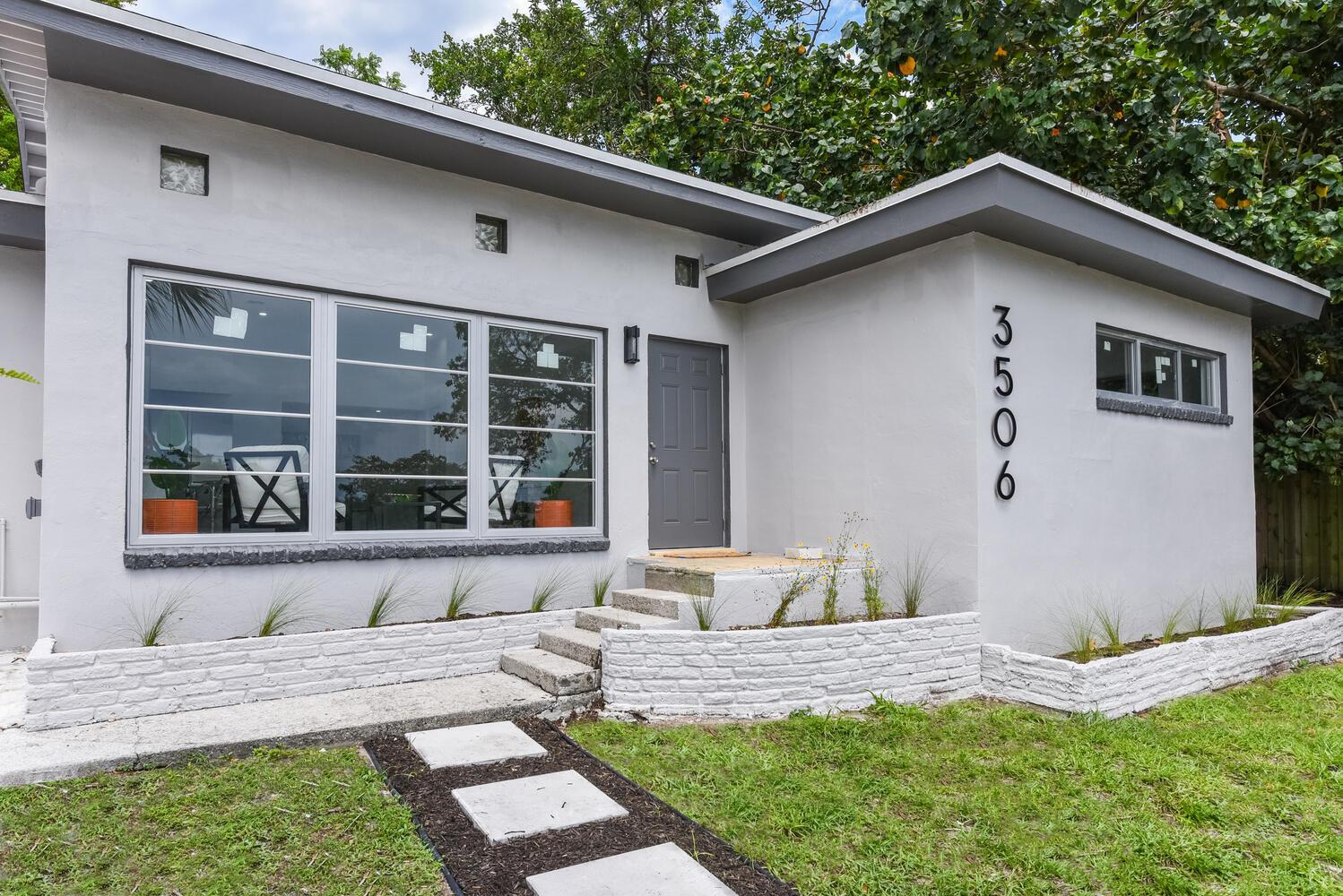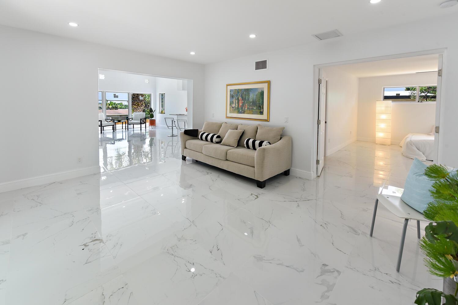 Enjoy sunsets through your enormous picture window from one of the highest sitting houses in WPB. NEW PERMITTED EVERYTHING: new roof, impact windows, electric, plumbing, AC and ducts, tile floors-all with permits. Soaring 10' ceilings in the open, sunny 21.5' long living room. The kitchen has new soft-close cabinets, beautiful quartz counters and Samsung SS appliances. Enter the large master bedroom through French doors. The master bathroom is a spa retreat with an 8' long shower complete with rain head and bench. Walk outside through sliders in the master bedroom or family room to your new patio and large backyard surrounded by mature shade trees. This hilltop jewel sits on almost 1/4 acre in historic Northwood Hills close to beaches, downtown and Rybovich. Buyer must confirm measuremts.