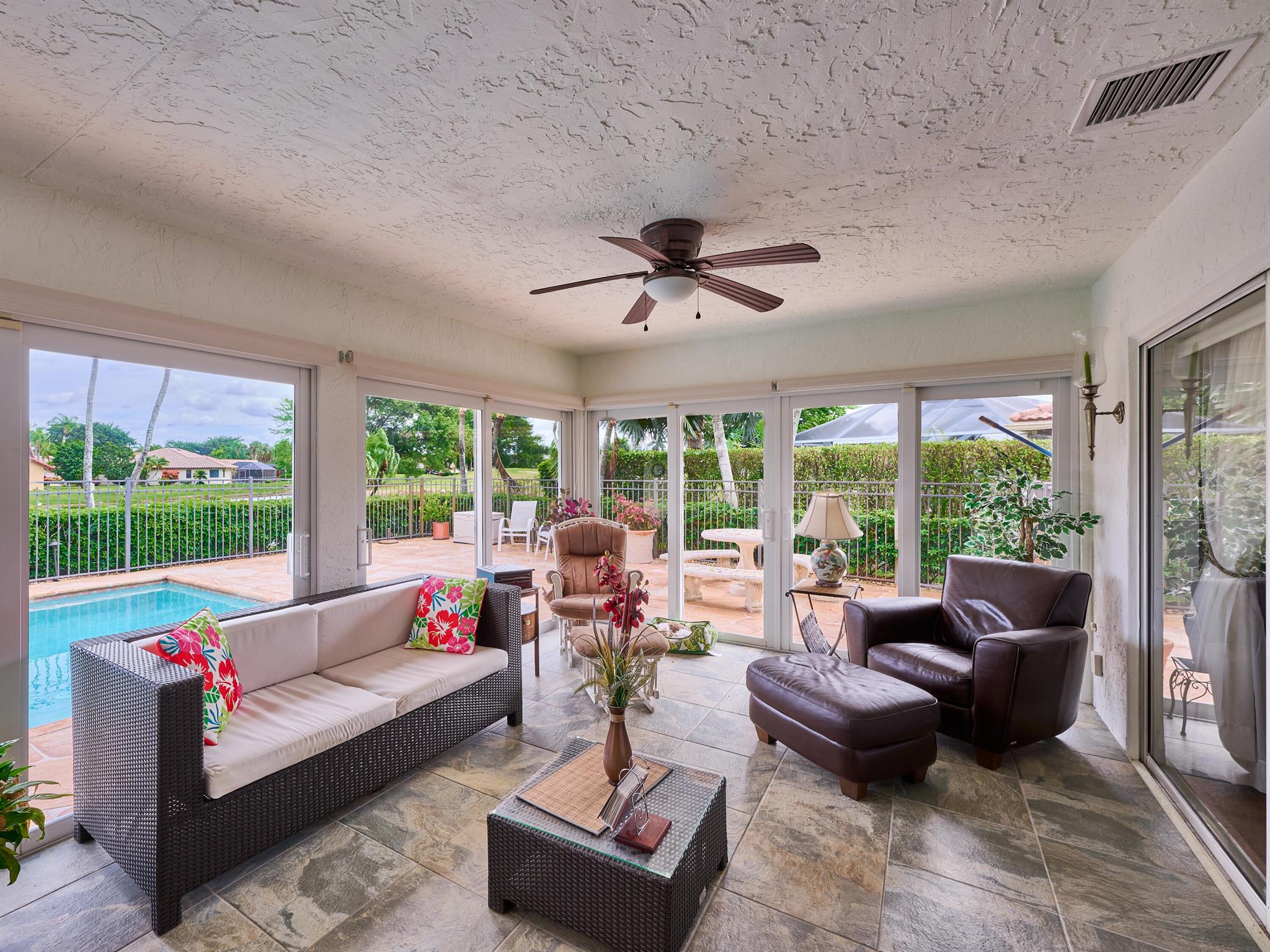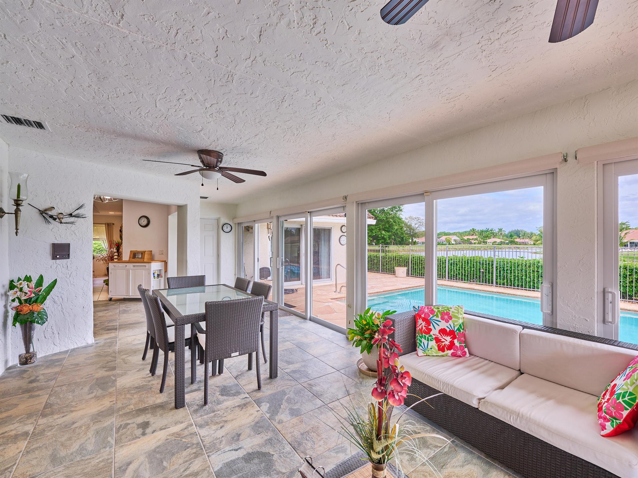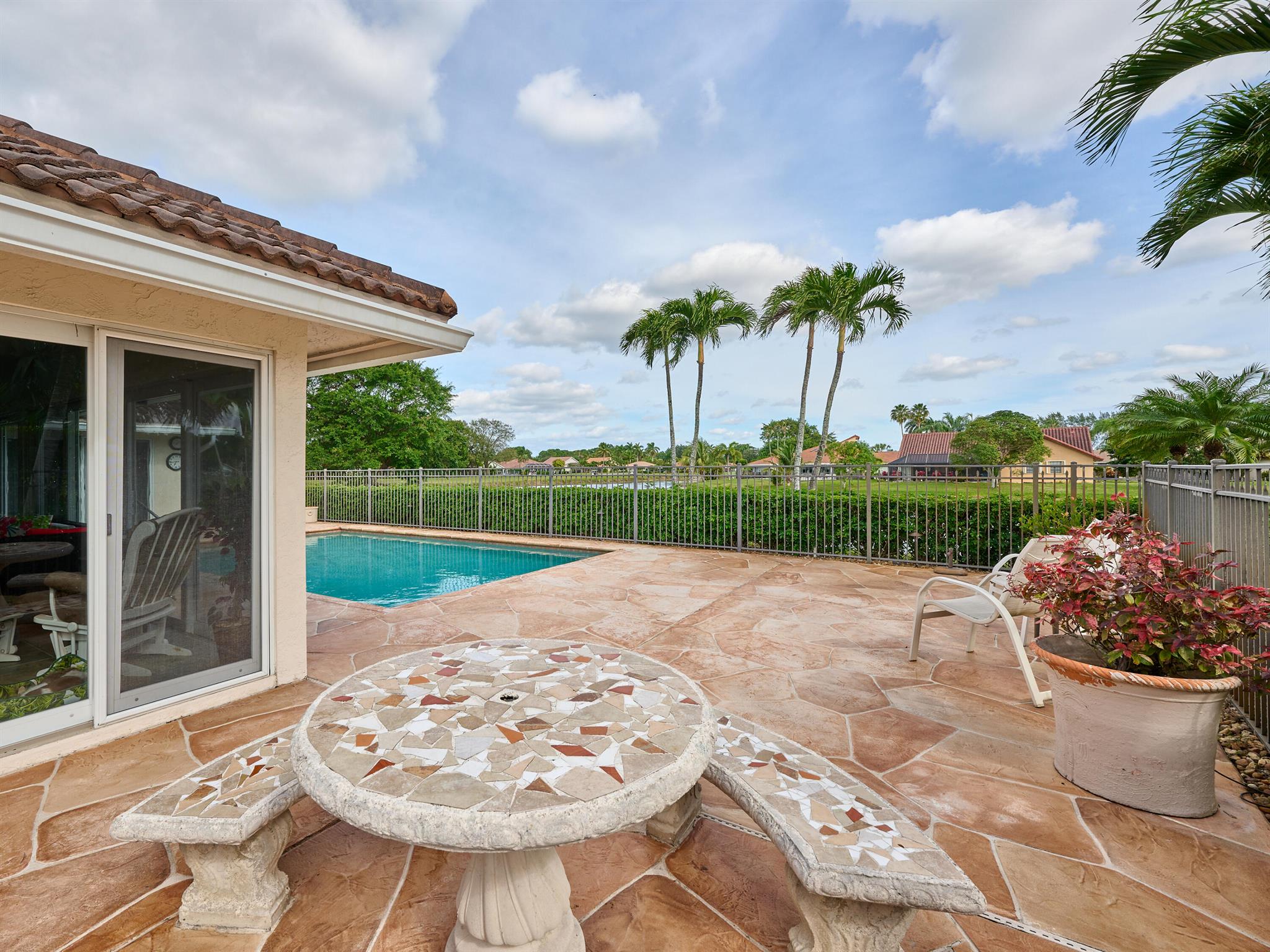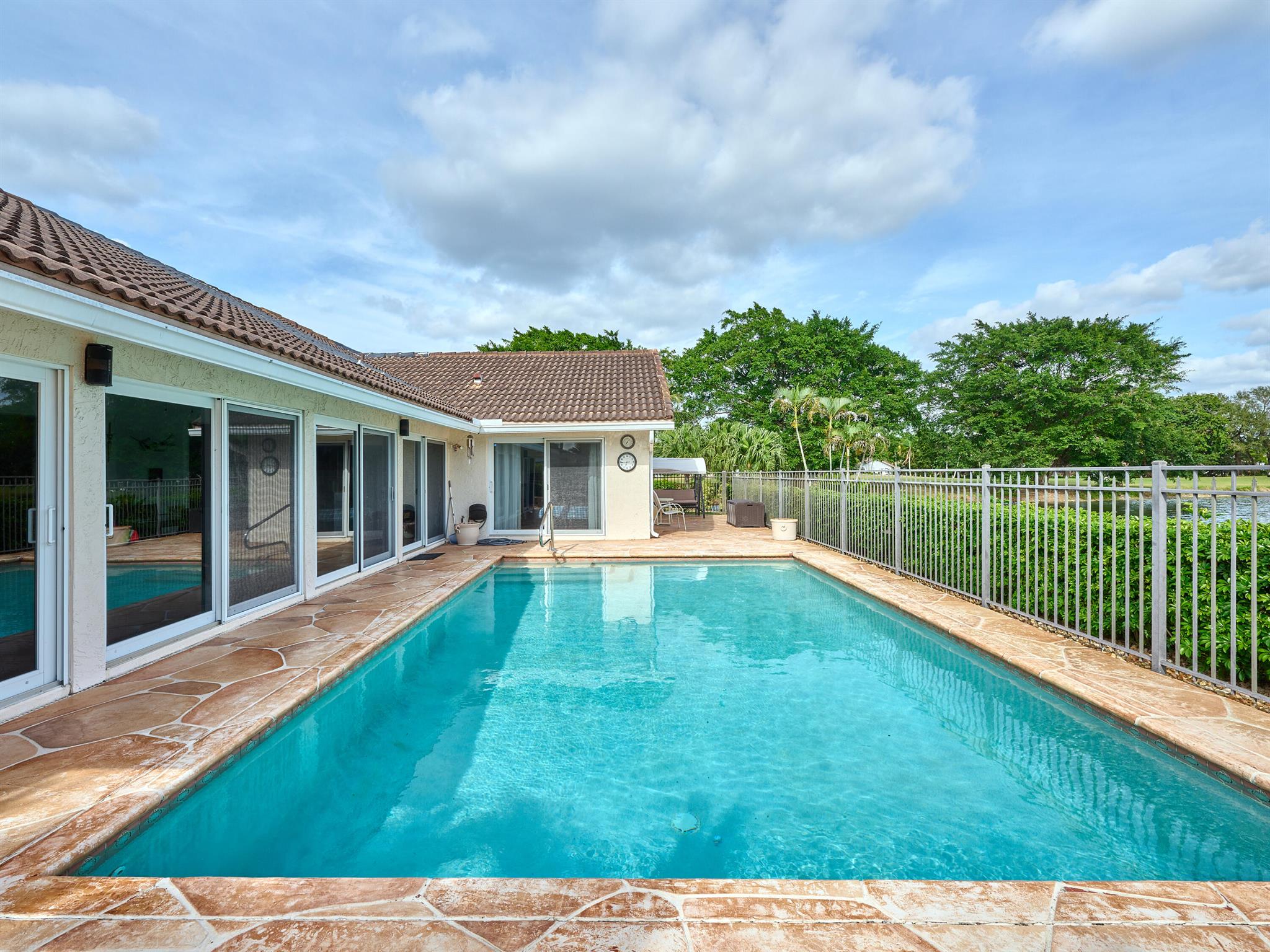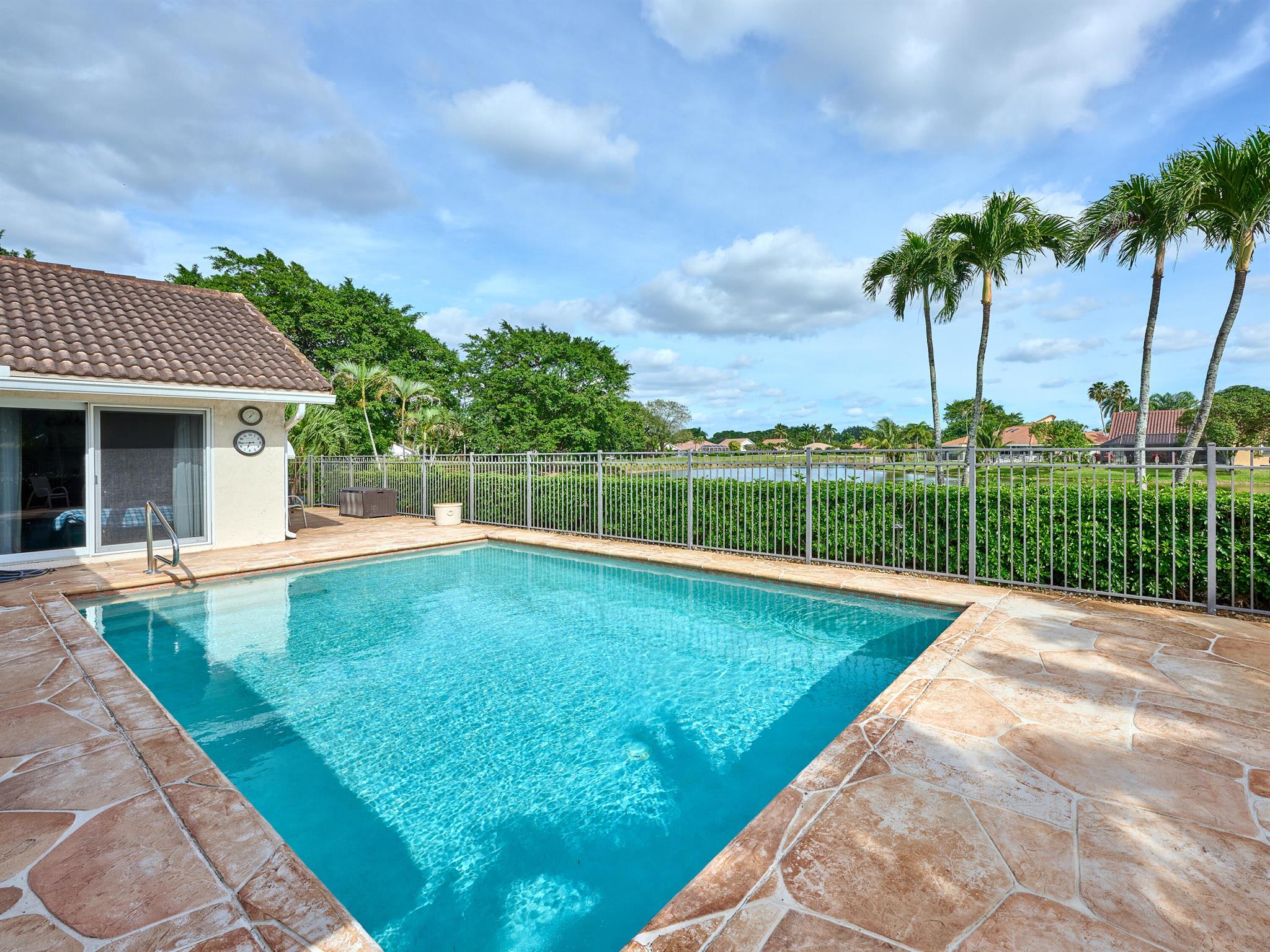 Situated on one of the most EXQUISITE WATERFRONT and GOLF lots of the GATED, Country Club Community Boca Greens. Soaring ceilings, Natural Light and Panoramic Lake views set the stage for this SPACIOUS 3 bedroom 2 bath pool home with a BRAND NEW ROOF!! NO MANDATORY MEMBERSHIP| IMPACT WINDOWS and DOORS!! Primary room features a large walk in closet, wood flooring, sliders leading out to sunroom, oversized ensuite with dual vanity, walk in shower and soaking tub. High Gloss Sleek Grey cabinets in Kitchen | Corian Counters| Bar Top Seating| SS appliances | pendant lighting| Slate Tile| Oversized Florida room featuring panoramic views of Pool, Lake and Golf course| Impact Sliders that lead to a gorgeous stamped concrete patio, sparkling pool with wrought iron fencing