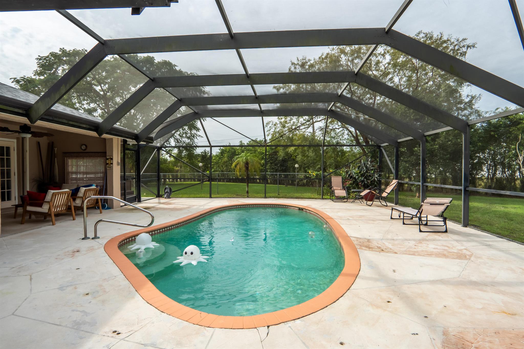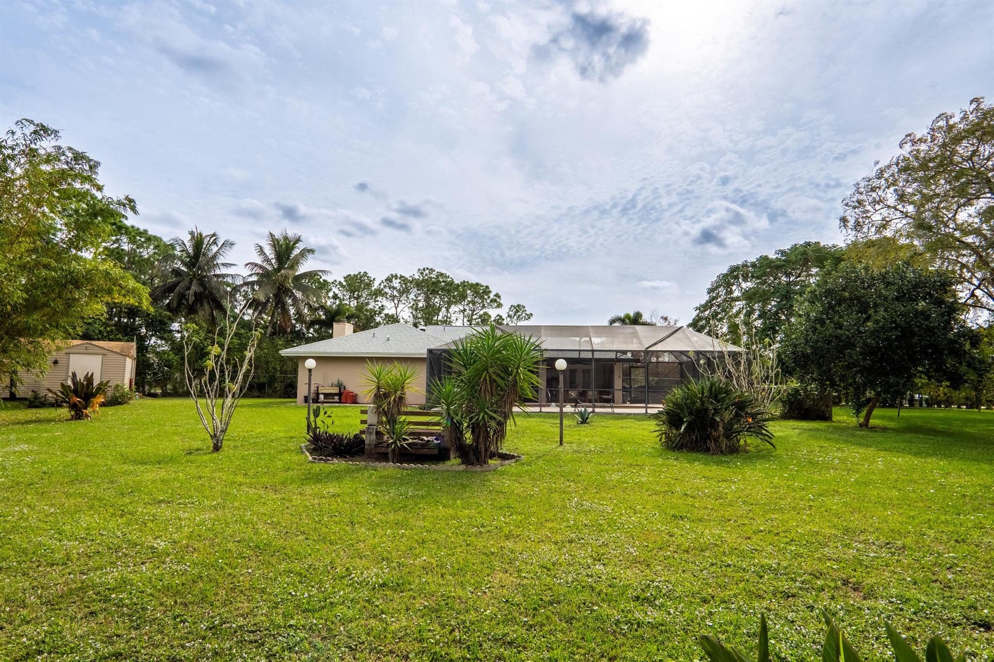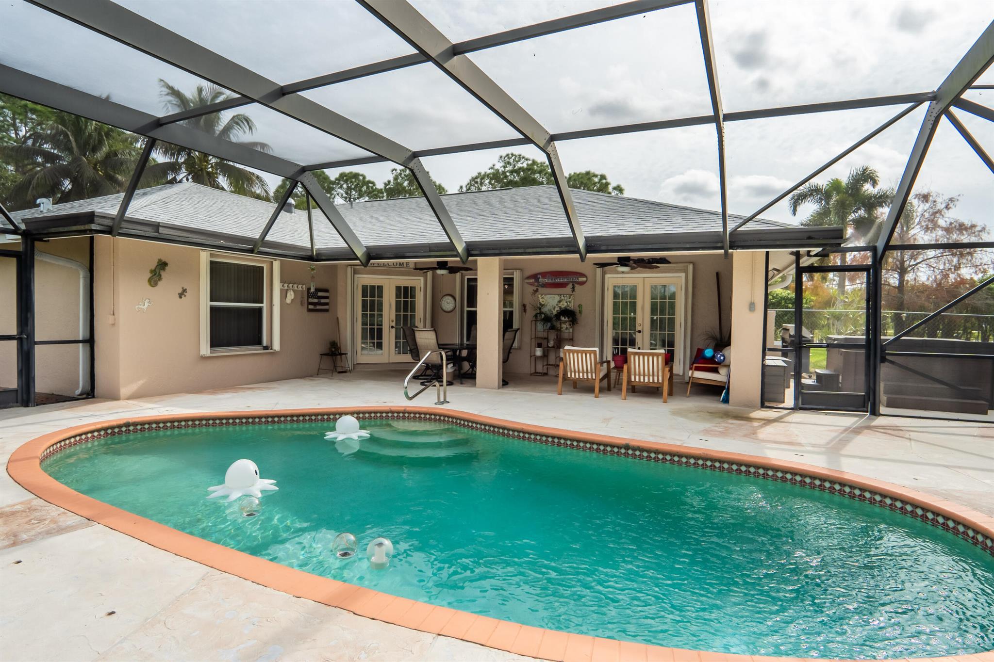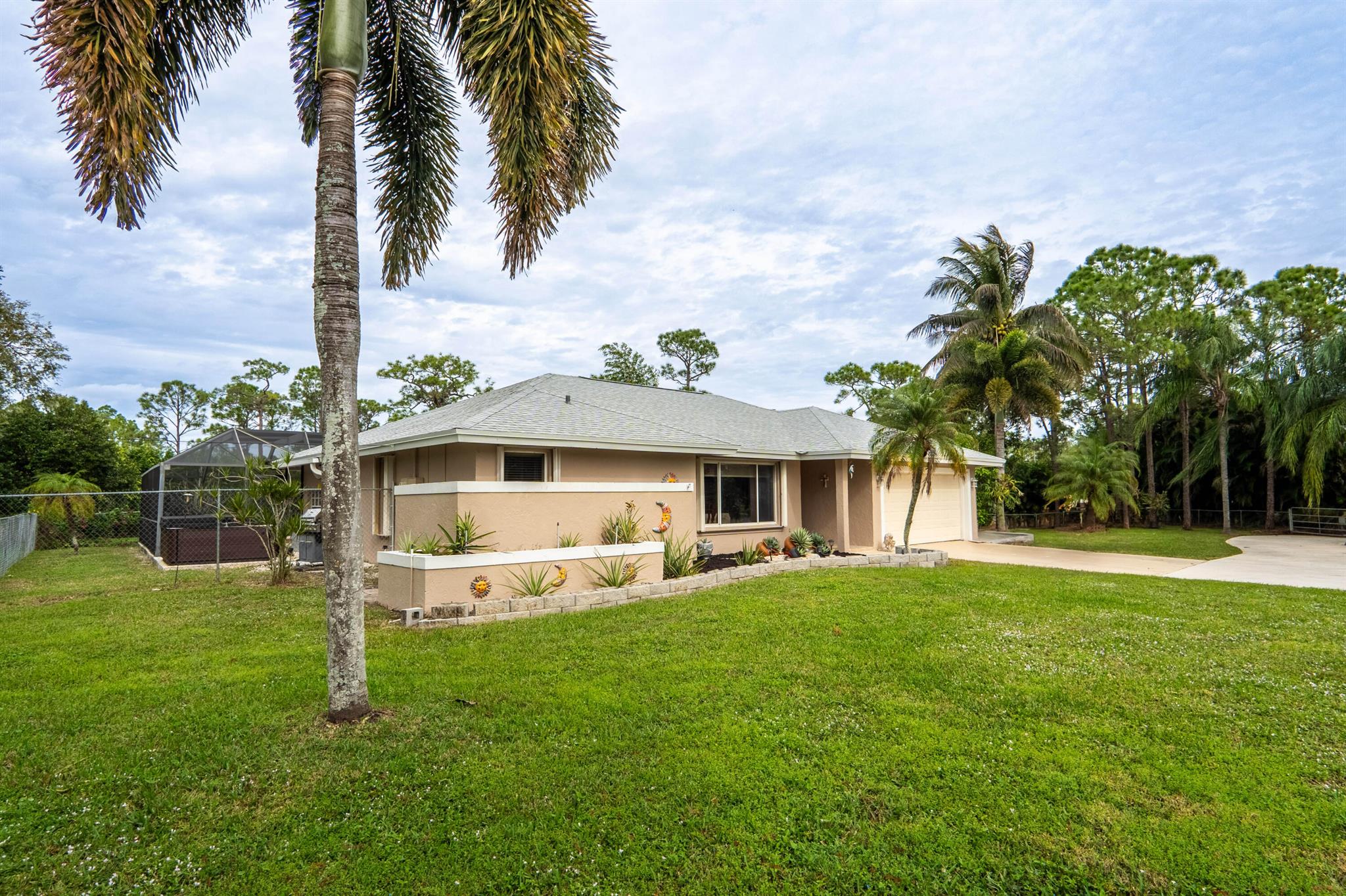 New roof August 2023! 3/2 with an attached two car garage, over 2000 sq. ft on 1.36 acres! Updated kitchen, flooring and master bath! Major systems, including the hot water heater, air handler, and water softener system, were all replaced in the last few years. Full accordion shutters Beautiful pool, spa and huge outdoor sitting area. Yard is fully fenced with a separate dog run, electric gate and TWO entrances! Huge circular drive for plenty of parking! Need even more storage? Shed has two sides: one for equipment and the other side is being used as a gym! Corner lot on a paved and dirt road. Fruit trees? So glad you asked! Featuring seven pineapple plants, two mango avocado. banana,and guava trees and an orchid garden! Privacy, space and beauty all in one place! This IS Loxahatchee