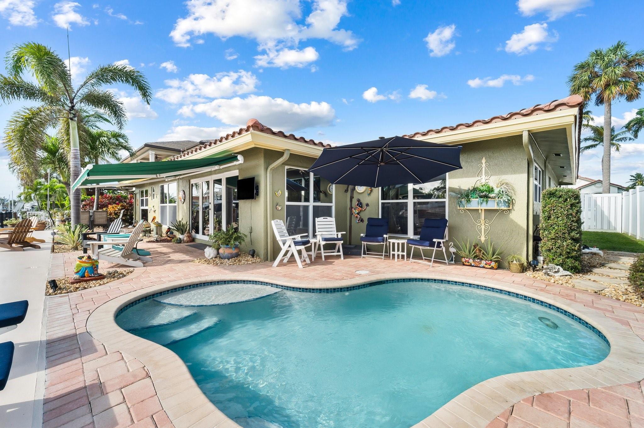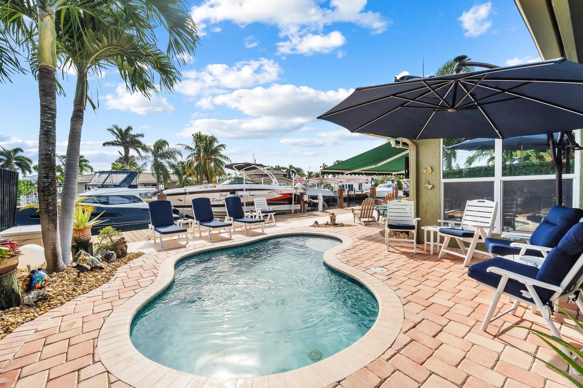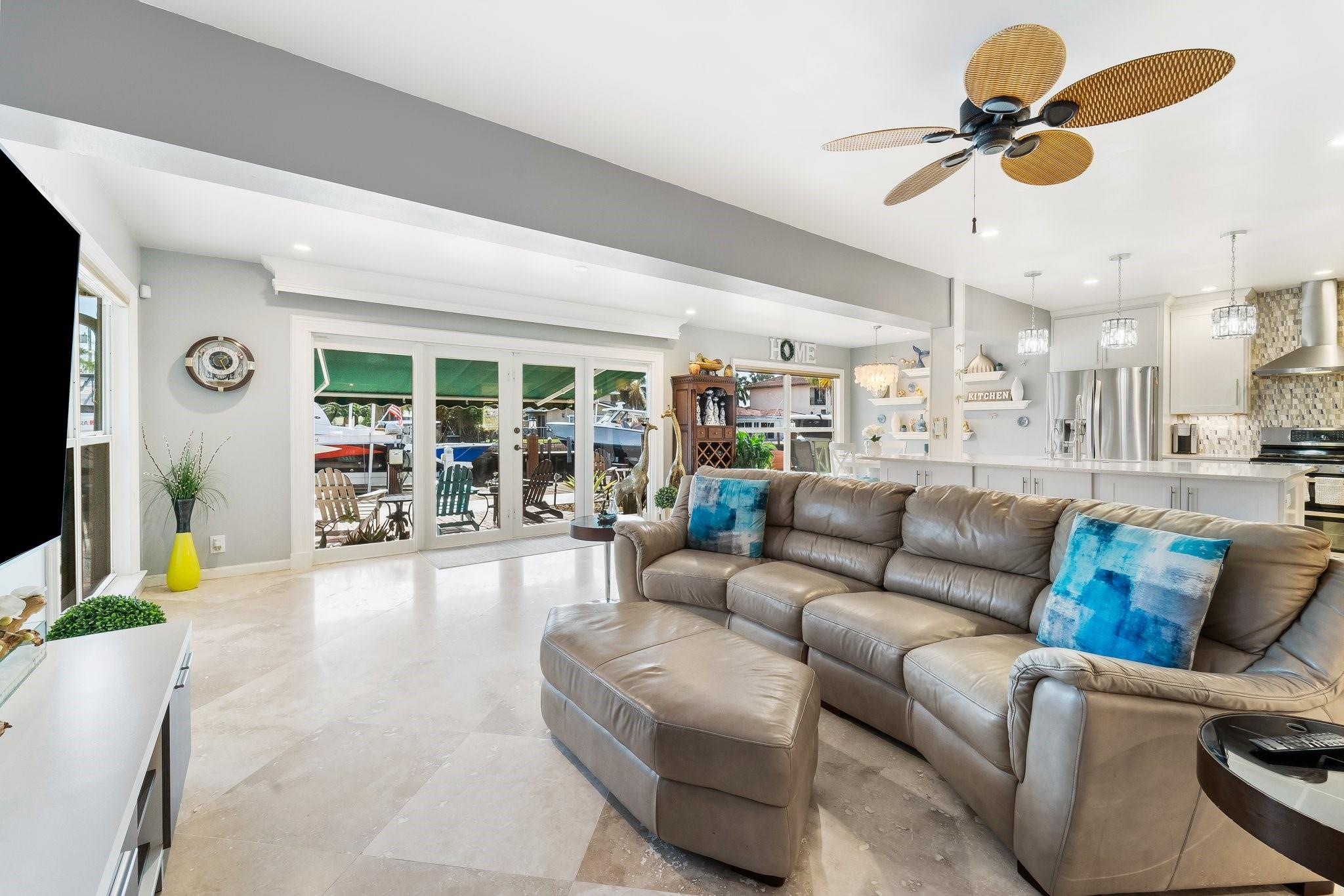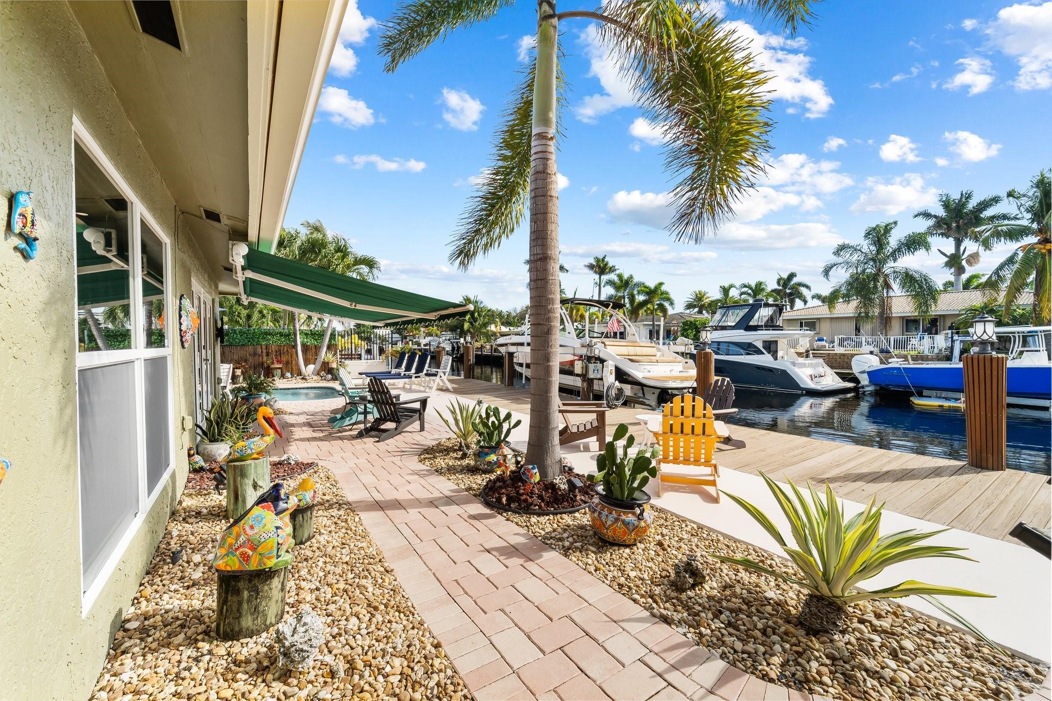 Boaters - Deepwater-No fixed bridges! 2408 sq. ft. 3/2 renovated decorator pool home with 75' on the water. Seawall reinforced with 2 feet of additional height and width. Shows beautifully with remodeled bakers kitchen, dining, living room, breakfast, bathrooms, bedrooms and entertainment areas. Reverse osmosis water purification system. Natural gas inside and out.. Full Impact glass and tile roof. Circular paver driveway with additional parking. Newer dock with reinforced pylons and 13k lb boat lift. Heated salt water pool on the patio with retractable sun shades front and back. 22kw generator and additional storage sheds. Epoxy floor in the garage. Click on the the drone video of the area.