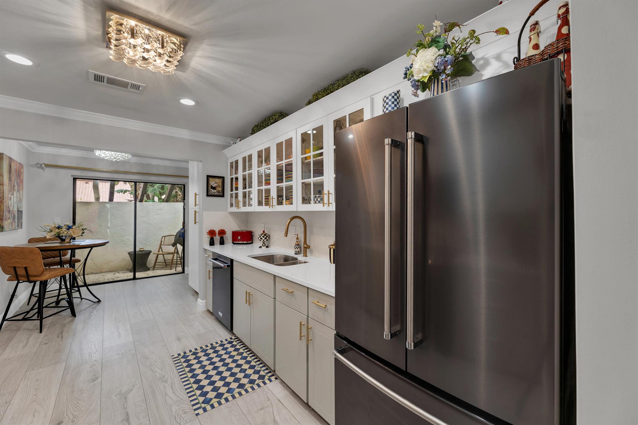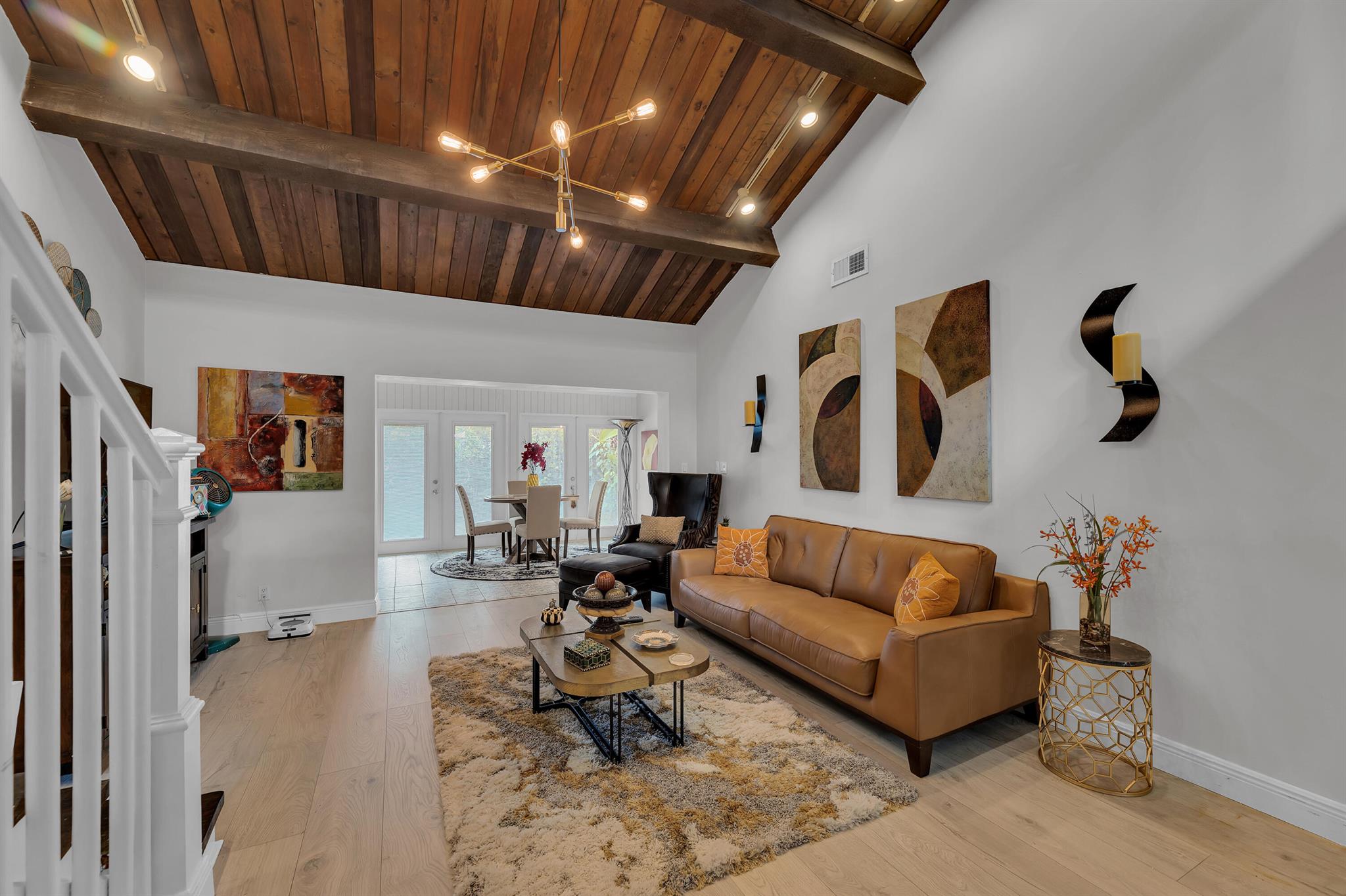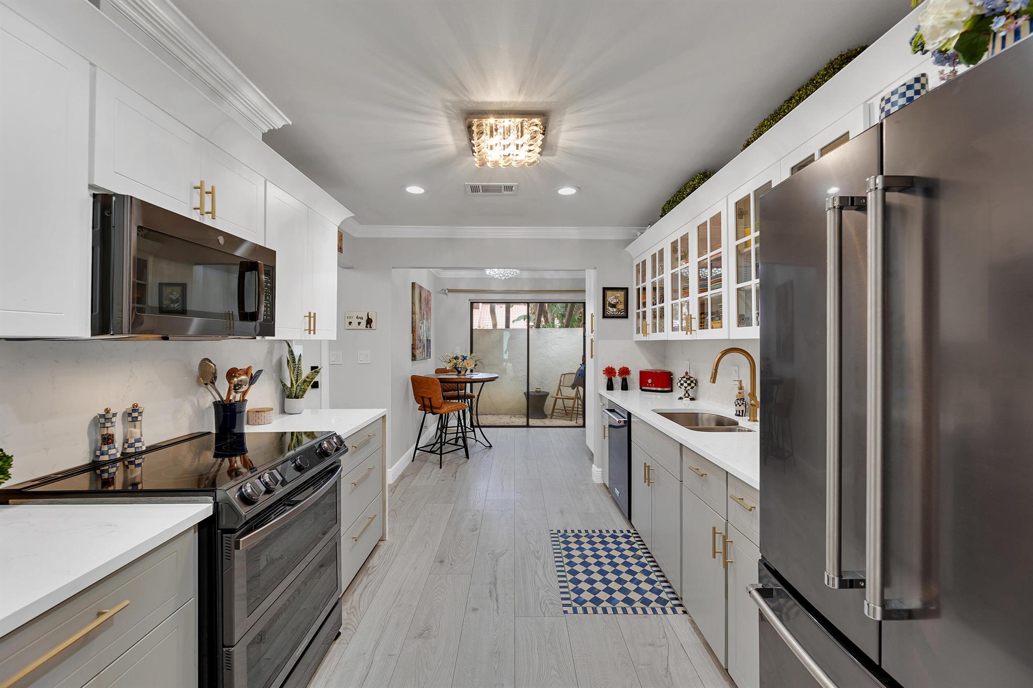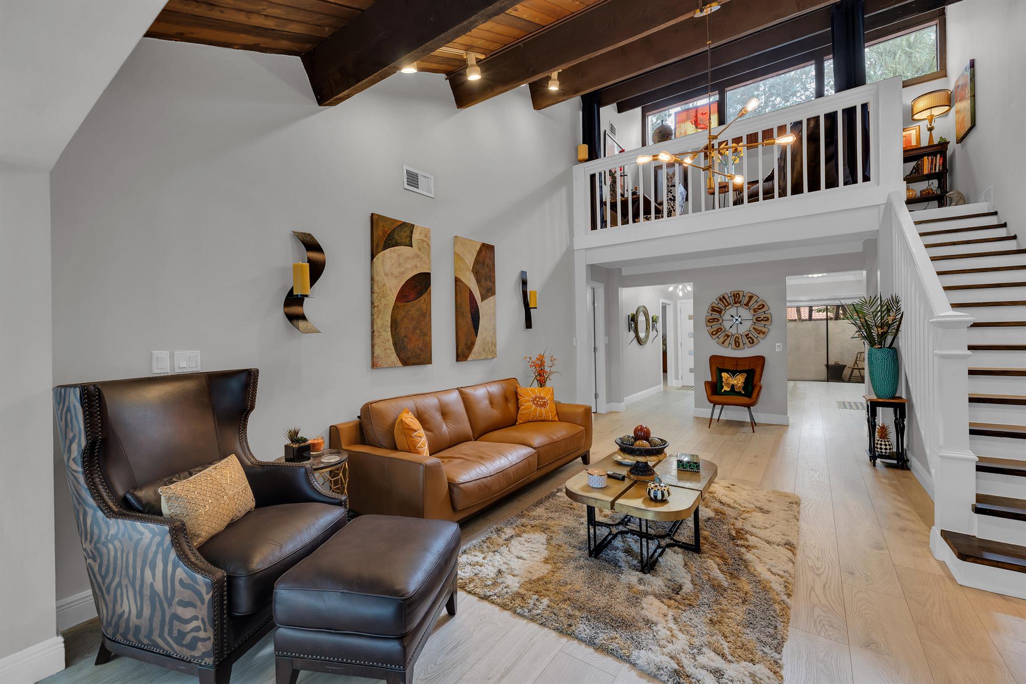 Remodeled 2 Bed/ 2 Bath with an upstairs loft that can be enclosed for a 3rd bed rm. Updated contemporary kitchen with new appliances, white granite quartz counter tops, wood cabinets. A/C replaced 2020. Water heater 2 years old. Crown molding and waterproof laminate floors thru out the whole TH. A/C Porch completely enclosed with French doors. Opened extended patio with pavers. Vaulted wood ceilings and beams. Large master bedroom. Large walk in closet. Updated master bath with 2 dual sinks. Very close to the community pool. Low HOA fee. Very private back yard