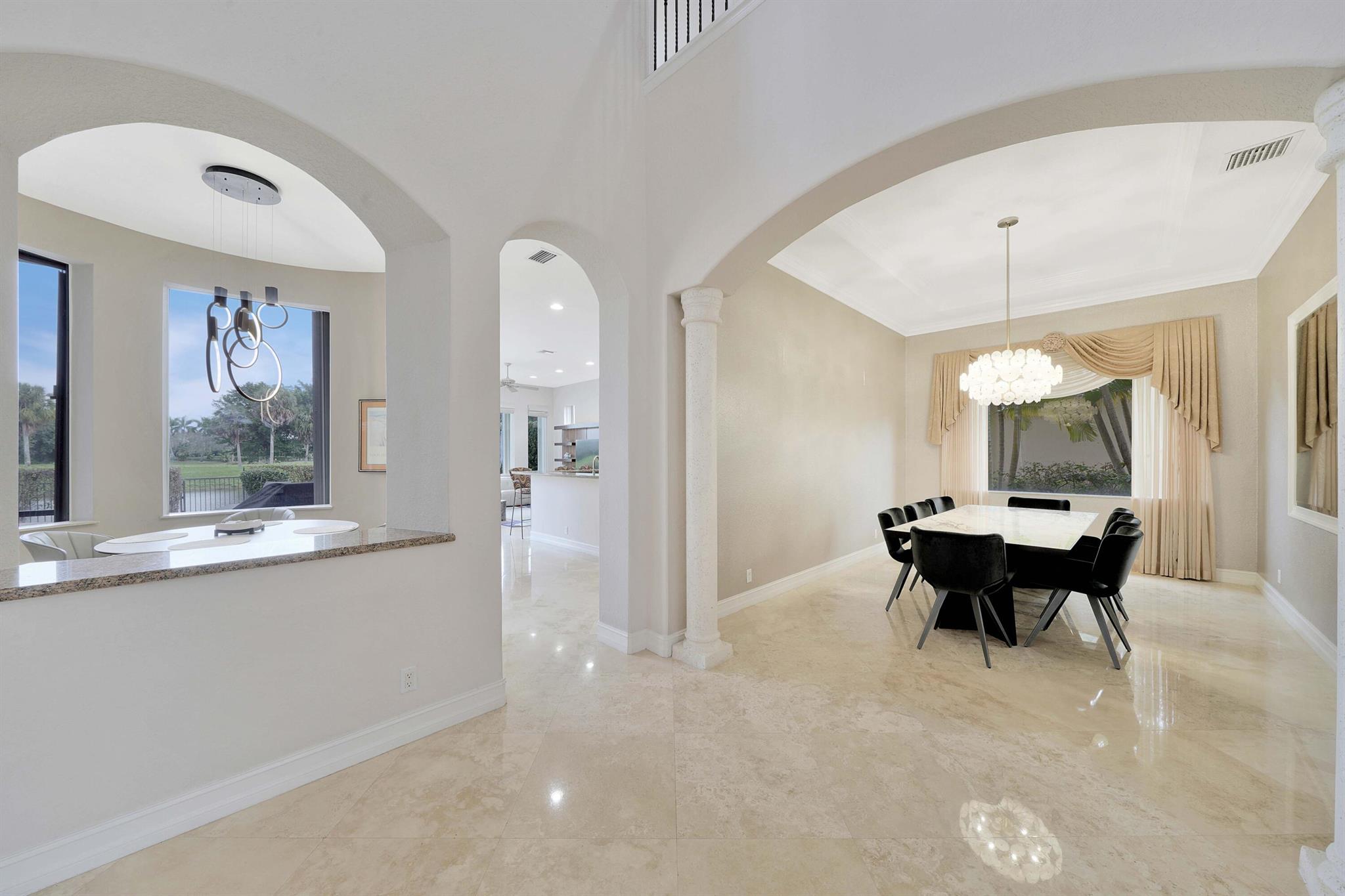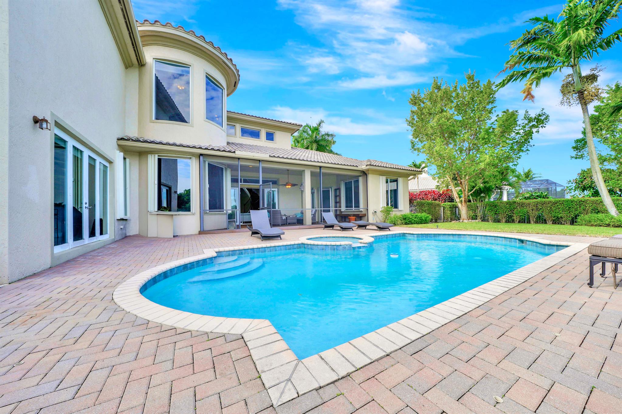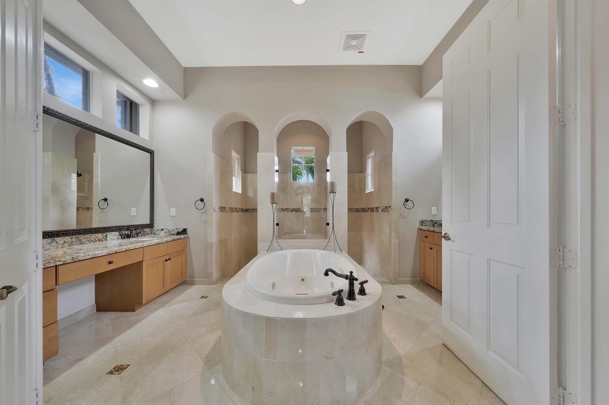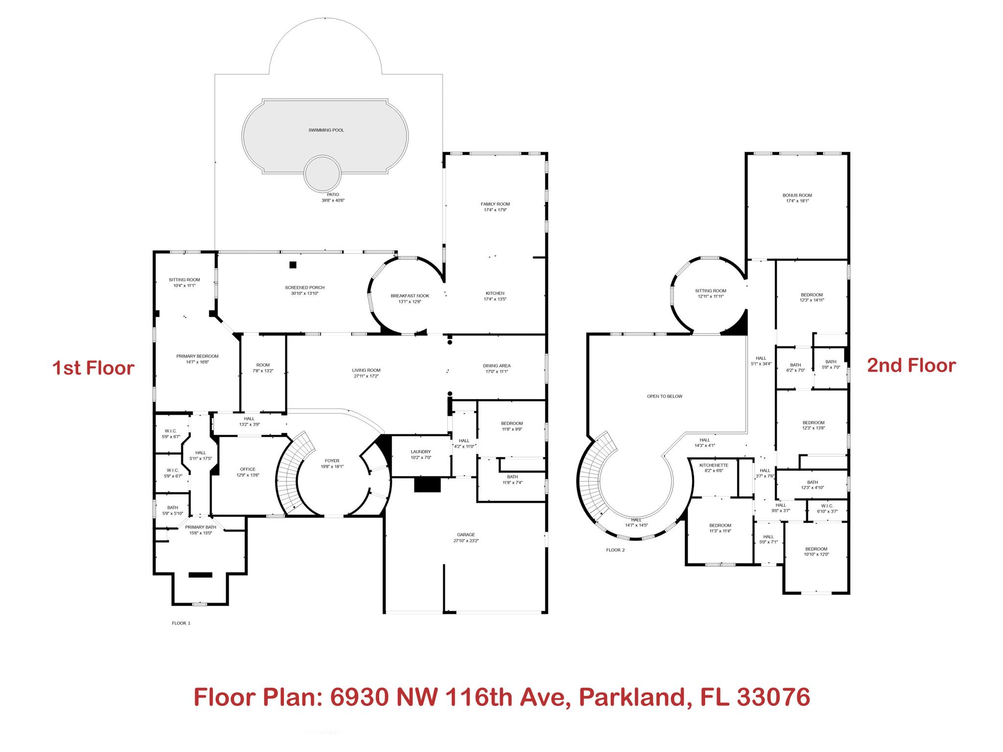 This lavish residence features 6 bedrooms, an office, and a game room, showcasing Italian marble floors in the first-floor living areas and Brazilian cherry wood in all bedrooms and on the second floor. The kitchen is a culinary haven, equipped with top-of-the-line appliances, granite counters, and elegant wood cabinets. The expansive primary suite on the first floor includes a cozy sitting area, complemented by an additional office on the same level. Upstairs, discover 4 bedrooms, including a versatile bedroom or maid/ in-law suite complete with a full mini kitchen. Outside, a fenced-in yard beckons with a sparkling pool and spa, offering a serene lake view. Heron Bay community has two clubhouses with all the amenities you can think of