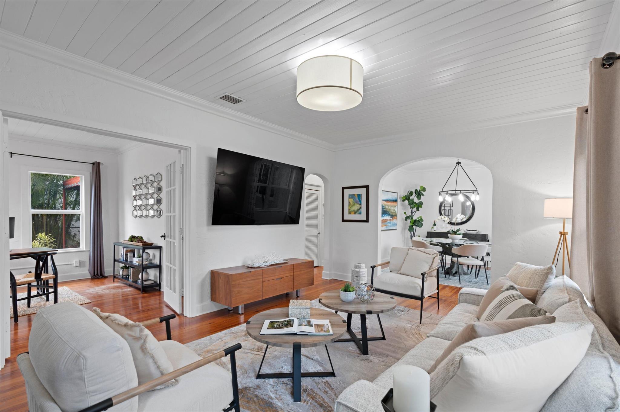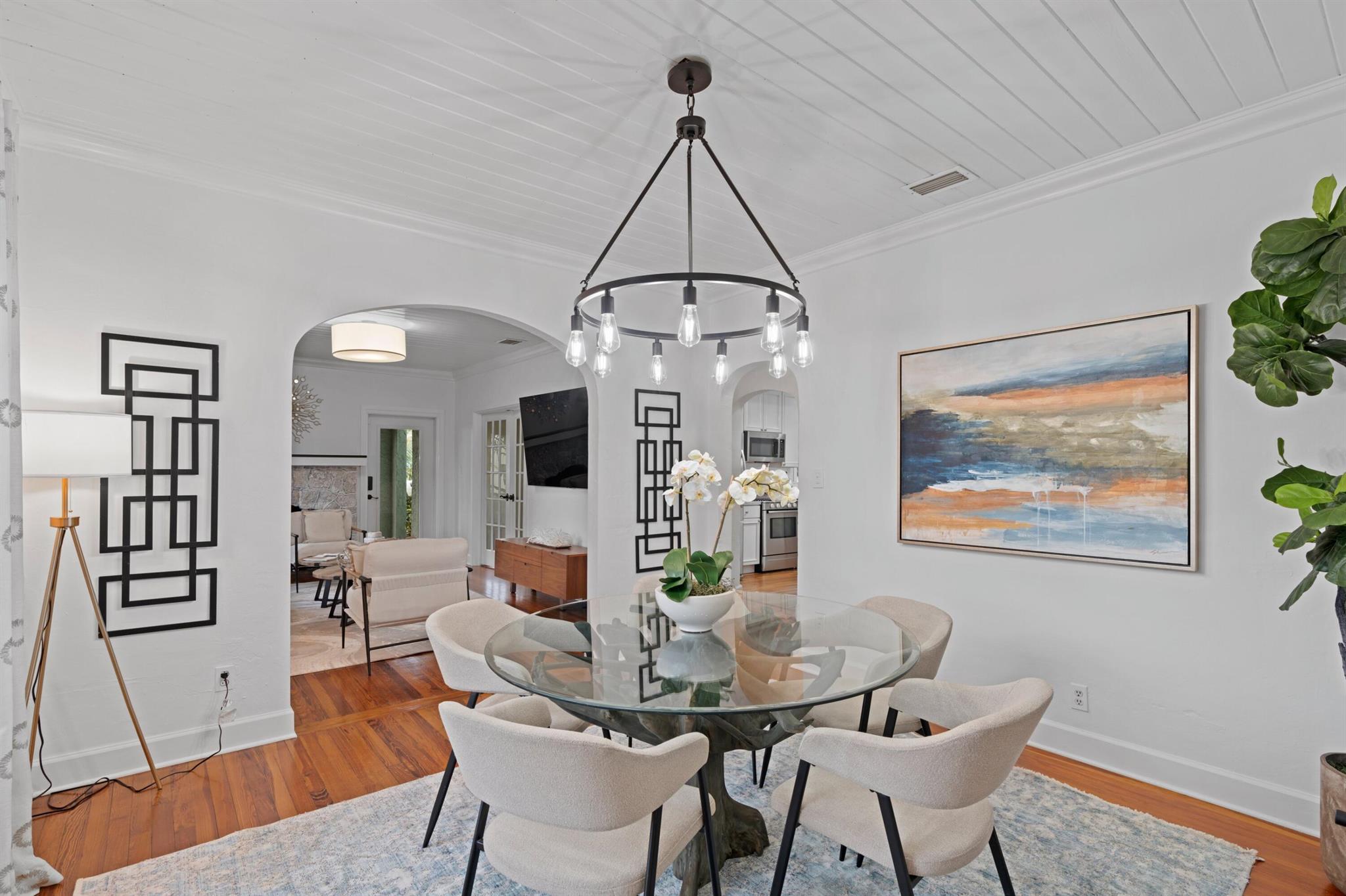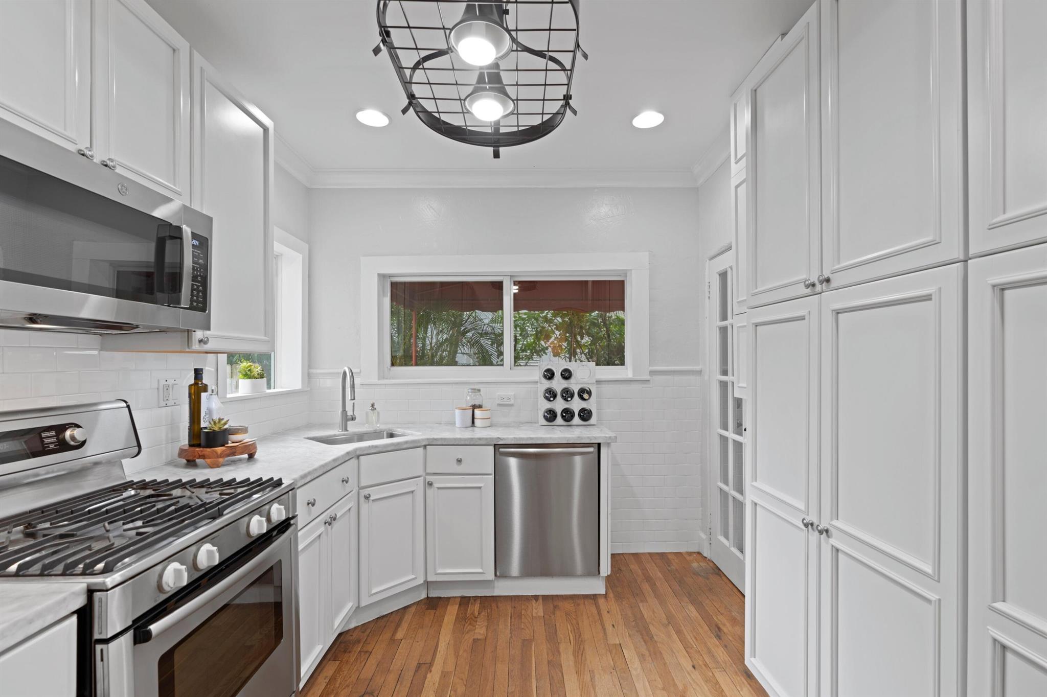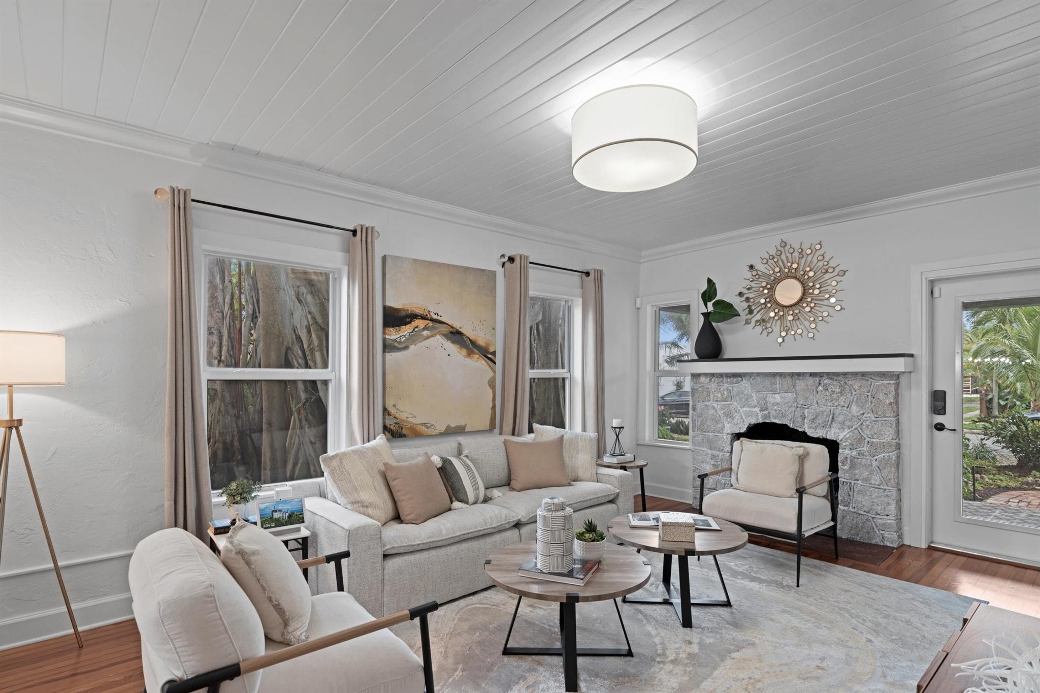 Discover an updated, charming Spanish-style villa on an oversized lot 100 by 100 double lot in beautiful Sunshine Park. This 3BR/2BTH home, canopied by the most gorgeous Banyan tree with an endless meandering garden, exudes charm and warm character. Updated and renovated inside, you'll be greeted by a spacious living room with fireplace and original hardwood floors. Flow through the space to a gracious formal dining room. The kitchen is elegant with marble countertops, gas range, and white shaker cabinets. The primary bedroom boasts garden views and a completely new en-suite bath, renovated in 2022. A front den/office can serve as an additional bedroom. The home also has impact glass doors and windows. Explore outside on Chicago brick paths and patios which create a serene oasis.