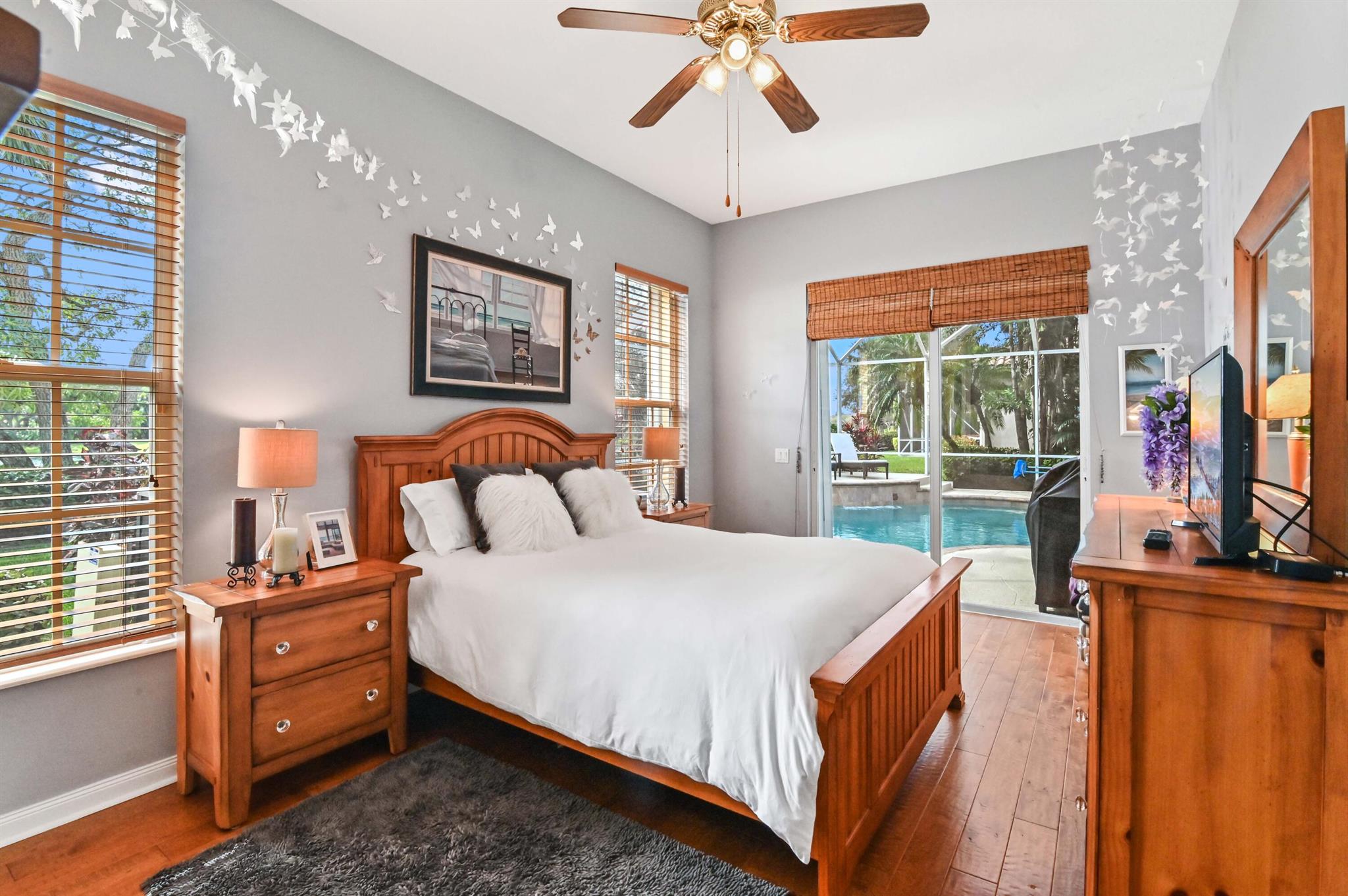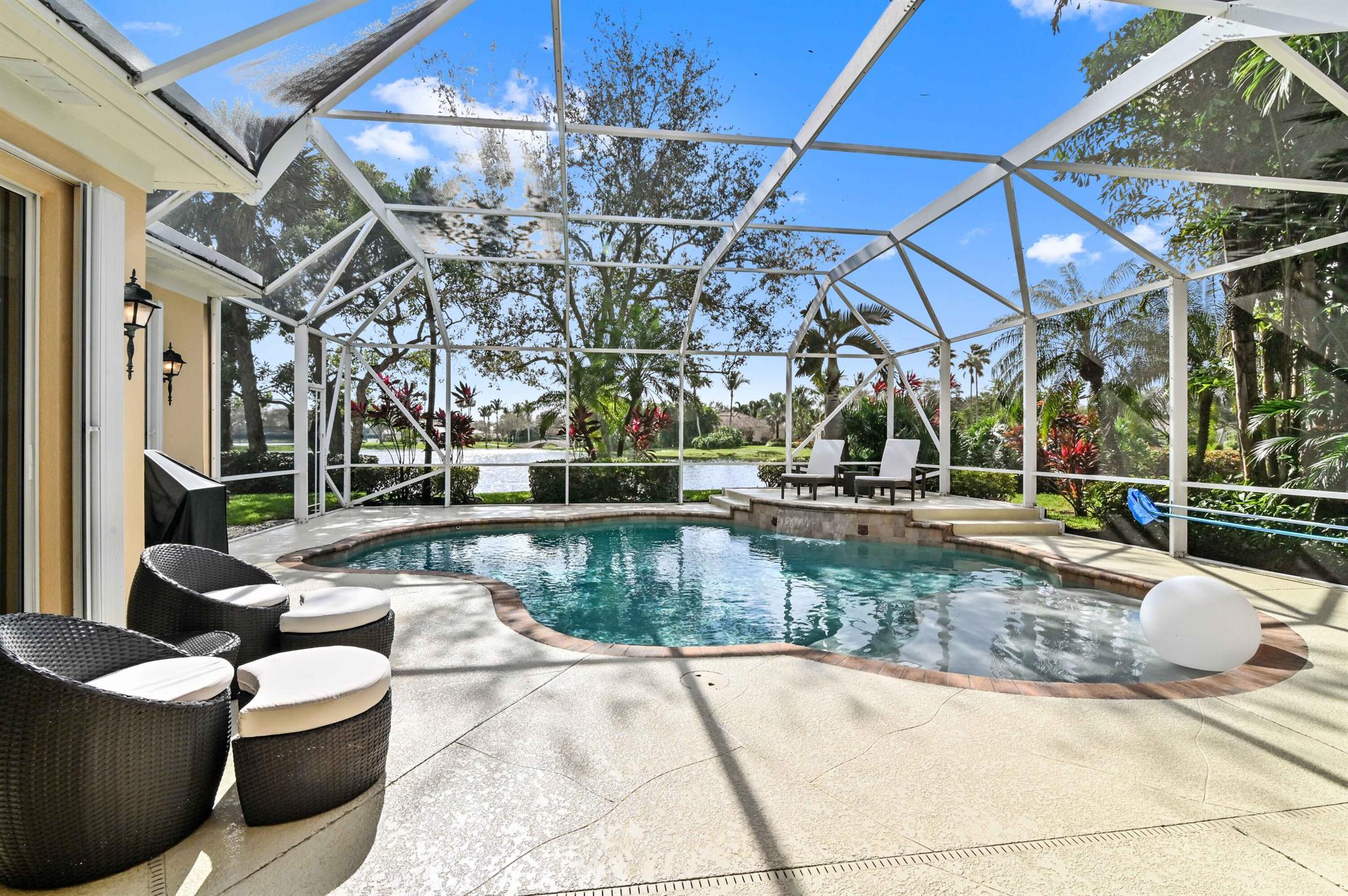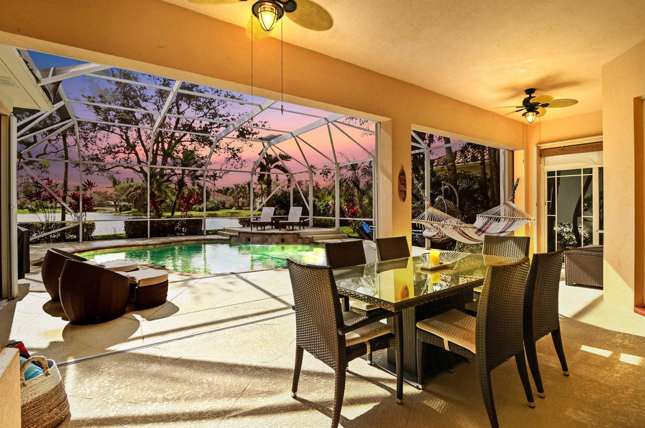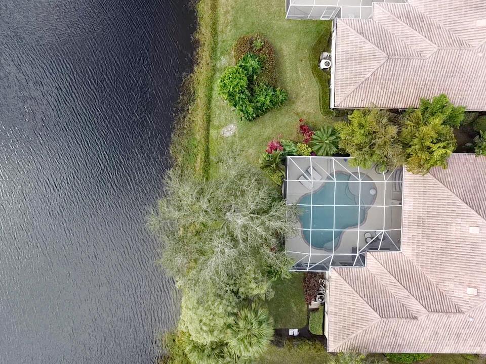 Welcome to this stunning 1-story Windsor Model single-family home in the exclusive gated community of Riverwalk. This home boasts 5 bedrooms, 3 bathrooms, open layout with vaulted ceilings, & a breathtaking backyard complete with a screened in resort style salt water pool & the best lake views in the neighborhood. Upon arrival, the property, located on a quiet cul de sac, welcomes you with pristine landscaping, up-lighting, a 2-car attached garage and a charming front screened porch, creating a warm and inviting atmosphere. As you step inside, the view through the living room impresses with sliding door access to the screened patio and pool overlooking the lake, seamlessly blending indoor and outdoor living....