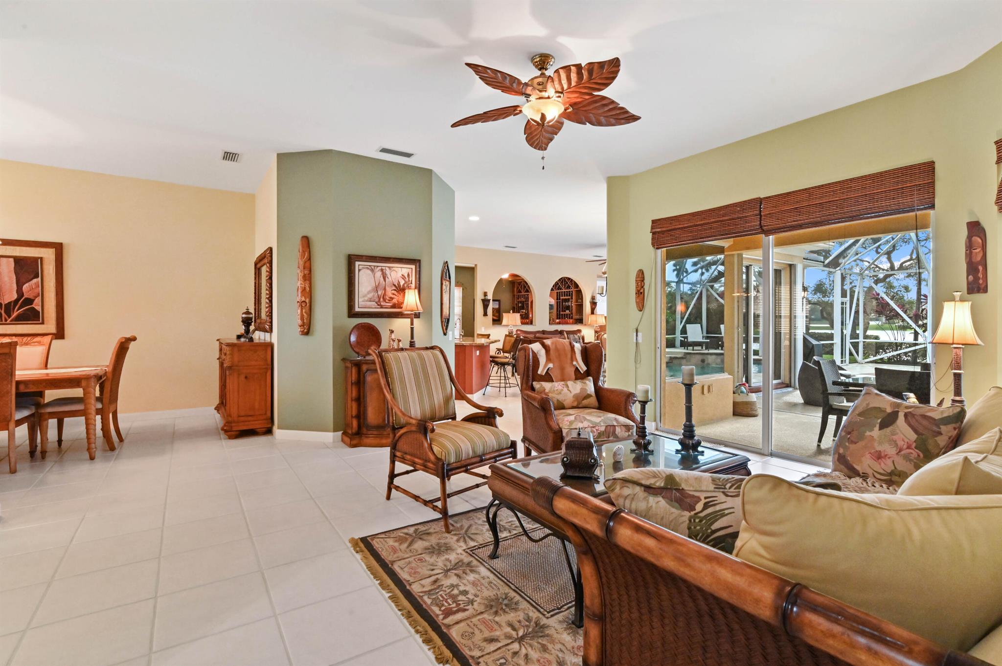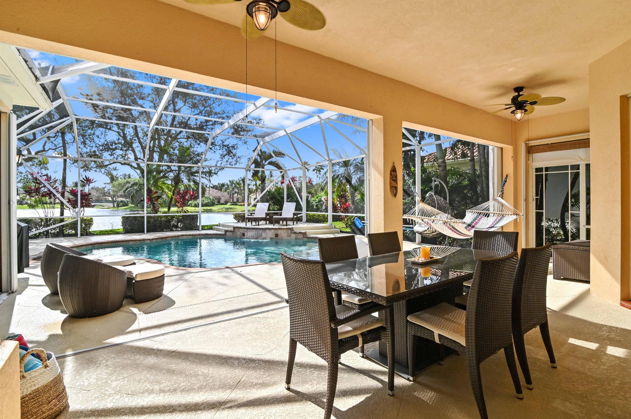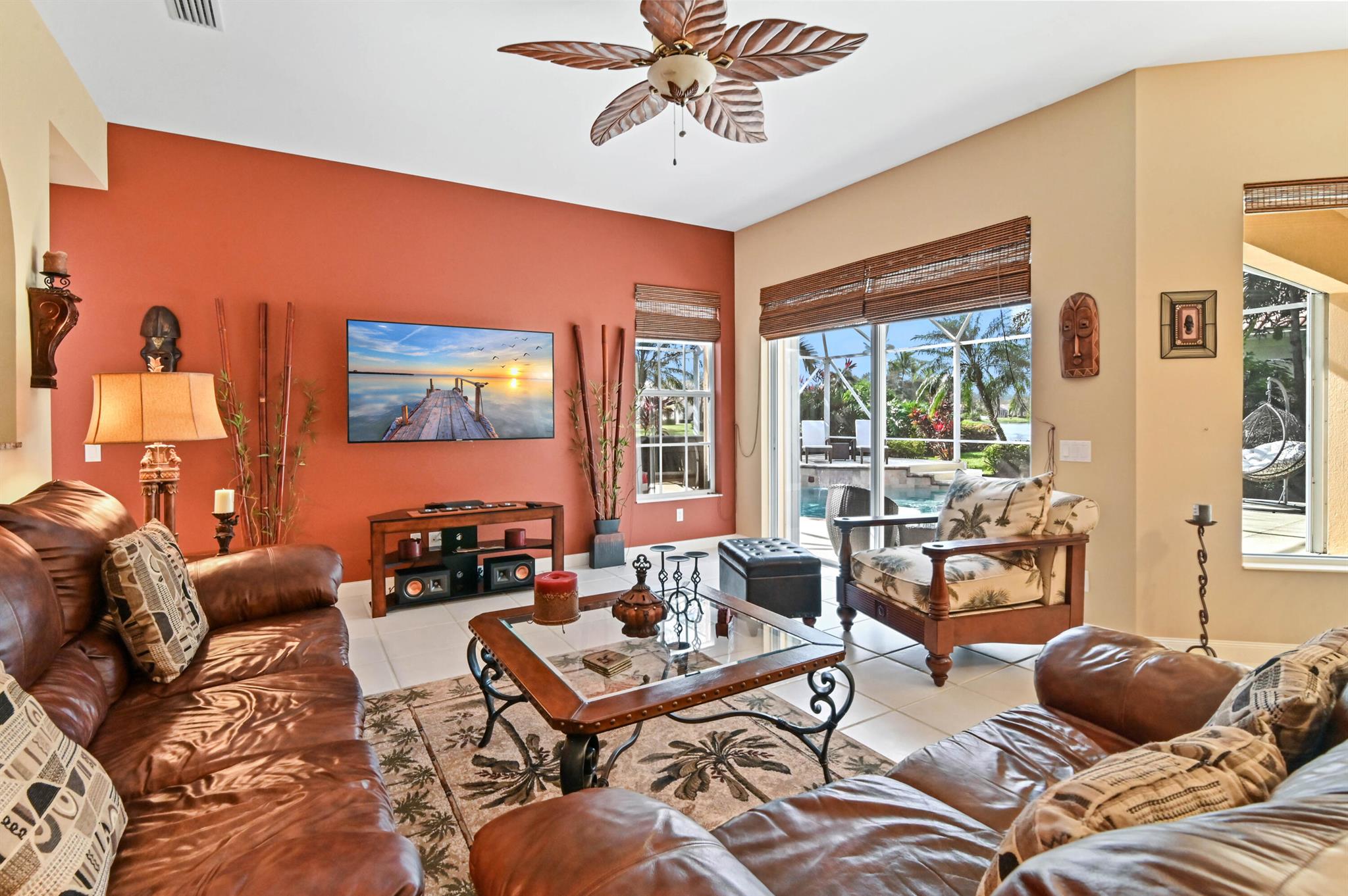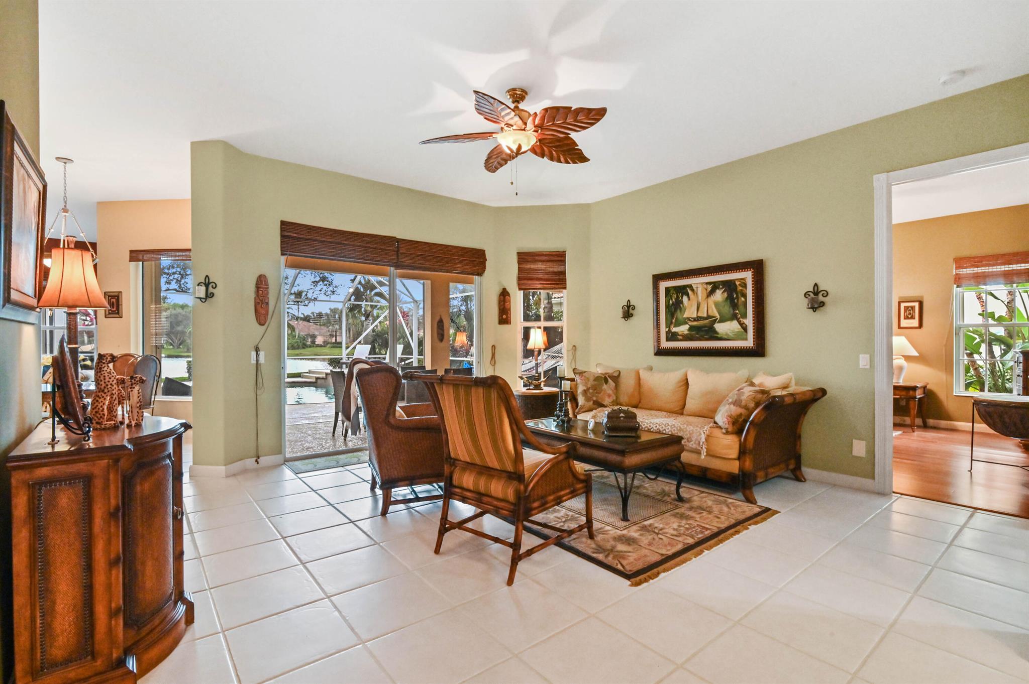 Welcome to this stunning 1-story Windsor Model single-family home in the exclusive gated community of Riverwalk. This home boasts 5 bedrooms, 3 bathrooms, open layout with vaulted ceilings, & a breathtaking backyard complete with a screened in resort style salt water pool & the best lake views in the neighborhood. Upon arrival, the property, located on a quiet cul de sac, welcomes you with pristine landscaping, up-lighting, a 2-car attached garage and a charming front screened porch, creating a warm and inviting atmosphere. As you step inside, the view through the living room impresses with sliding door access to the screened patio and pool overlooking the lake, seamlessly blending indoor and outdoor living....
