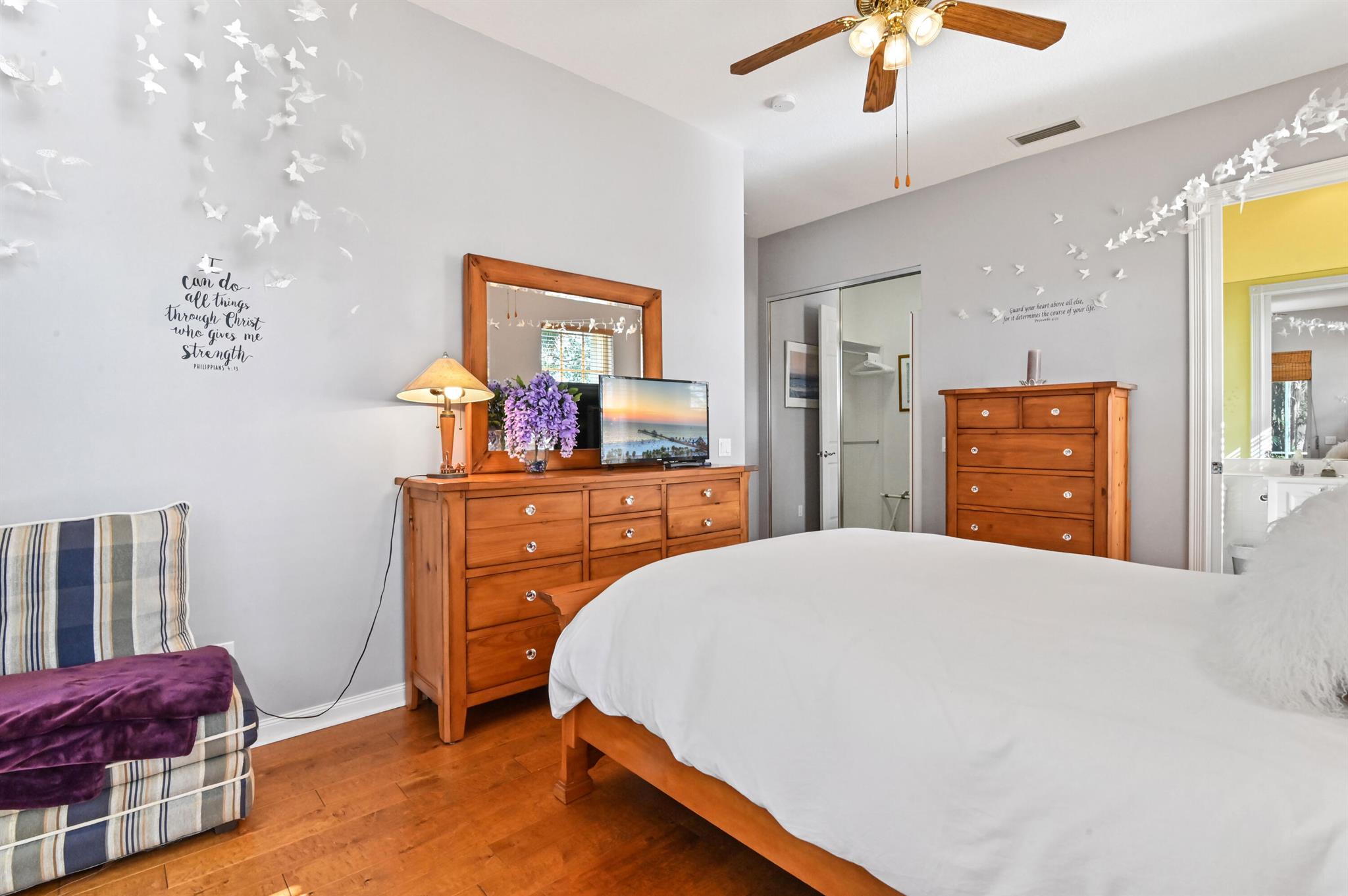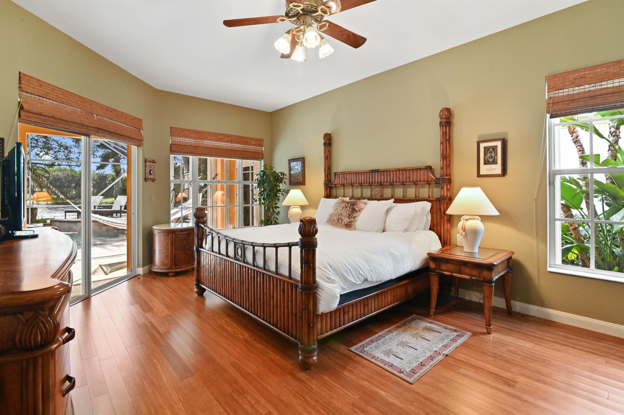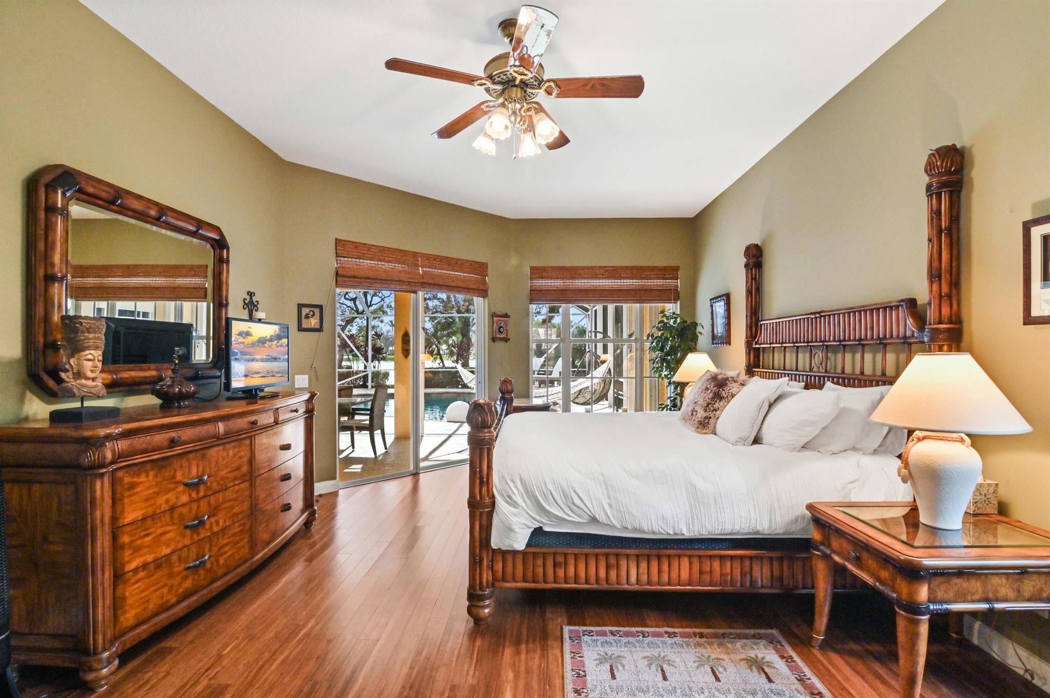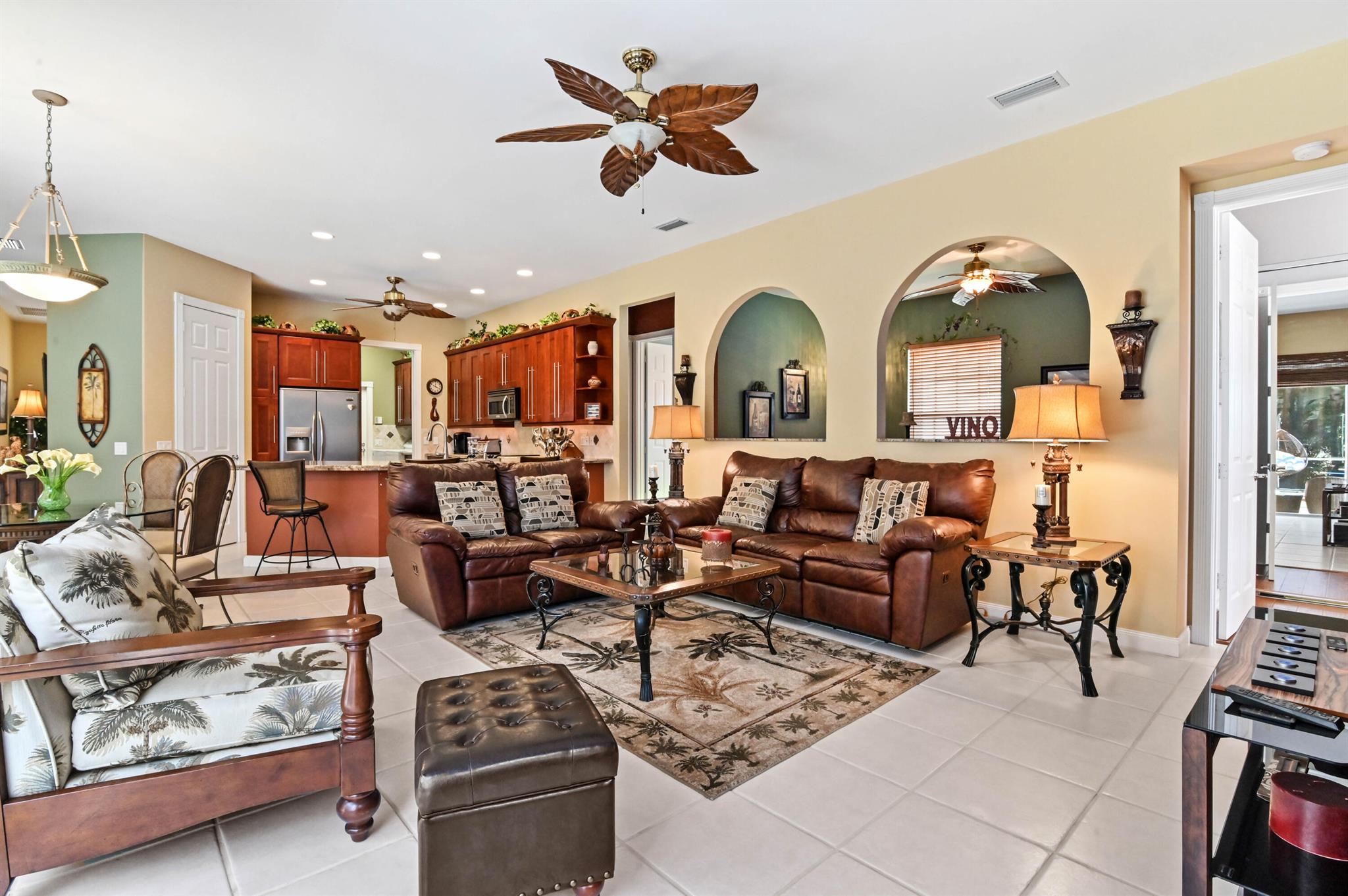 Welcome to this stunning 1-story Windsor Model single-family home in the exclusive gated community of Riverwalk. This home boasts 5 bedrooms, 3 bathrooms, open layout with vaulted ceilings, & a breathtaking backyard complete with a screened in resort style salt water pool & the best lake views in the neighborhood. Upon arrival, the property, located on a quiet cul de sac, welcomes you with pristine landscaping, up-lighting, a 2-car attached garage and a charming front screened porch, creating a warm and inviting atmosphere. As you step inside, the view through the living room impresses with sliding door access to the screened patio and pool overlooking the lake, seamlessly blending indoor and outdoor living....