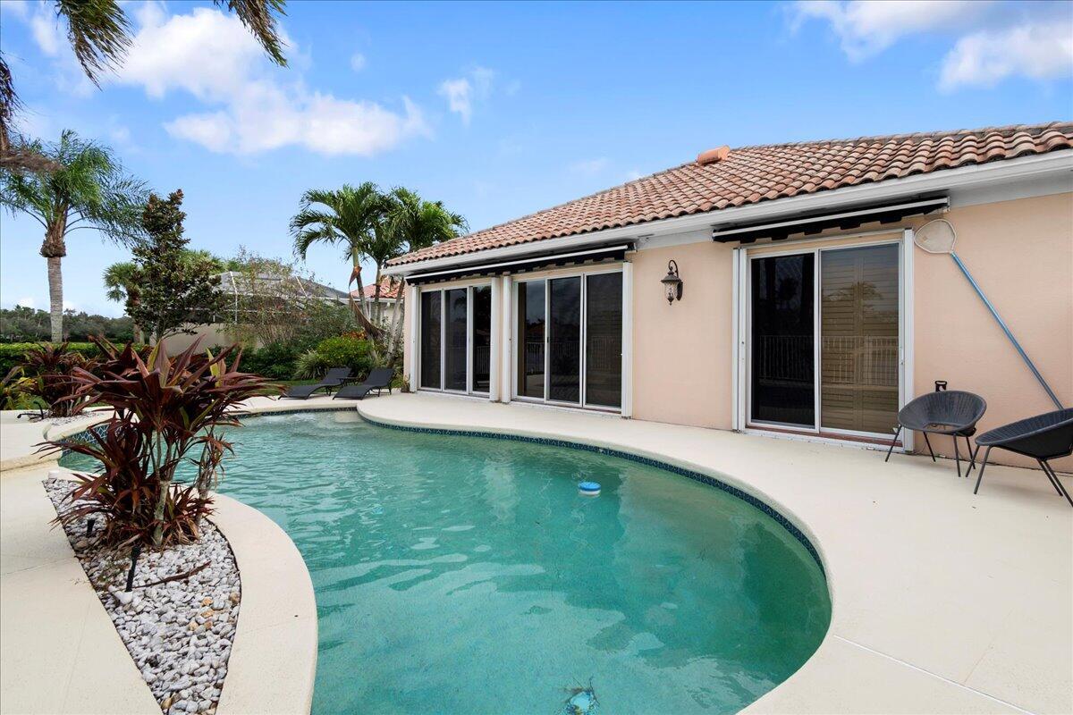 Exceptional gated Expanded Oakmont home in Riverwalk w extra long lake views on wide fenced lot. Hardly used well cared for home on best quiet lot location. Stunning entrance with high ceilings looks thru home to custom pool with spa jets and waterfall. Exotic landscaping surrounds the entire exterior of home. This spacious 3/3 with dbl doors to office can be used as 4th bedroom. Expanded model boasts additional living room and dining area open to kitchen. Custom exterior electric awnings across back of home. Updated plantation shutters on all doors and windows, fresh interior/exterior paint, new modern lighting and fans, custom entertainment center, spacious 2 car garage with built in cabinets.