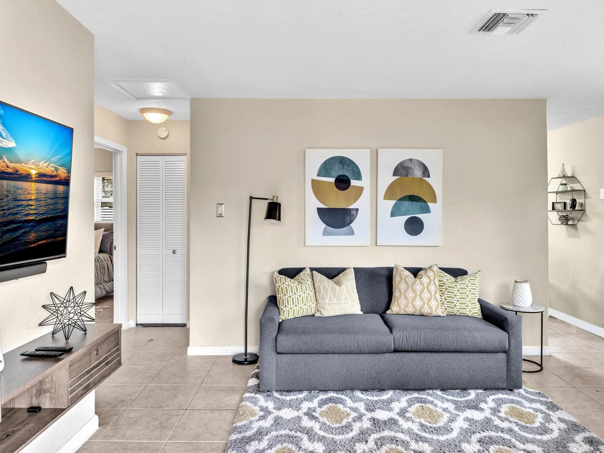 Charming updated 2-bedroom, 1-bathroom home featuring a stylish and bright, yet cozy living area. Enjoy outdoor living in a large manicured backyard with space perfect for entertaining, and even a pool. Curb appeal is enhanced by a welcoming front porch and updated landscaping. Accordion shutters provide storm-safety, and an attached utility room is available w/ washer/dryer hookup and room for storage. This home is the investment property for a budding investor, or the perfect starter home for those seeking low-maintenance residence with ample outdoor space on a corner lot in a family-friendly neighborhood.