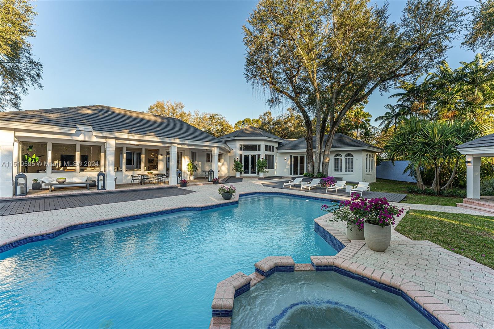 Recently renovated 7,167 SF residence in North Pinecrest, with 6-BD and 6.5-BA on an impressive 1.36-acre lot, surrounded by mature oak trees providing optimal privacy and seclusion. The home offers a spacious layout with volume ceilings, two family rooms, and marble and wood flooring throughout. An expansive updated gourmet kitchen boasts ample counter space, quartz countertops, a large center island, walk-in pantry, and all-new appliances. The backyard retreat features a covered terrace, tennis court, pool cabana with a built-in grill and gas range, and a sparkling pool with a waterfall jacuzzi. Additional features include renovated bathrooms, new interior doors, 3 AC units, flat tile roof, 3-car garage, and a whole-house generator.