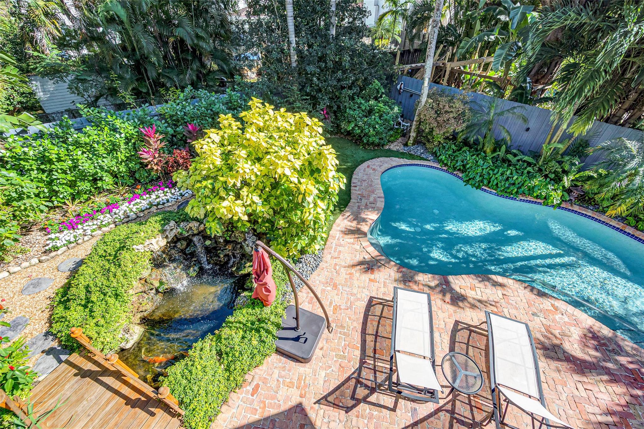 On a lovely residential street in Victoria Park, this home has a fabulous floor plan with high ceilings, spacious rooms, charming dormer bedrooms, a brand new eat-in kitchen and an entry level bedroom. The wide foyer entry flows through to a roofed patio and picturesque gardens featuring a waterfall, pond with a foot bridge and flowering tropicals surrounding a free form pool. A family room and formal dining room both open to the rear yard. Upstairs is an impressive primary suite and nearly as luxurious VIP suite both with generous closet space and high ceilings. The newly refinished two bay garage is attached. A deep brick paved driveway allows ample parking for your guests. Holiday Park is two blocks away. Multiple quality food markets, restaurants, parks and the beach are nearby.