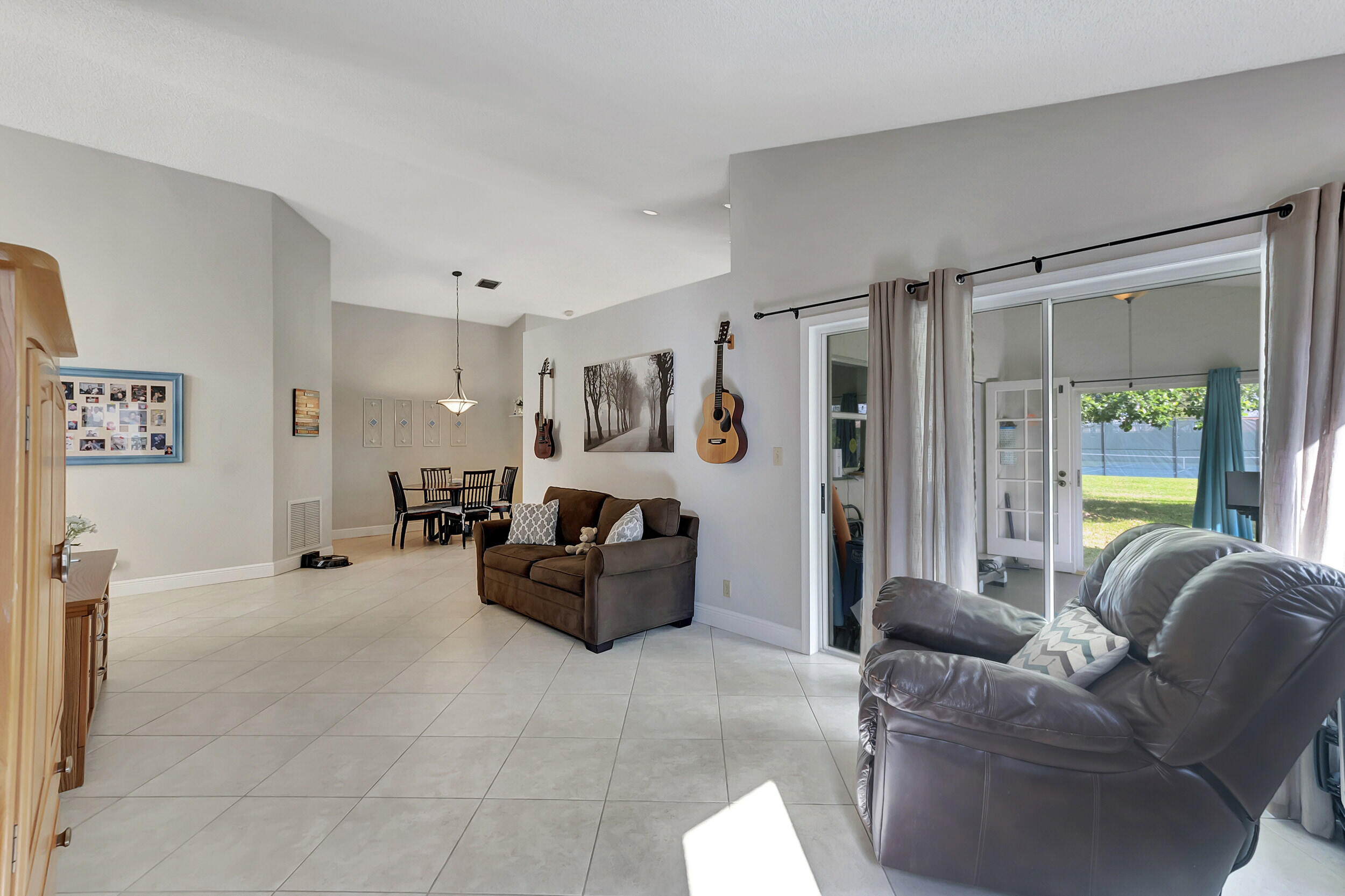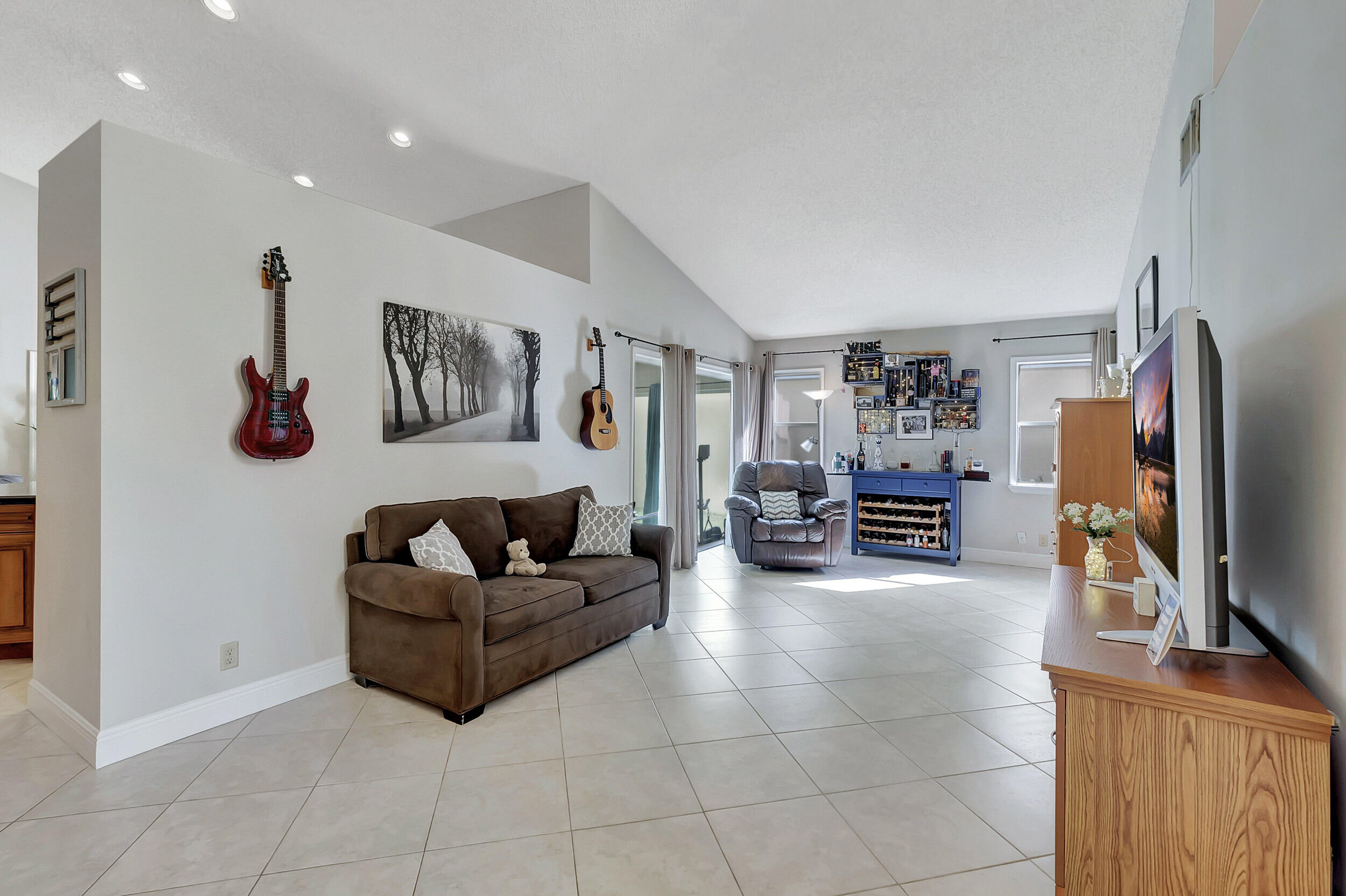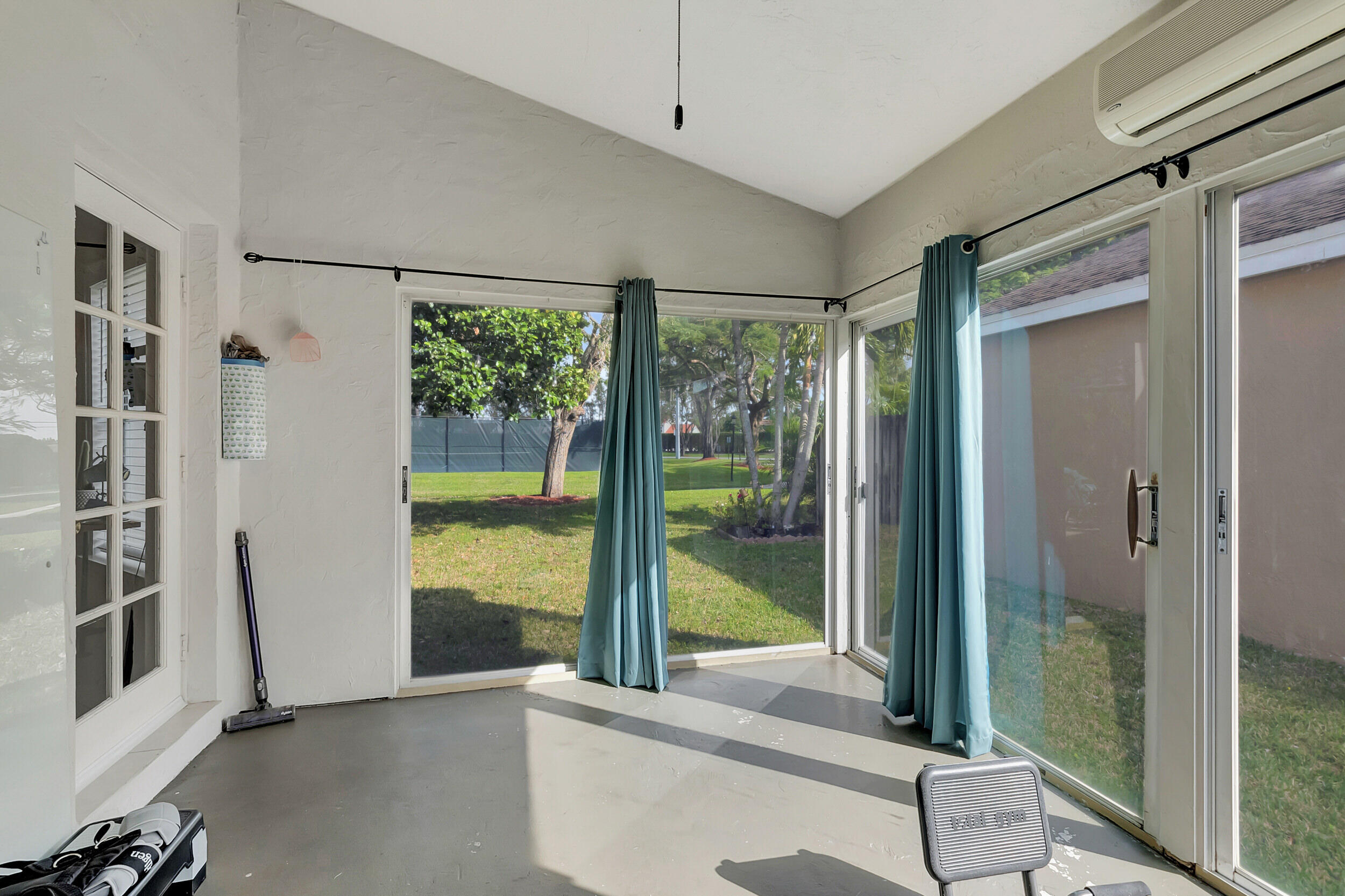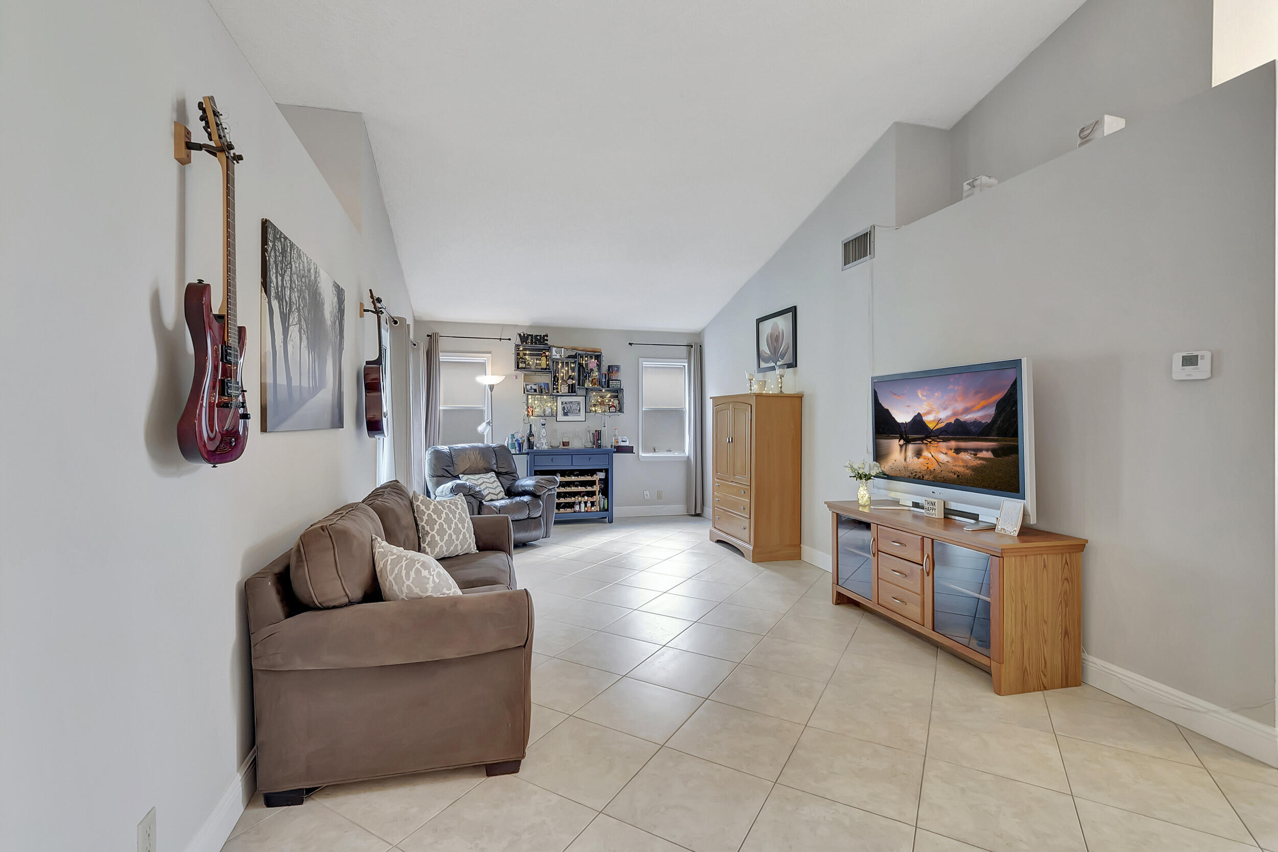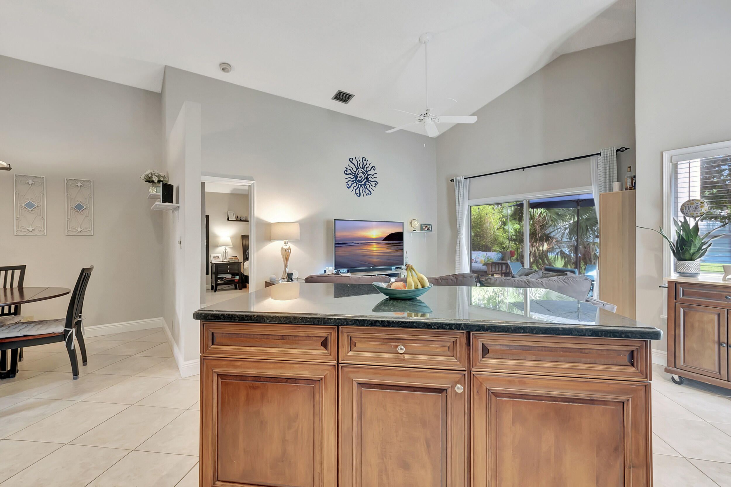 New Roof August 2022! 3/2 One Level home with spilt floorplan Great view of the community center with a tropical feel and No Back neighbors!Wall-to-wall tile in main area and laminate in the bedrooms...No carpets here! Volume ceilings creates a spacious environment Beautifully updated Master bath with a spa like feel. Updated kitchen with custom wood cabinets, granite and stainless appliances. AC installed in 2019.Enclosed Air-conditioned Florida room with Permit can be office, gym or makes a great playroom! Low HOA FEE!!! Includes Community Pool, baby pool, tot lot playground, basketball, racquet ball, tennis and pickleball. Cable with recording, voice cpmmand,3 boxes Fiber optic Wi-Fi Roving security guard. Streetlight and sidewalks thru-out neighborhood for biking and walking safet