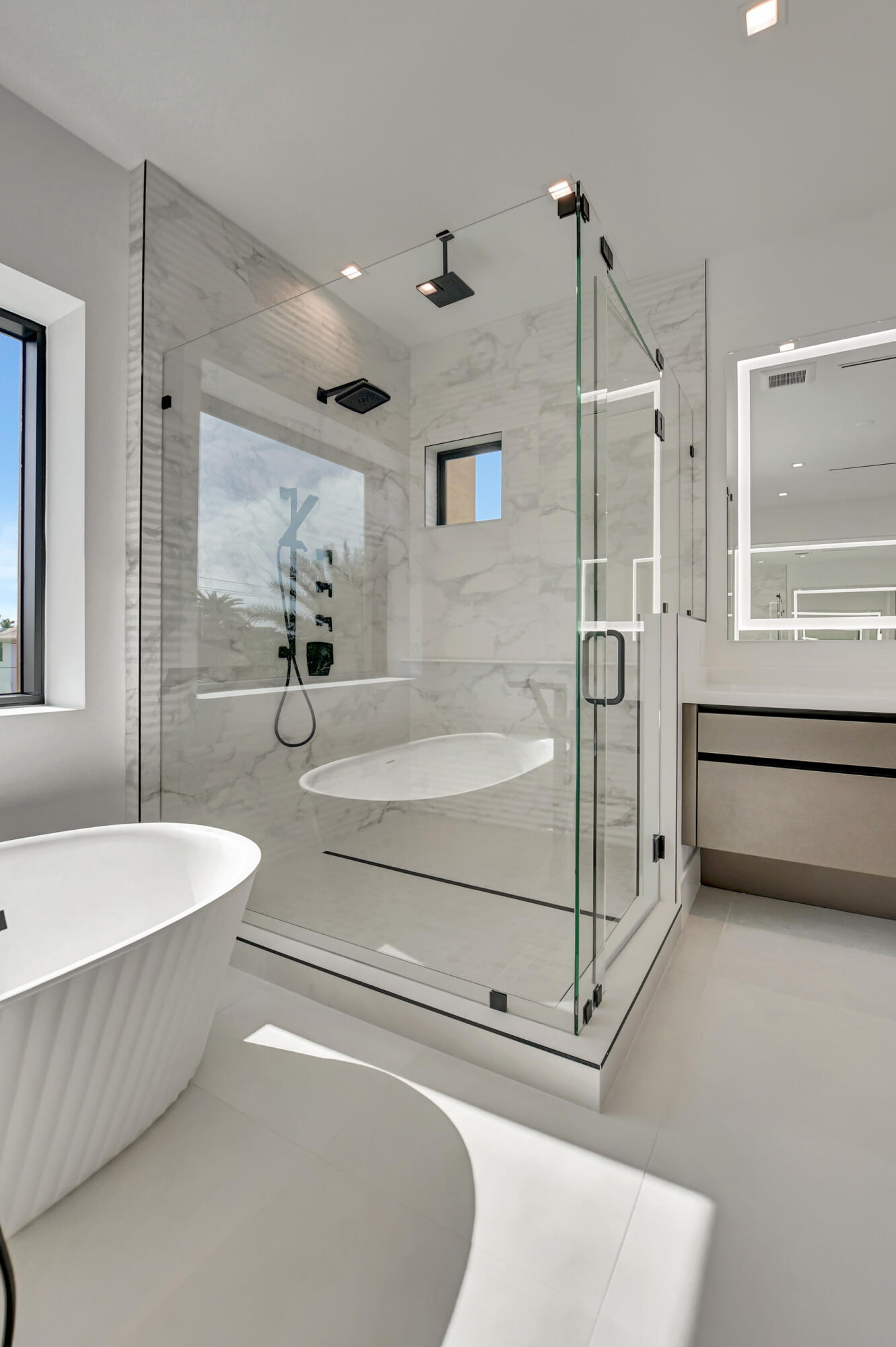 Bring Your Yacht and walk to the beach at this brand new No Fixed Bridge Lake Rogers Isle Deepwater estate. This Luxury New Construction home encompasses unparalleled features, expertly crafted by Elysee Homes, one of Boca Raton's premier custom builders. The residence boasts a resort-style pool deck, a concrete dock perfect for yacht enthusiasts, and full summer kitchen. Enjoy the ultimate comfort with his and her master suites, complemented by a full house generator, elevator, and a natural gas meter. The property's unique appeal extends to its large turn basin, providing convenient boat maneuvering.