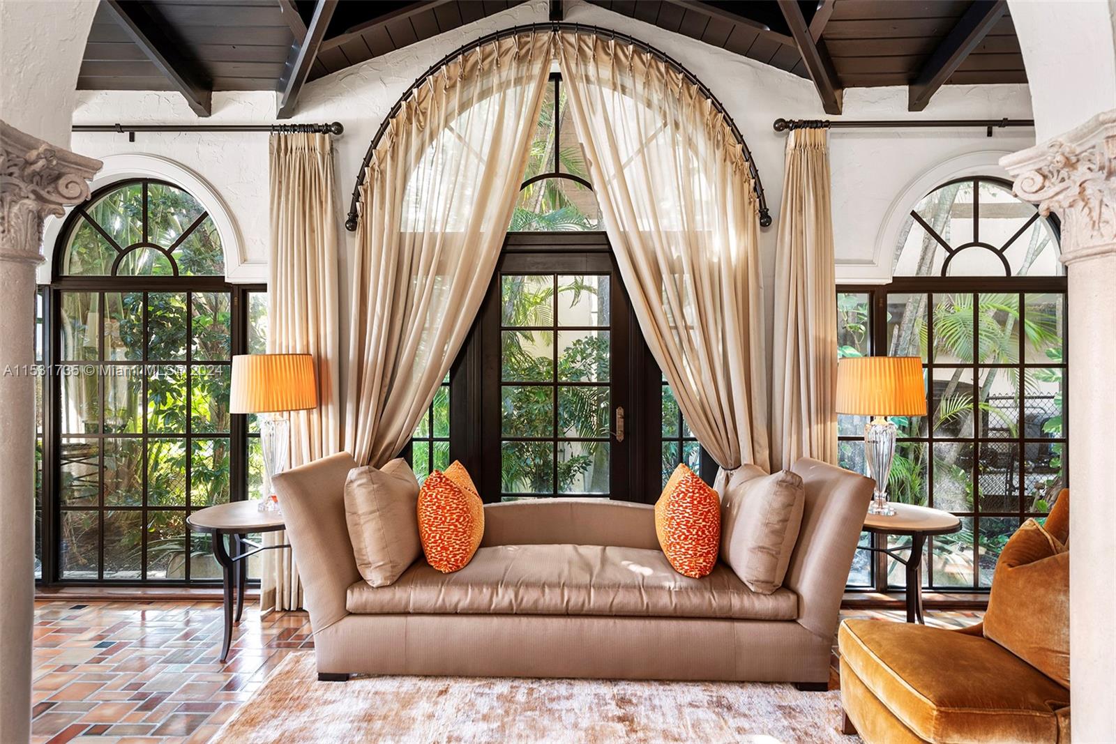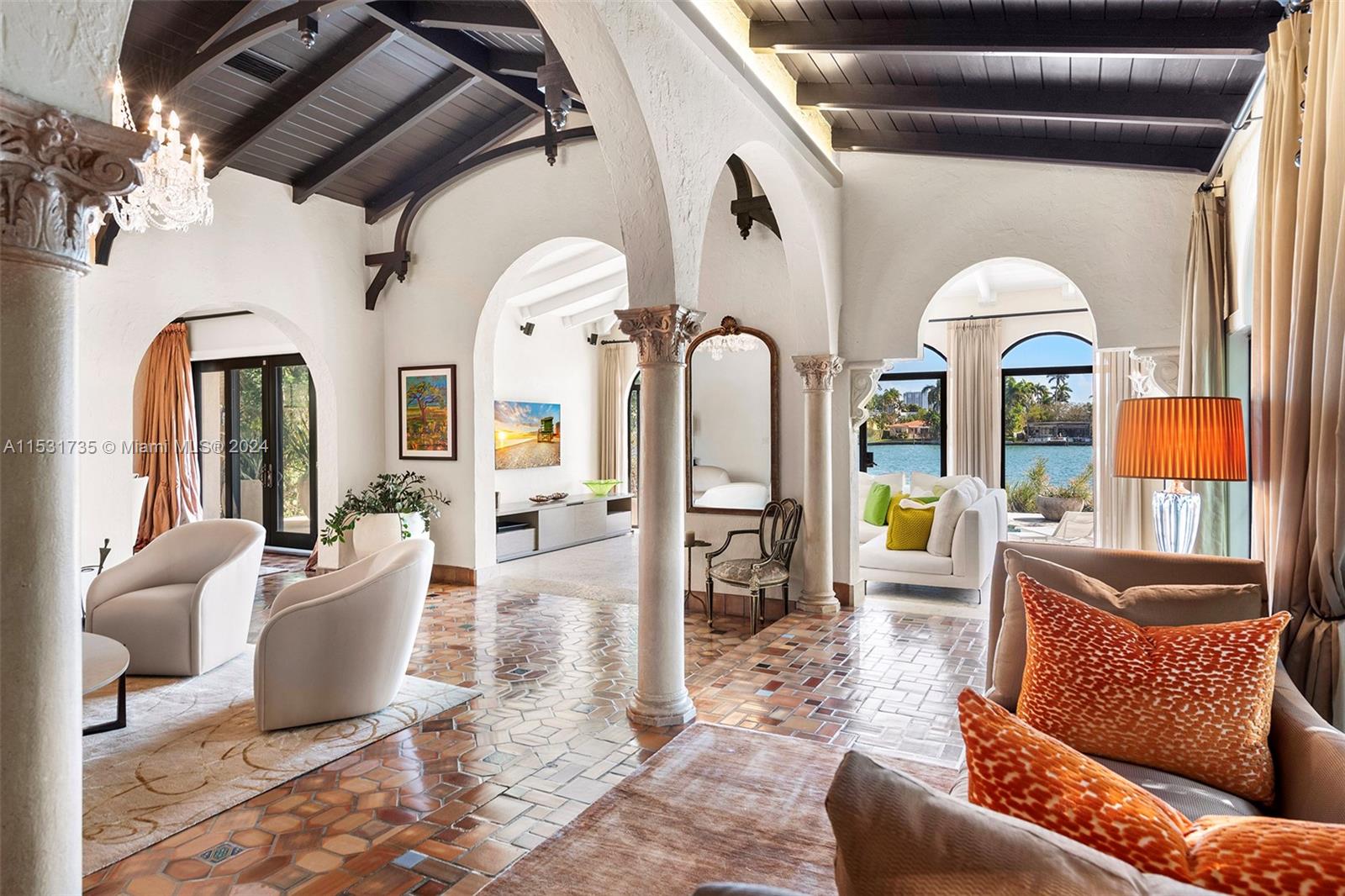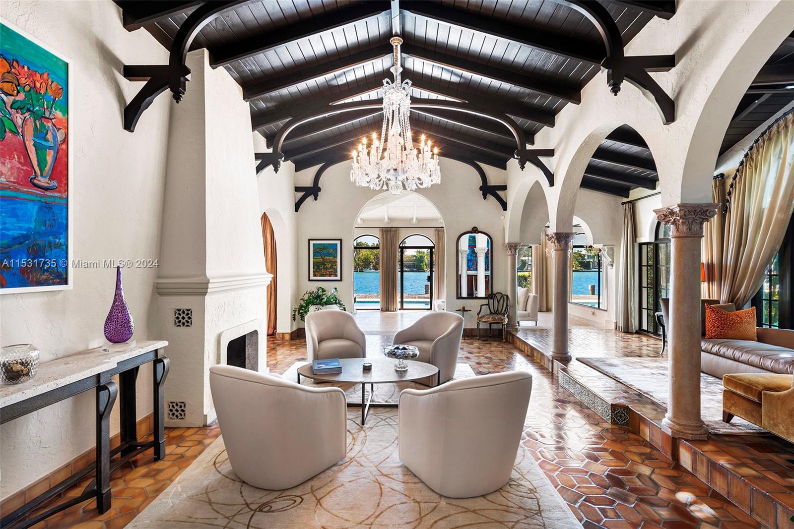 “El Escape” – an Italian Villa nestled within the lush Venetian Islands features stunning, original architectural details and panoramic vistas of Biscayne Bay from every angle! Step inside to discover majestic living spaces with soaring cathedral-beamed ceilings, oversized arched windows and doorways, fireplace, and original Arabesque tile floors. Oversized primary suite with modern bath, gourmet kitchen, family room, 3 beds in main house, “secret room”, guesthouse, and a 2-car garage awaiting discovery! Enjoy the tropical scenery of Venetian Islands and glistening water views from your secluded backyard! This home is a hidden tropical retreat offering a sanctuary for relaxation and entertainment, and ideal central location with access to all the wonders of Miami’s vibrant landscape.