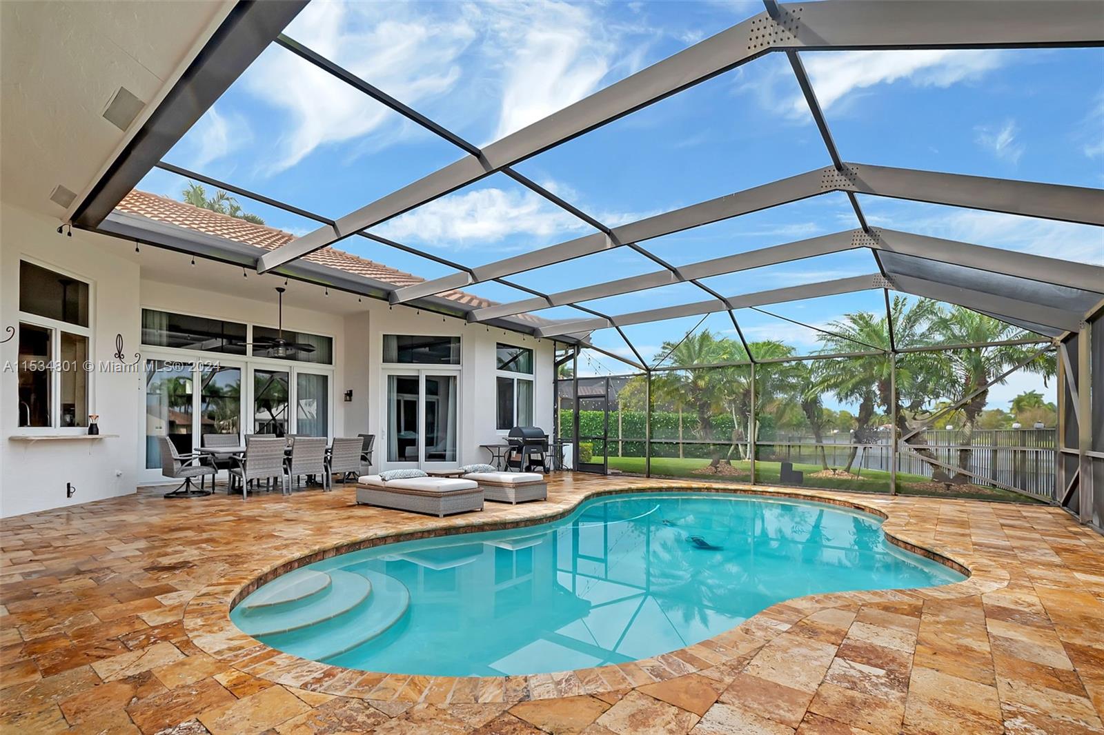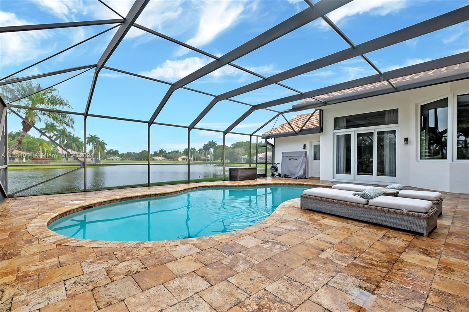 Experience unparalleled luxury in this Weston Hills sanctuary featuring 5 bedrooms plus a BONUS room. Nestled on an 18,396 sq ft pie shape cul-de-sac lot, relish panoramic views of the lake and golf course. Rarely available and one of the most desirable lots- great for entertainment. The gourmet kitchen and spacious living areas with 12 feet ceiling redefine elegance. Fully renovated bathrooms and an inviting master suite with view to the lake! Step outside to a private oasis with a screened pool and marble pavers. Hardwood floors grace the main area, complemented by shaker solid wood doors. ROOF 2017, coupled with all IMPACT windows/doors, ensures safety and durability. This home seamlessly blends sophistication and timeless elegance, offering true luxury living.