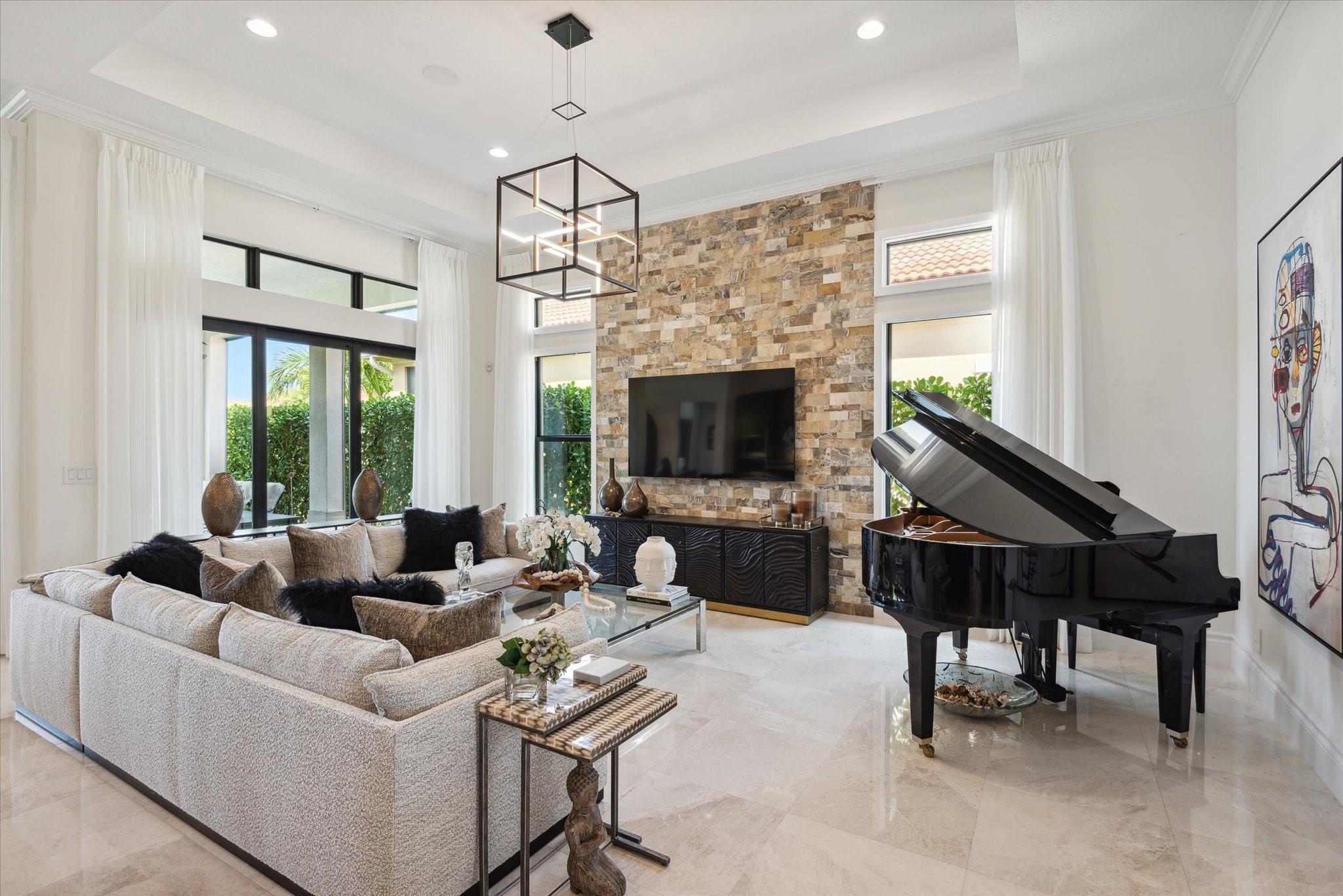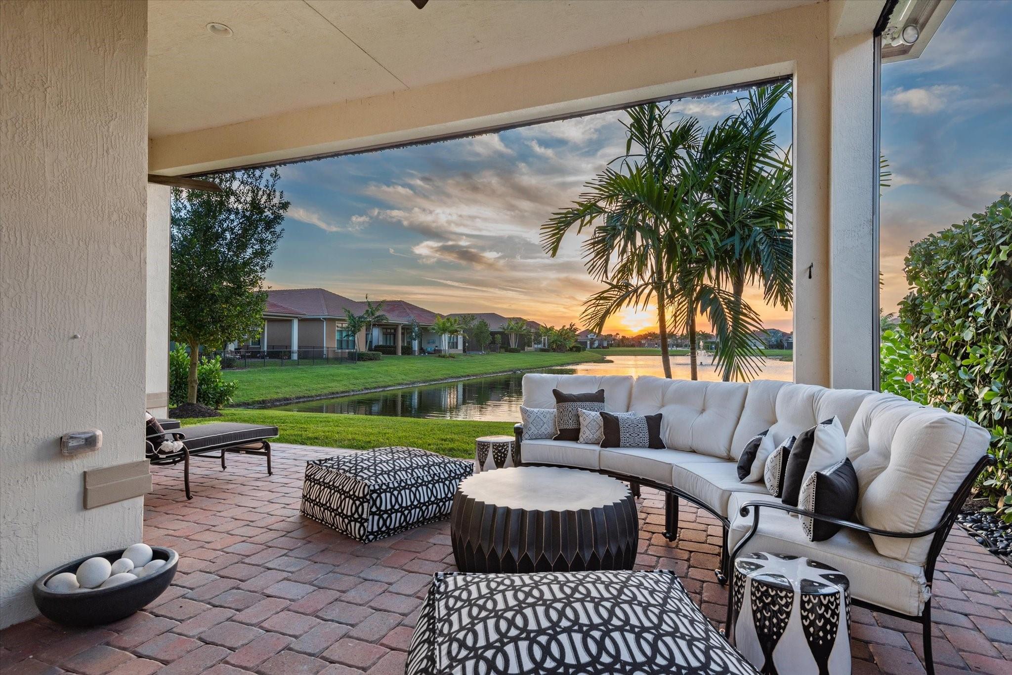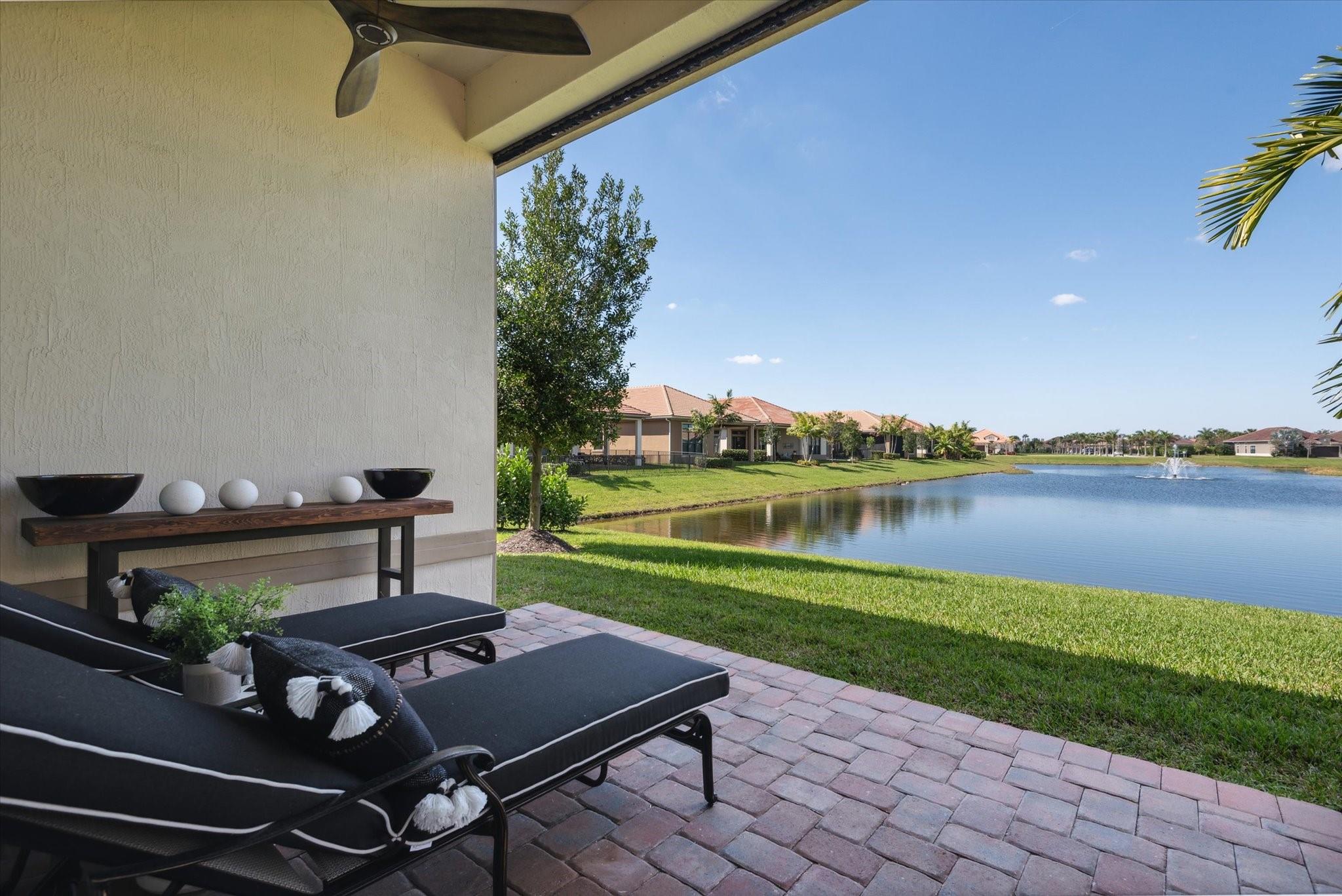 Exquisite 2BR, 2 1/2 bath home plus a den sits on one of the best long waterfront view lots in Four Seasons! This home is a MUST-SEE home upgraded at every turn starting with the dramatic oversized, front impact glass French door with striking views of the lake immediately upon entering this elegant home. Volume 14' ceilings with 3 tray ceilings w/extra wide molding in entry foyer, 8" baseboards & casings throughout home, quartz countertops in kitchen and baths, natural gas range and tankless water heater, 24x24 marble floors in all rooms, upgraded faucet w/gold accents in kitchen, double oven, phantom screen on patio works with remote control, epoxy floor in oversized garage w/custom cabinets in lg. storage area/golf cart parking, and full house generator. Too many upgrades to list!
