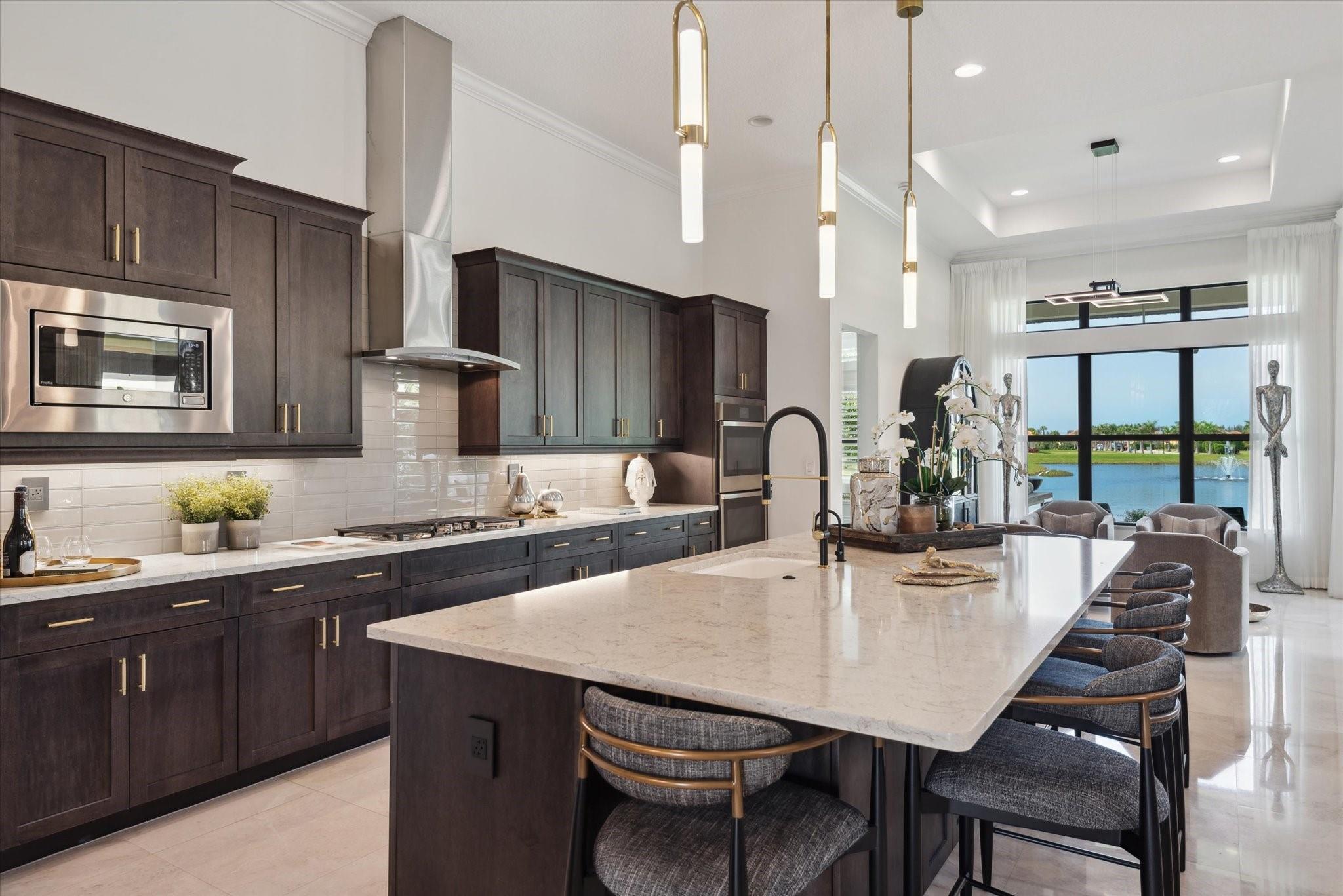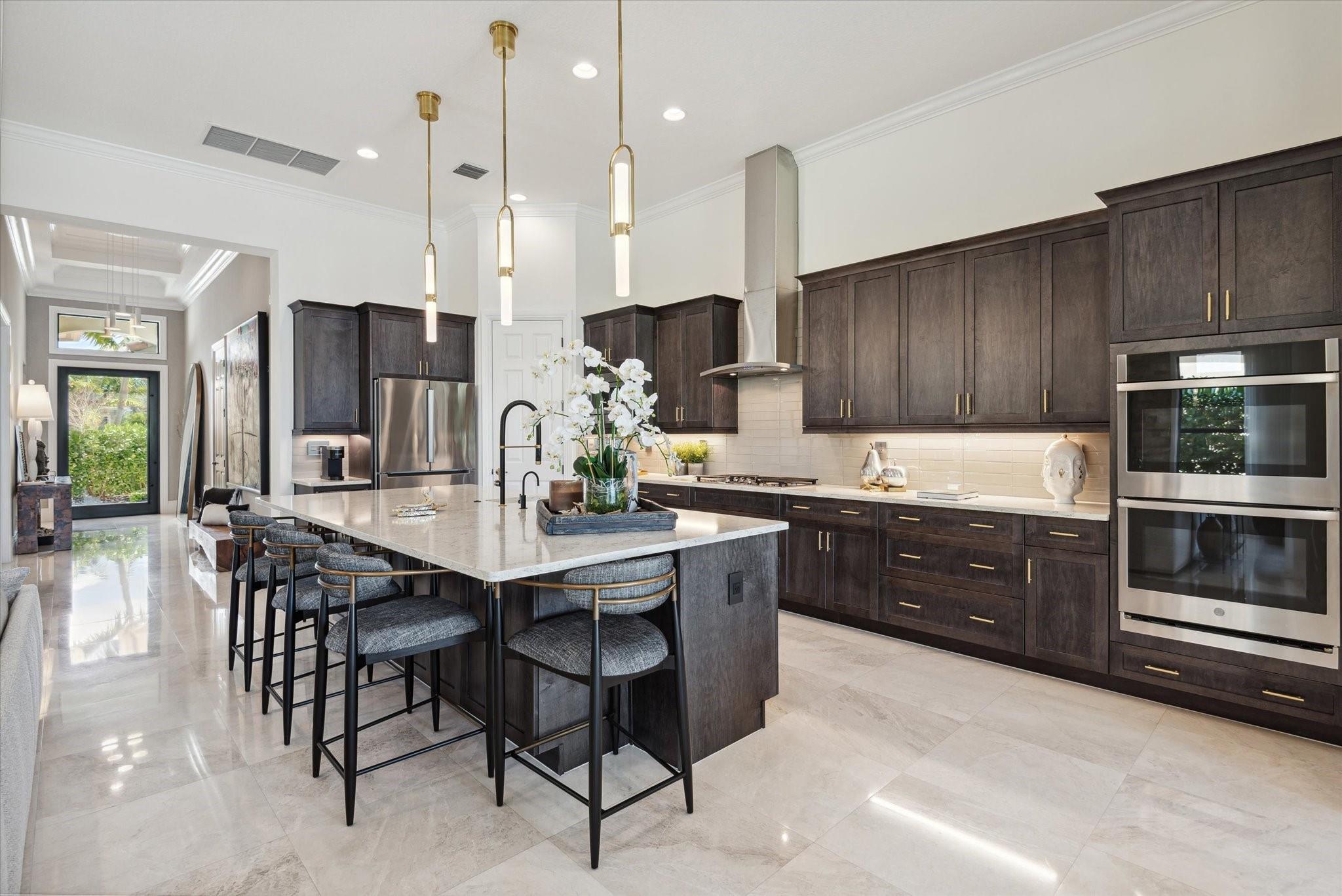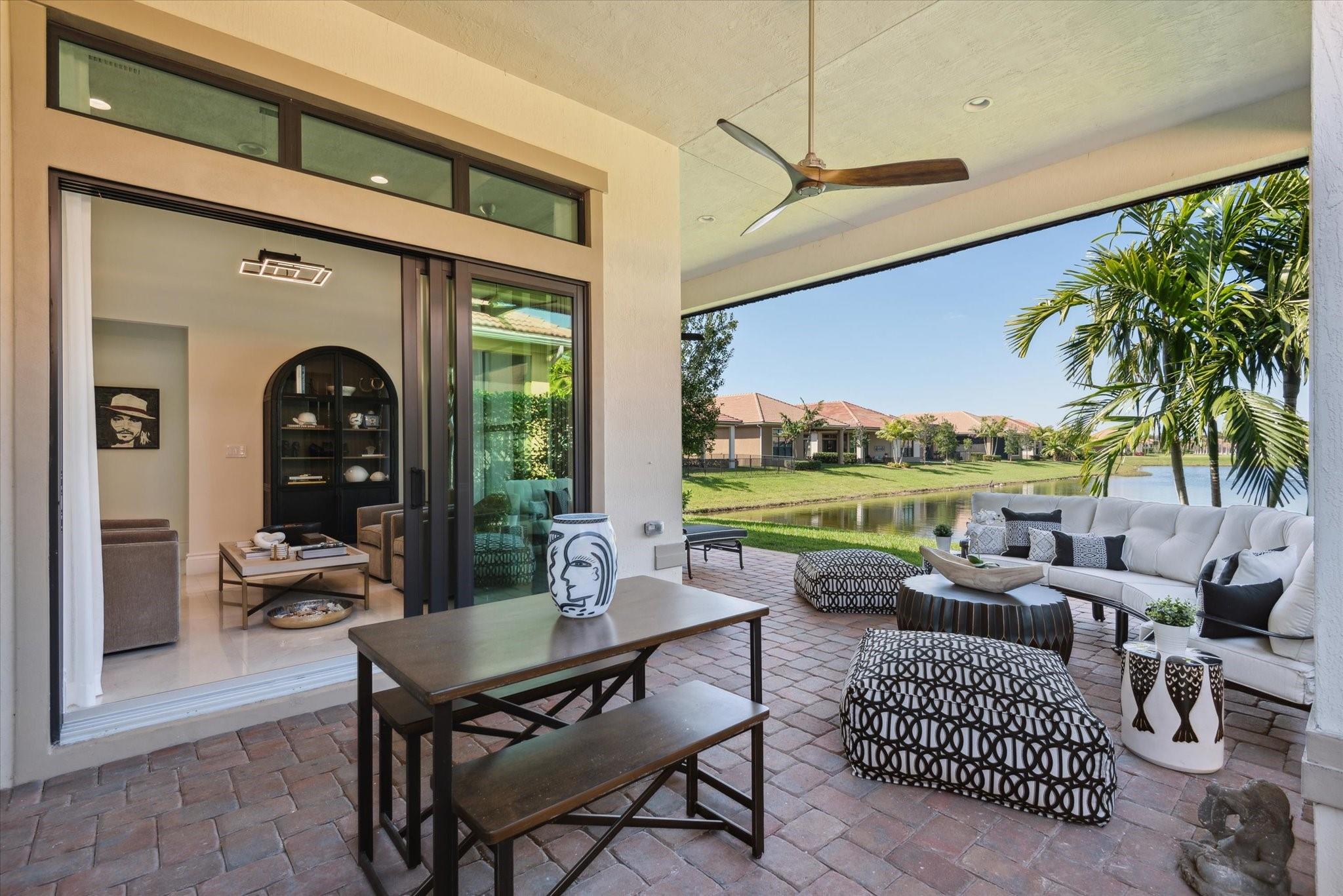 Exquisite 2BR, 2 1/2 bath home plus a den sits on one of the best long waterfront view lots in Four Seasons! This home is a MUST-SEE home upgraded at every turn starting with the dramatic oversized, front impact glass French door with striking views of the lake immediately upon entering this elegant home. Volume 14' ceilings with 3 tray ceilings w/extra wide molding in entry foyer, 8" baseboards & casings throughout home, quartz countertops in kitchen and baths, natural gas range and tankless water heater, 24x24 marble floors in all rooms, upgraded faucet w/gold accents in kitchen, double oven, phantom screen on patio works with remote control, epoxy floor in oversized garage w/custom cabinets in lg. storage area/golf cart parking, and full house generator. Too many upgrades to list!