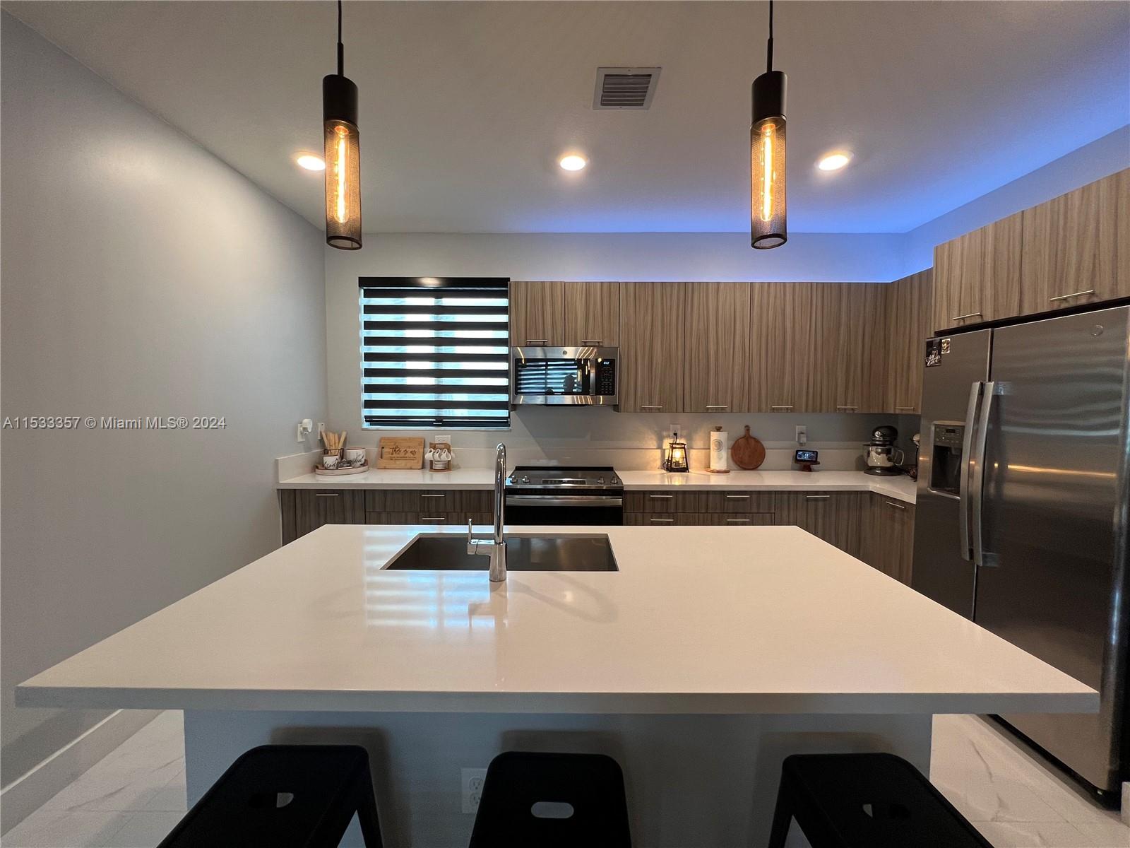 Welcome to this cozy and spacious 3 br / 2.1 ba townhome in the sought-after Urbana at Downtown Doral. It has been tastefully upgraded with black matte light fixtures, modern tv wall unit, custom window shades, fine wallpapers, and porcelain tiles on the first floor. This 2021 new construction unit offers an open floor plan with comfortable spaces and impact windows & doors. Urbana is a vibrant community offering resort-style living, with its Residences Club which offers a stunning pool with sundeck and poolside cabanas, elegant clubhouse, state-of-the-art fitness center, splash park for kids, and an indoor basketball court & running track. Situated just steps from Downtown Doral, residents can enjoy trendy restaurants, boutiques, and amenity-rich parks.