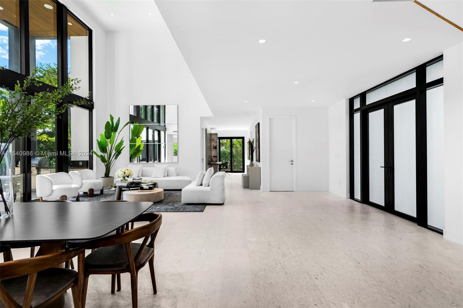 In a tranquil cul-de-sac, this new contemporary corner home offers an airy, open layout with high ceilings and natural light located in North Pinecrest. It features a modern kitchen with custom cabinets and quartz tops with subzero and wolf appliances. The first floor includes two bedrooms, each with a private bath, ideal for guests or family. Upstairs, a den, a master suite with walk-in closets, a large spa bath with soaking tub and dual vanities, and two more bedrooms with ensuite baths await. The outdoor space boasts a terrace, outdoor kitchen, pool, fireplace, and pool bath with outdoor shower accompanied by great landscaped grounds. Home also has great finishes, several built ins and custom closet cabinetry. impact-resistant windows, a two-car garage, and is near top schools.