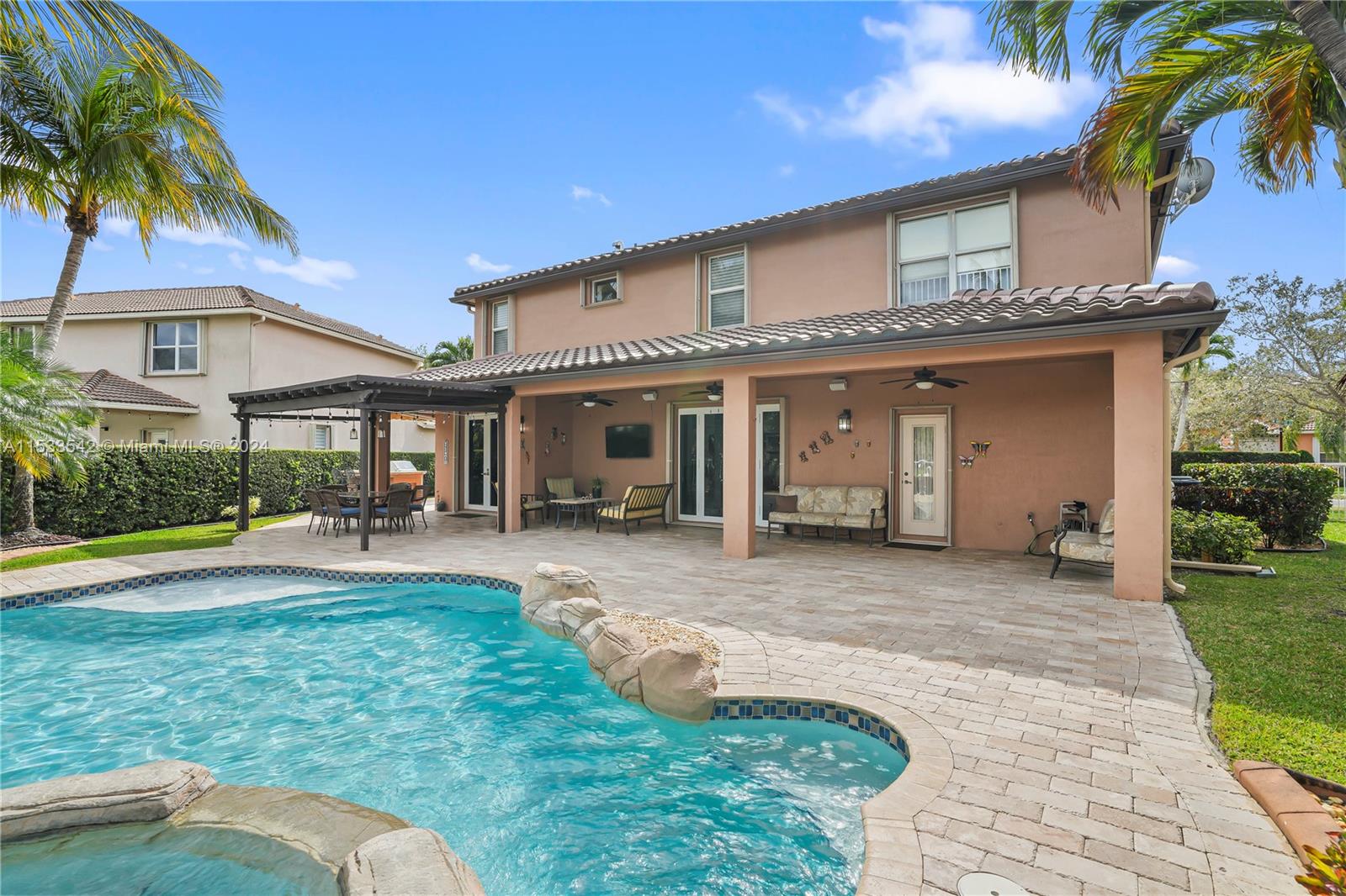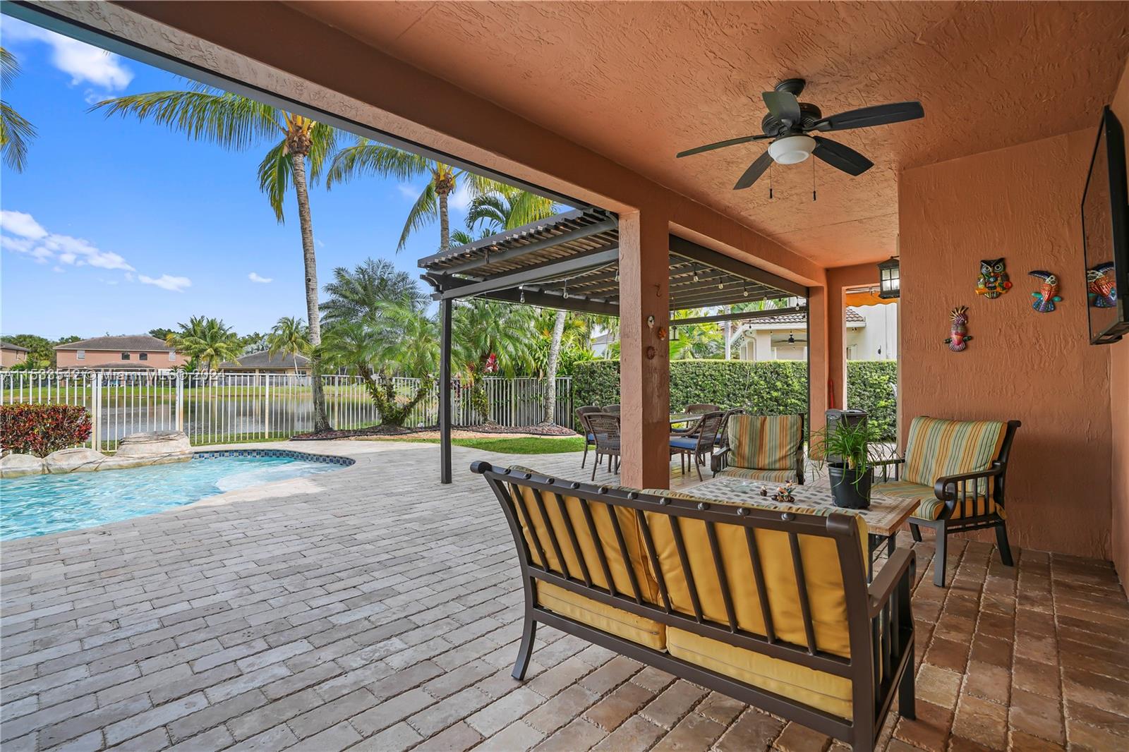 Beautiful water front two story 5 bedrooms and 3 bathrooms house, inmaculate condition it feels like a model home, one full bedroom and bath on first floor, granite counter tops and double oven wall in kitchen, big island. Induction stove. Porcelain on first floor living areas and carpet on second floor (2023). Roof replaced in 2023, the A/C is 2018, washer and dryer 2022. Gorgeous backyard, perfect for entertainment free form pool, lake, and summer kitchen. Accordion schutters, all upper windows in living area will be high impact windows. Located in the prestigious guard gated community of Isles at Weston, You can enjoy the recently remodel gym, 2 pools, basket and more at the club house. Walking distance to Manatee Bay Elementary, Falcon Cove Middle, and Cypress Bay high schools.AS-IS