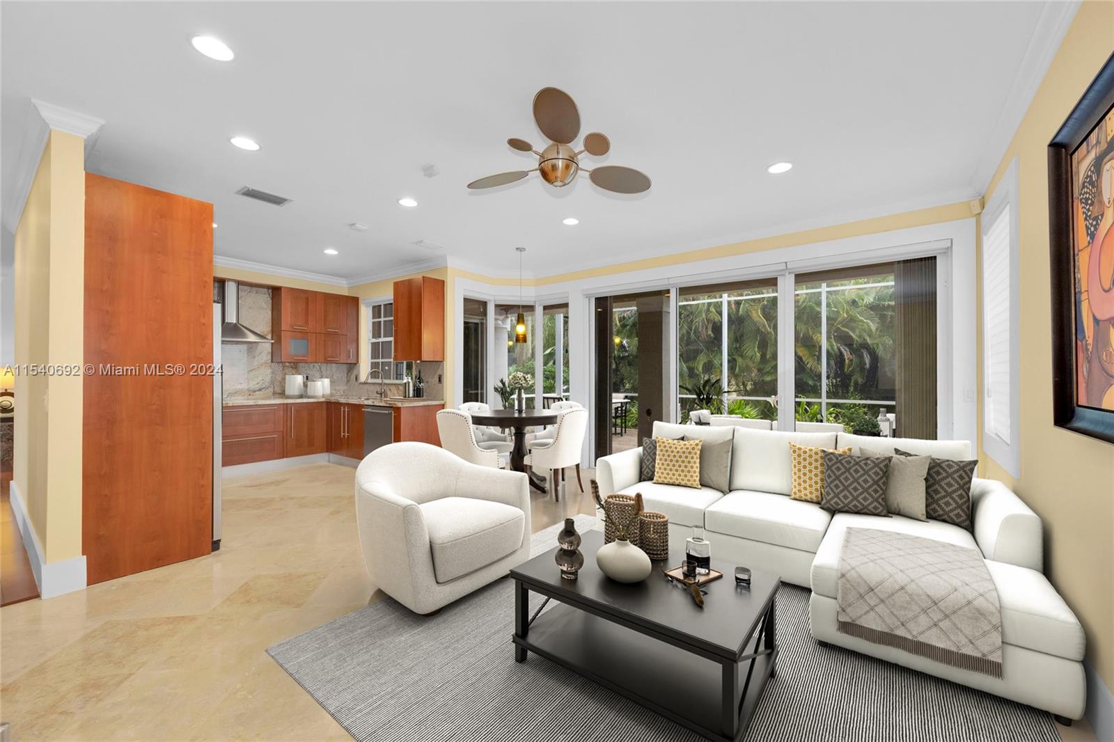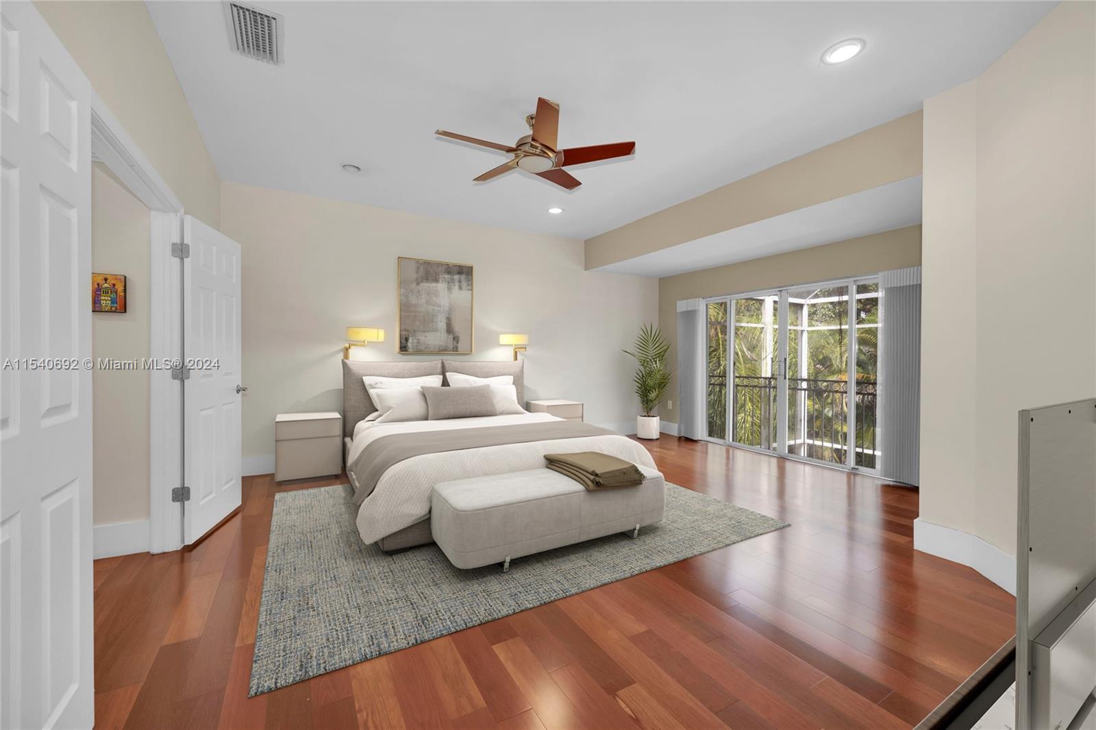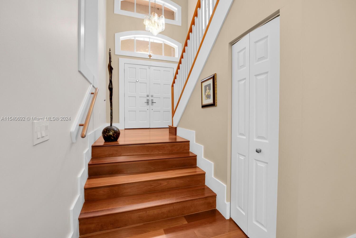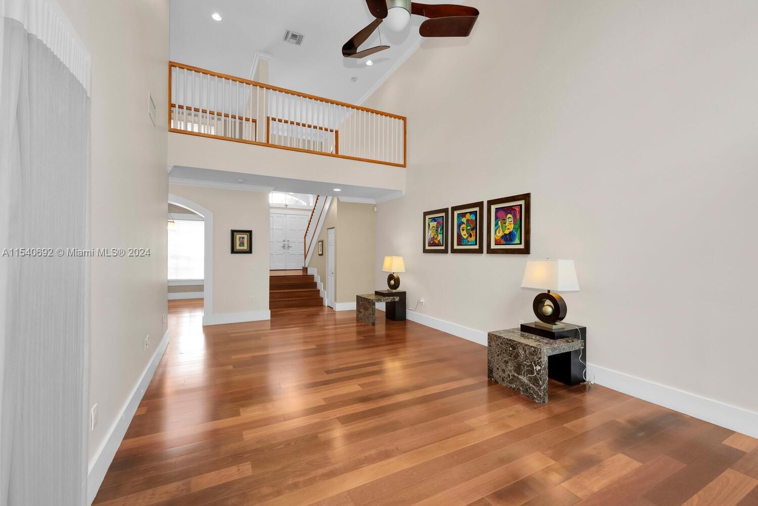 Discover the elegance of a 3-bedroom, 3-bathroom villa located in the prestigious Fairways area of Doral Estates Villas. This exquisite home welcomes you with a grand formal living room, accentuated by soaring 18-foot ceilings, luxurious Brazilian cherry wood floors, & sleek marble tile in the kitchen. The layout includes a convenient downstairs bedroom & bathroom, an indoor laundry room adjacent to the expansive two-car garage, & an outdoor screened terrace. Upstairs, find two ensuite bedrooms, featuring a spacious primary suite with a large walk-in closet, double vanity, Jacuzzi tub, & shower. The home is equipped with partial impact windows & accordion shutters. Residents enjoy access to Trump National Doral Golf & Spa Resort, 24 hour security with a gated entrance, & a community pool.