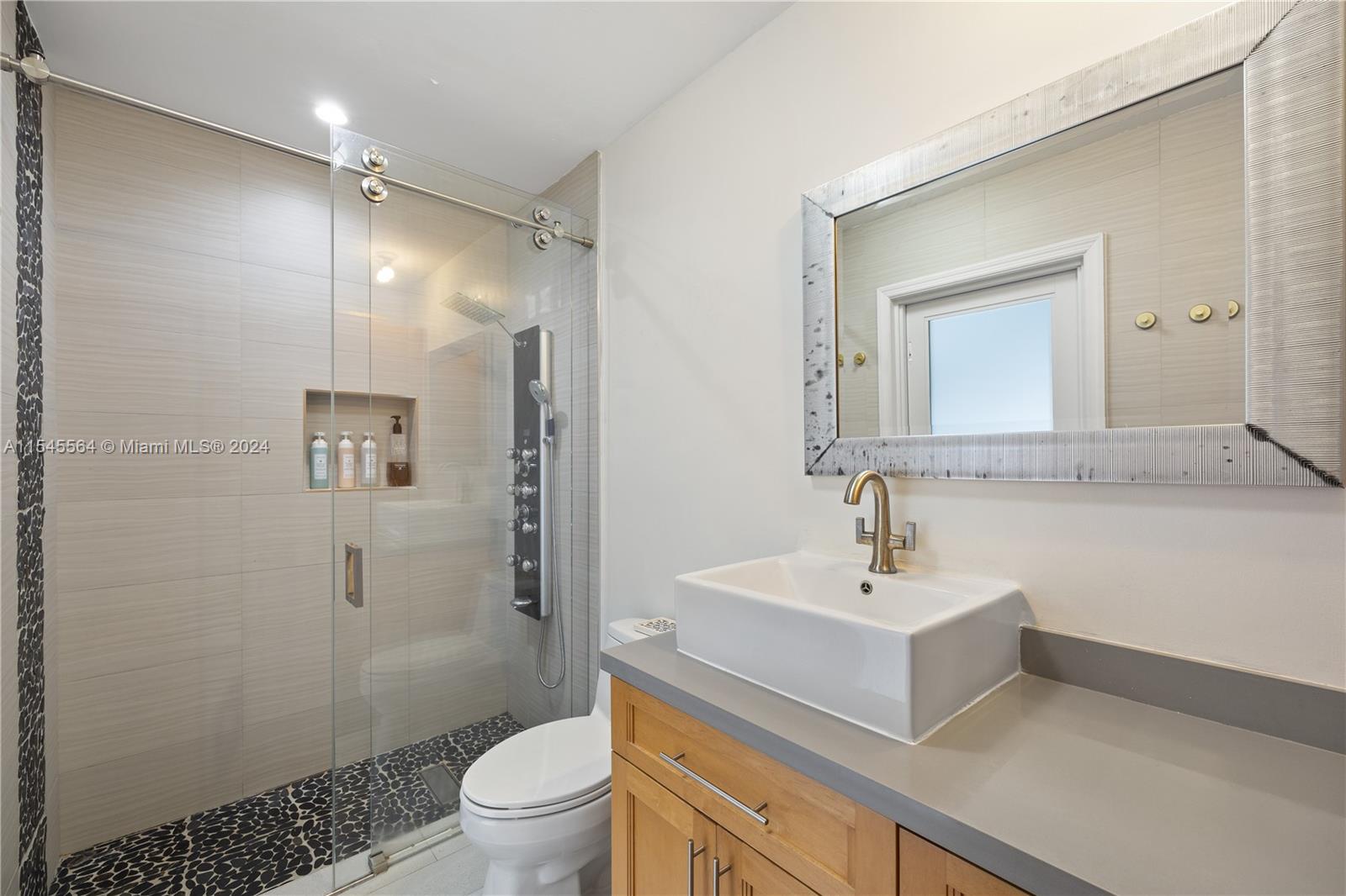 Welcome to your dream oasis! Beautifully remodeled 3/2 ranch-style home sits on an expansive, almost 30,000 sq ft lot! The kitchen features top-of-the-line Bosch appliances, ice maker and wine bar, perfect for entertaining. Plans are included to expand the master/living area for added space. All windows, doors, and garage are hurricane-rated. Home boasts a guest house with a bathroom/shower, complete with new tile floors. picturesque lakefront views and a 20 X 40 saltwater pool surrounded by travertine pool deck. The outdoor BBQ area features built-in appliances, including a KamadoJoe smoker, ideal for outdoor gatherings. Additional amenities include an outdoor shower, fire pit area, and shed. With updates like a 2018 roof, 2019 A/C, and a water heater from 2022.
