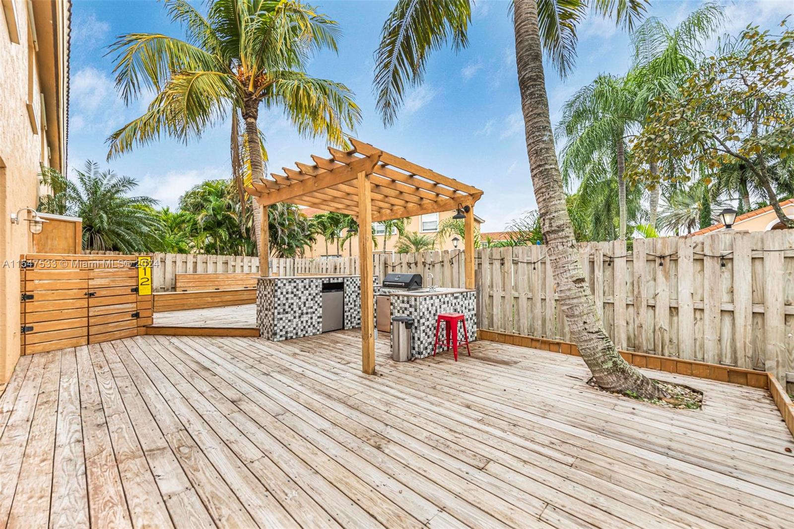 Beautiful 3 bedroom 2.5 bathroom townhouse located in the lovely Antigua community. Step inside and discover thoughtfully designed interior, open layout & natural lighting. Meticulously maintained, this property is turn key! Tiled floors throughout first floor. Updated kitchen with granite countertops and stainless steel appliances. Large primary suite with new flooring and a gorgeous updated master bathroom! All bedrooms are on the second floor. Updated fixtures, lighting and nice designer touches all through. Enjoy South Fl living in the AMAZING backyard area w/ wooden deck, summer kitchen, BBQ and lots of room for entertainment! Over 20K of upgrades was put into the backyard! New electrical panel! Fantastic location and development with a community pool and more. Low HOA! Must see!