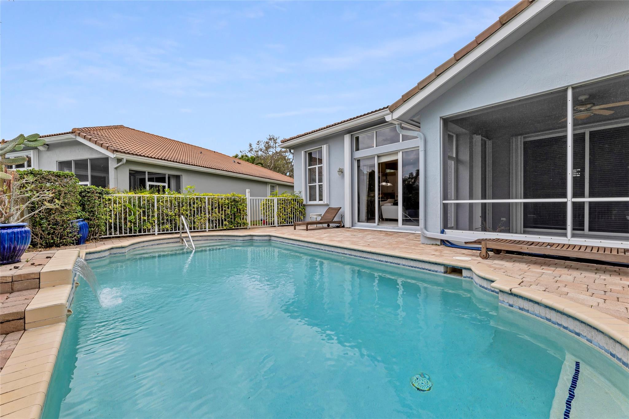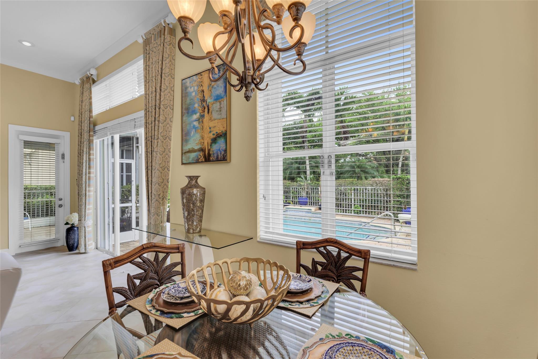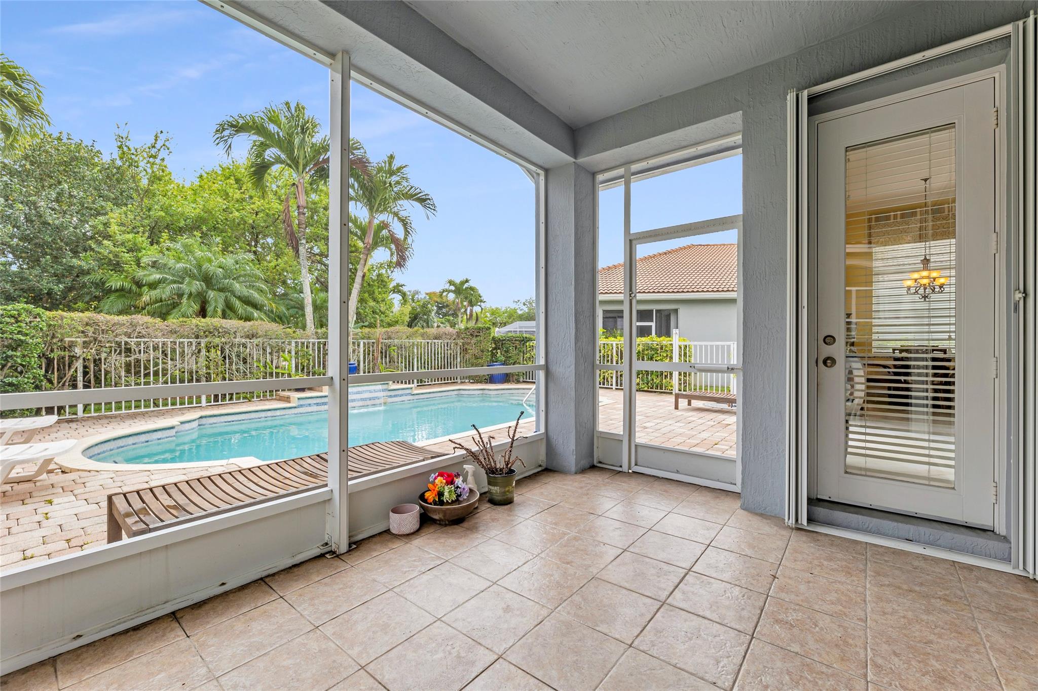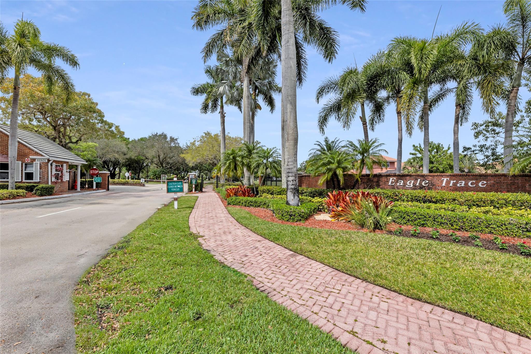 Beautiful 3 bedroom, 2 bathroom house in gated Eagle Trace golf community. Split floor plan includes: formal dining room, family room, and living room. High-vaulted ceilings and high-quality flooring throughout the home. All-white kitchen includes kitchen island, great for entertaining guests. Master bedroom has walk-in closet and spacious master bathroom. Screened patio has serene sitting area overlooking the pool. Fenced backyard is very private, surrounded by vegetation. The home features a 2-car garage with extra parking in the driveway and storm shutters for added safety. Amenities include: 24-hour security at gate entrance, basketball and tennis courts. This home is move-in ready!
