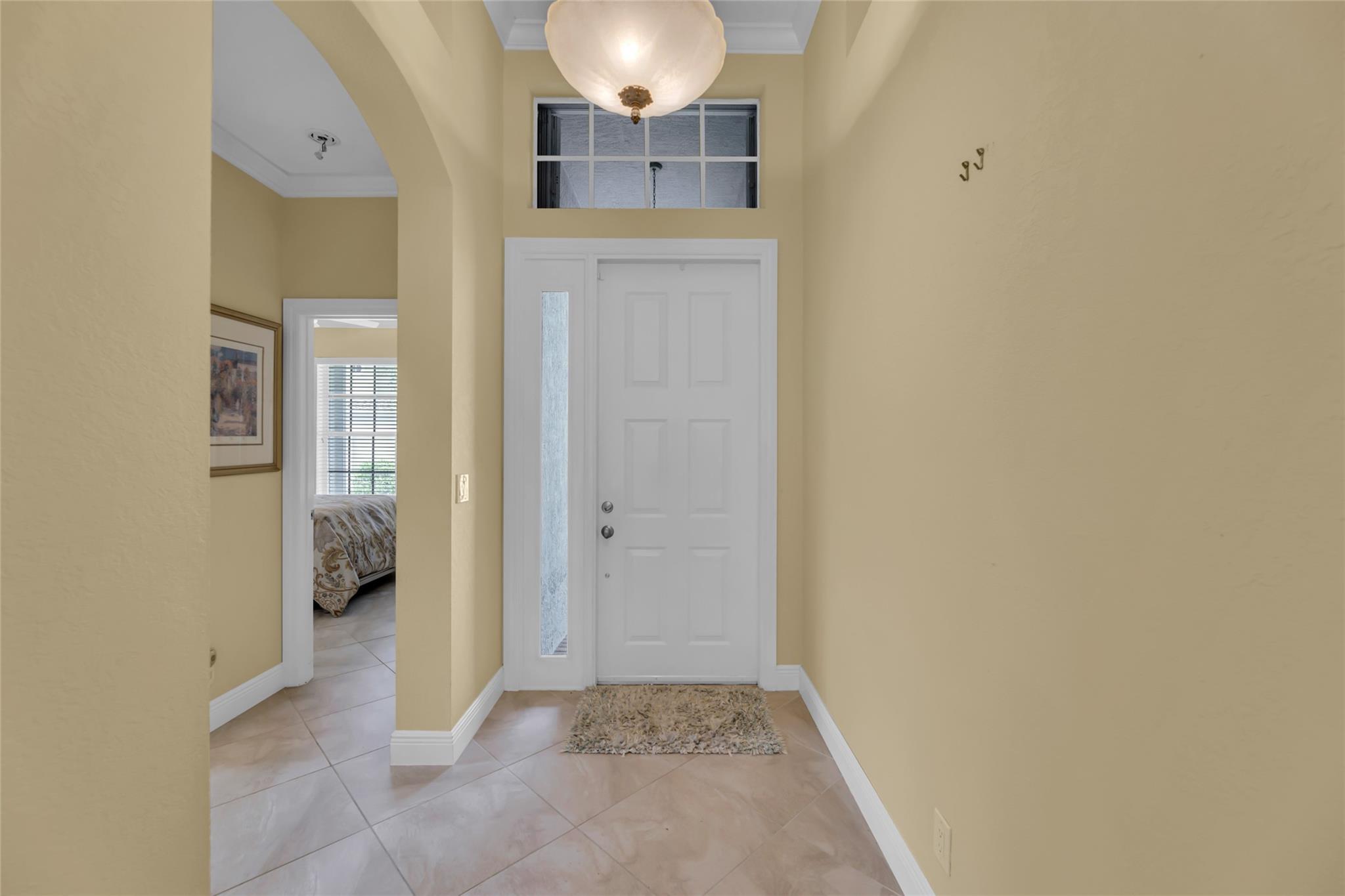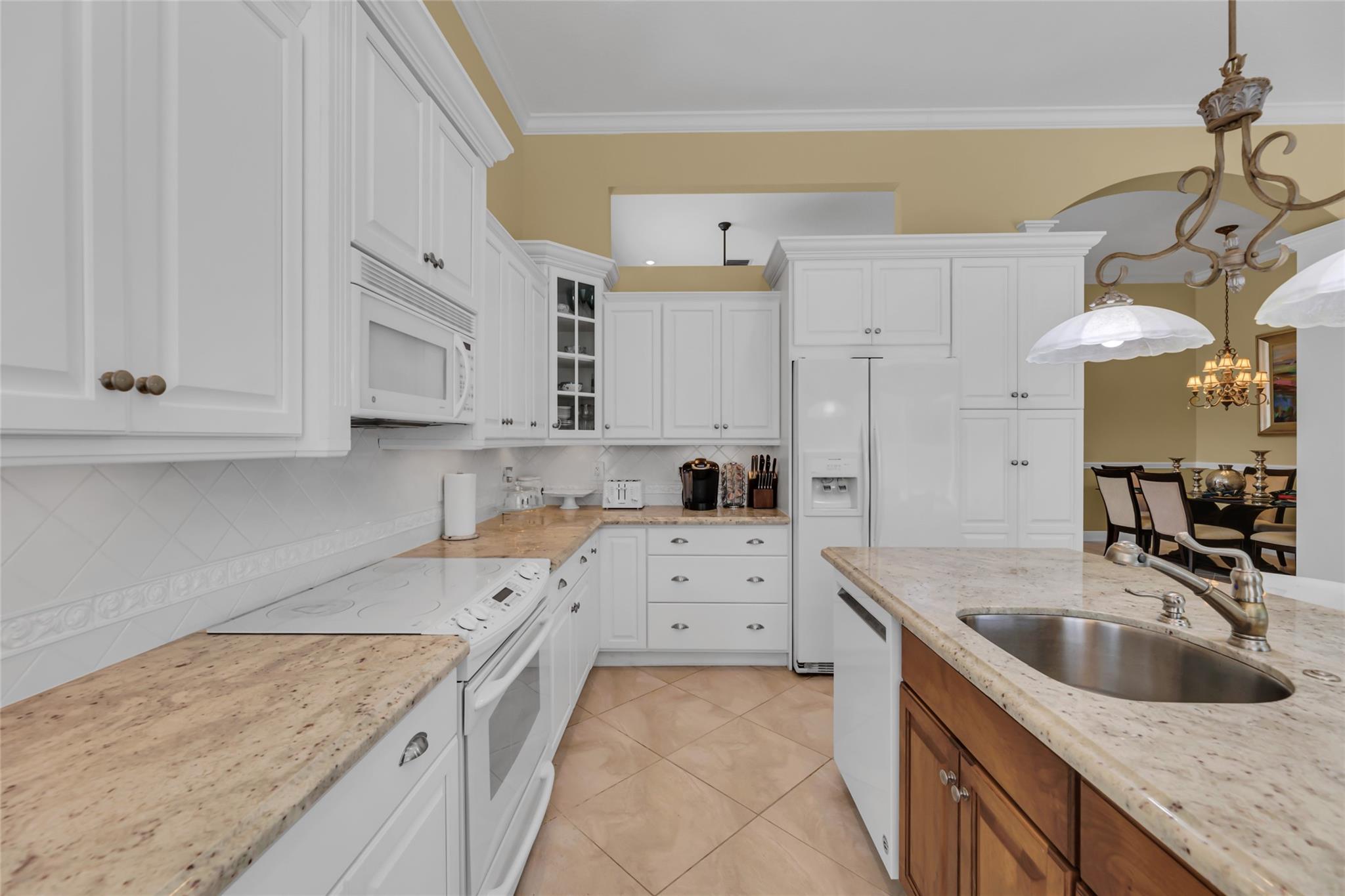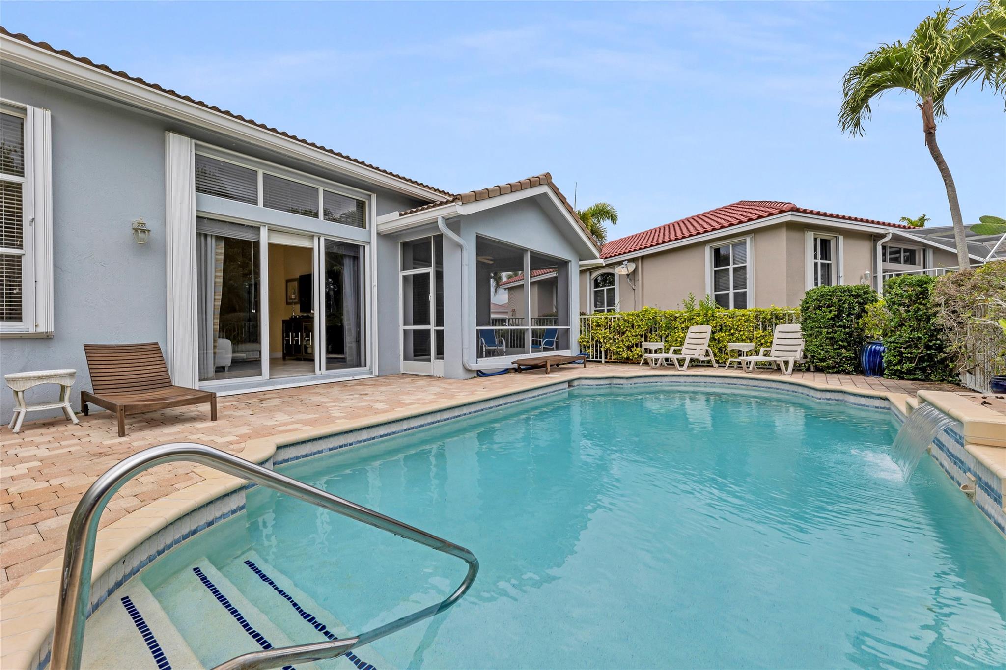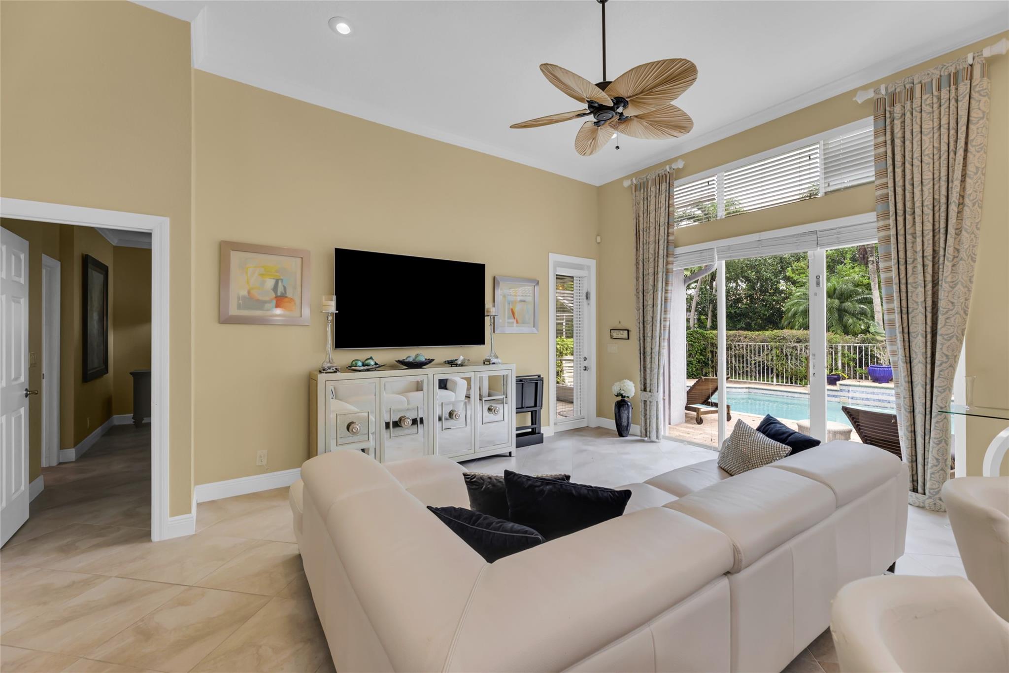 Beautiful 3 bedroom, 2 bathroom house in gated Eagle Trace golf community. Split floor plan includes: formal dining room, family room, and living room. High-vaulted ceilings and high-quality flooring throughout the home. All-white kitchen includes kitchen island, great for entertaining guests. Master bedroom has walk-in closet and spacious master bathroom. Screened patio has serene sitting area overlooking the pool. Fenced backyard is very private, surrounded by vegetation. The home features a 2-car garage with extra parking in the driveway and storm shutters for added safety. Amenities include: 24-hour security at gate entrance, basketball and tennis courts. This home is move-in ready!