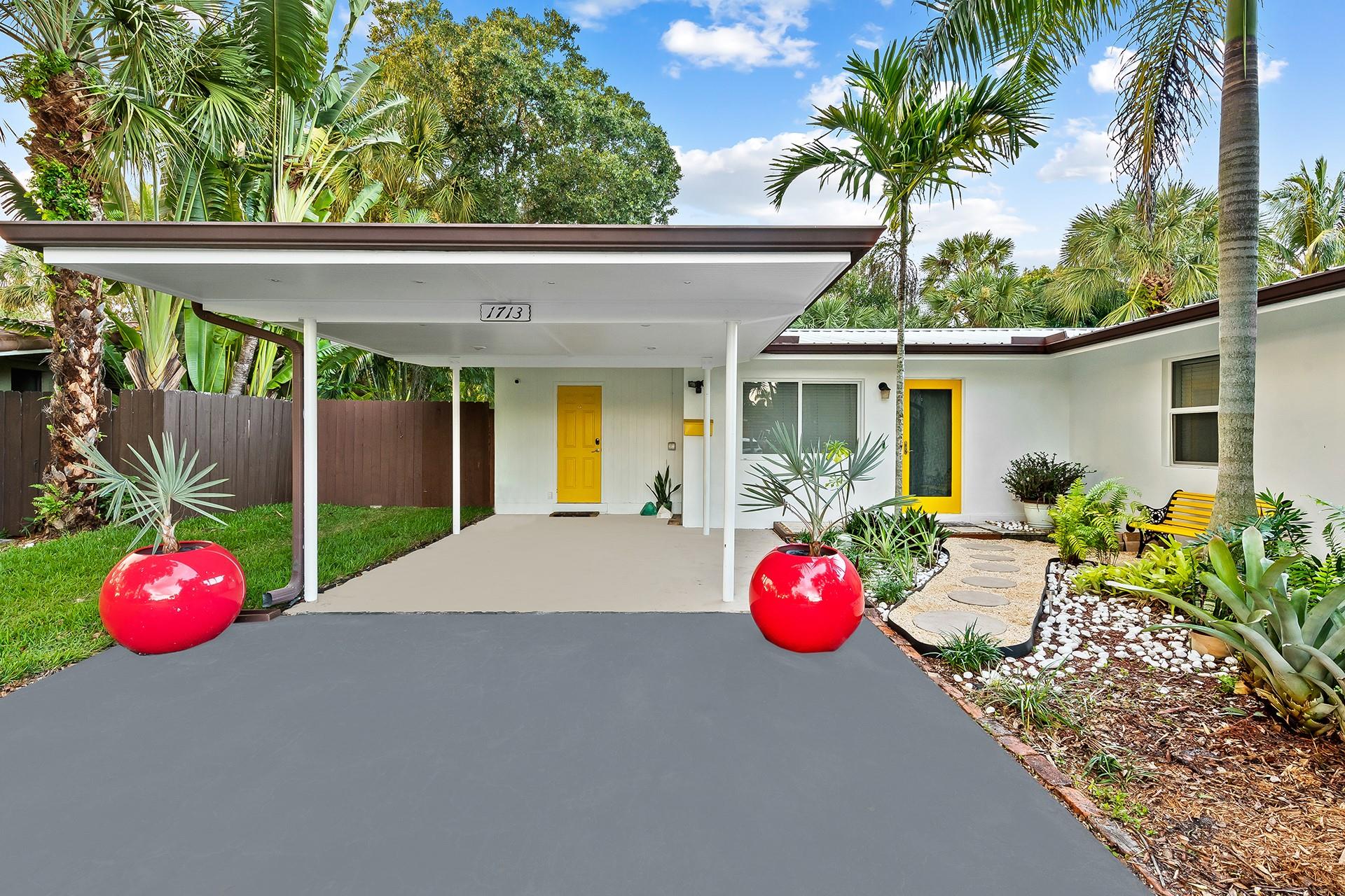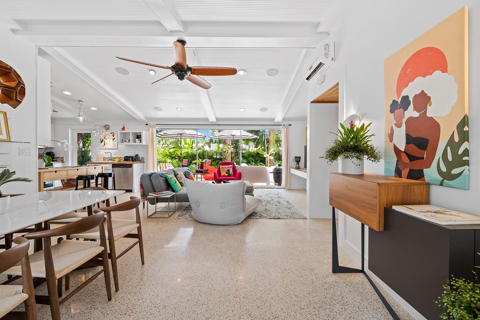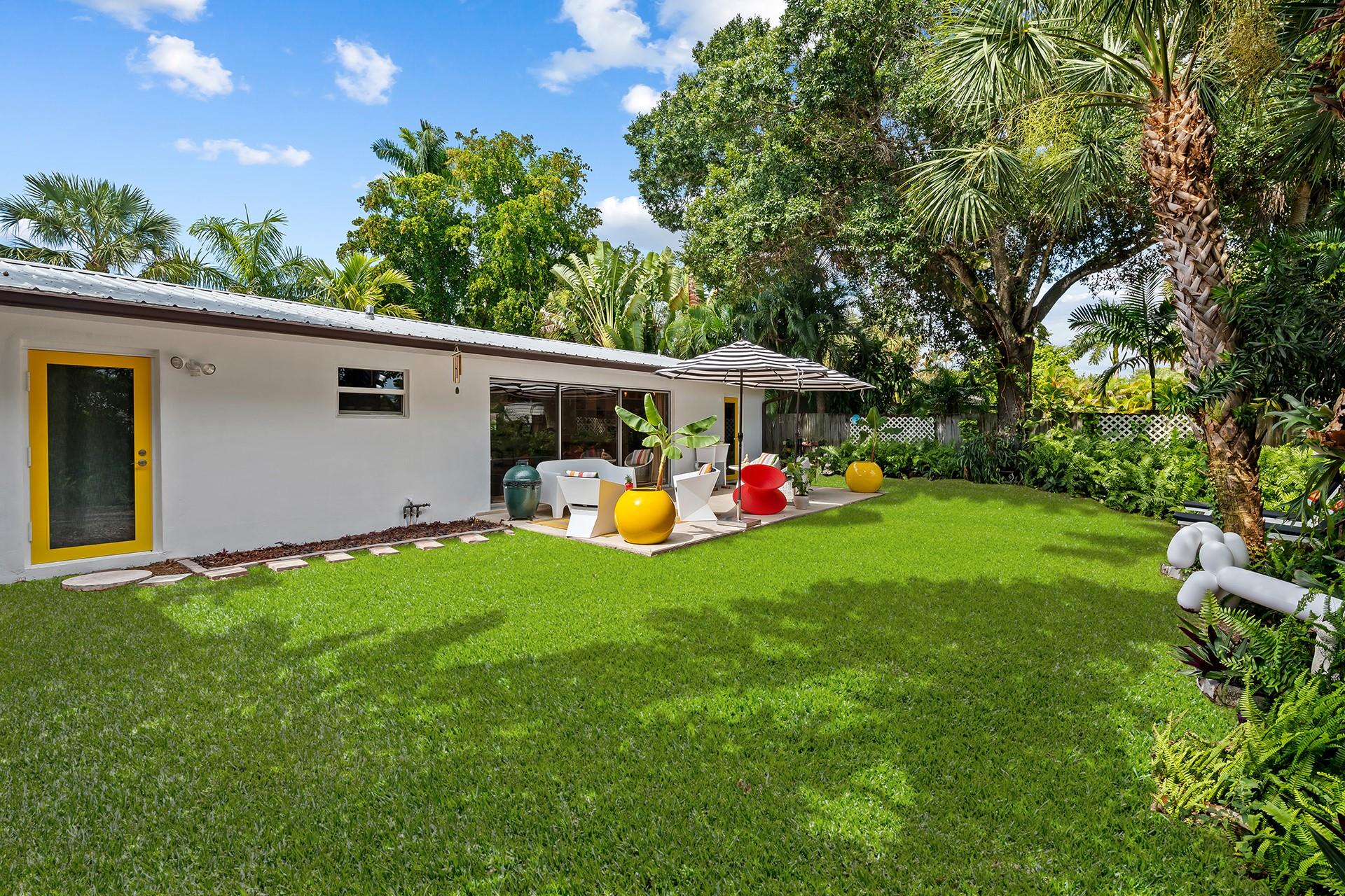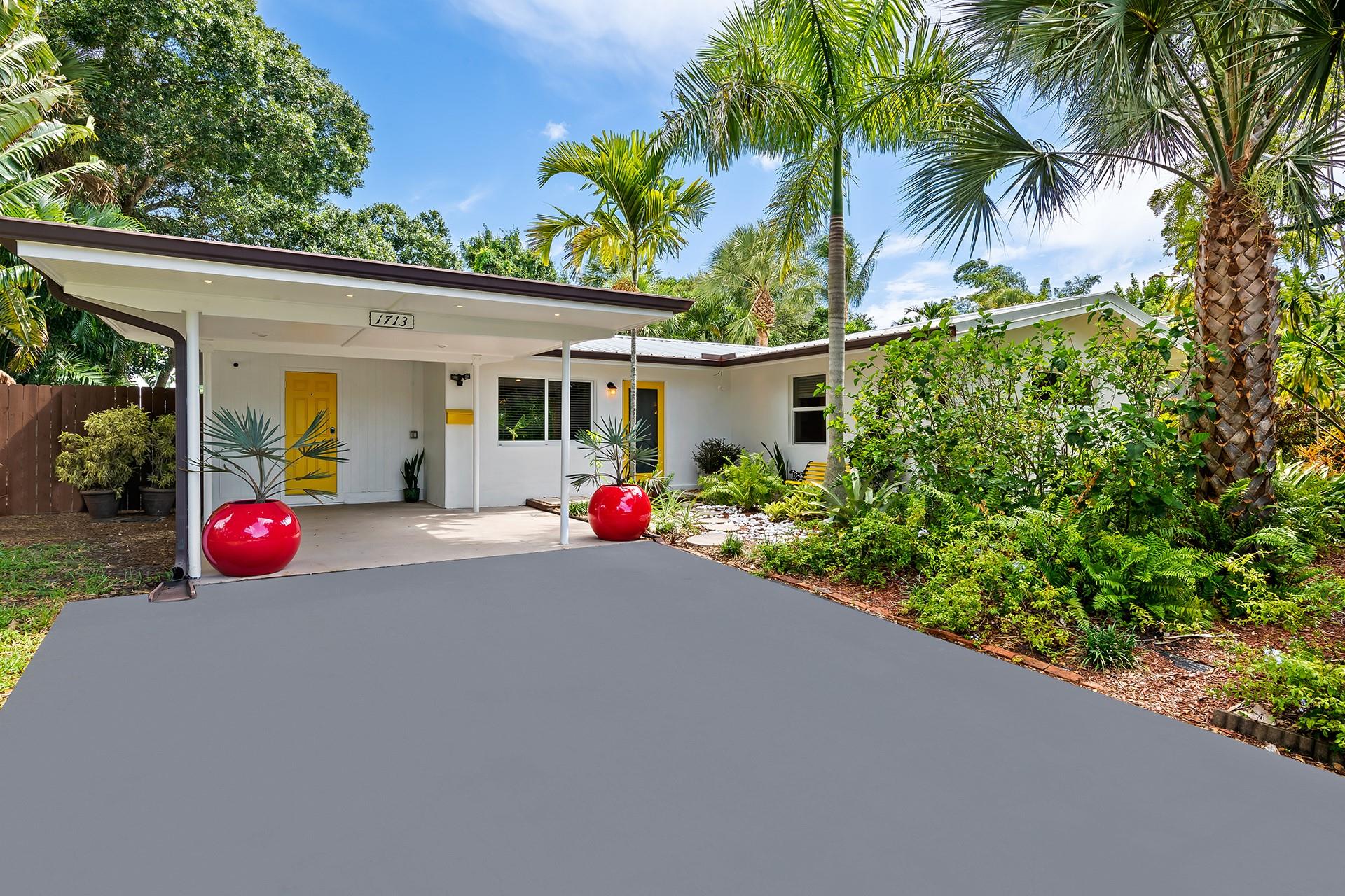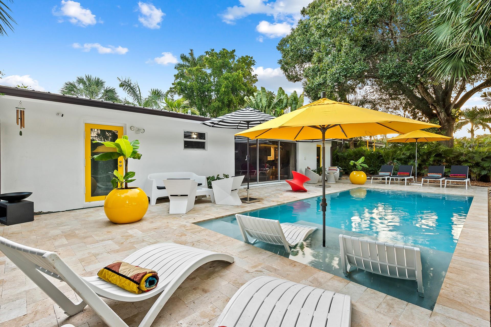 New price reduction for immediate sale! Mid-century modern home meets contemporary! Welcome to tranquil private retreat w/ interior designer finishes. This charming one story villa is an Oasis of nature with many mature palms and gorgeous oak tree! Great opportunity for investors as the house is licensed for short term rental w/ verifiable numbers. $150k spent on upgrades in 2023! Some of the features include: brand new baths, new PVC pipes, brand new AC units, impact doors and windows, salt water heated pool with underwater LED lights, polished original terrazzo floors, new landscaping, new metal roof, iPhone controlled smart home system, cameras & sound system and many more! - all minutes from downtown, Brightline and I-95 in park like setting of prestigious Gill Isles neighborhood.