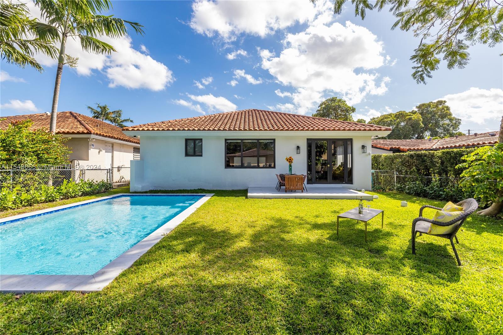 Welcome to Villa Gables! This beautifully updated, turnkey, 2002-built “newer” North Gables value-packed home has four bedrooms, two and a half baths, and delivers superior features to similarly priced older Coral Gables homes. Enter into bright, quiet, spacious open-flow living and dining with soaring 10’ vaulted ceilings, leading to a huge designer eat-in kitchen and additional den/sunroom opening to the sparkling pool, rear entertainment deck, and lush spacious fenced gardens. The split bedroom plan includes a large main suite retreat with spa-like bath and walk-in closet, plus two spacious guest rooms and an additional fourth bedroom, also great as home office or guest nest. All in a great location with a one-car garage and plenty of parking, close to Downtown Gables and Coconut Grove.