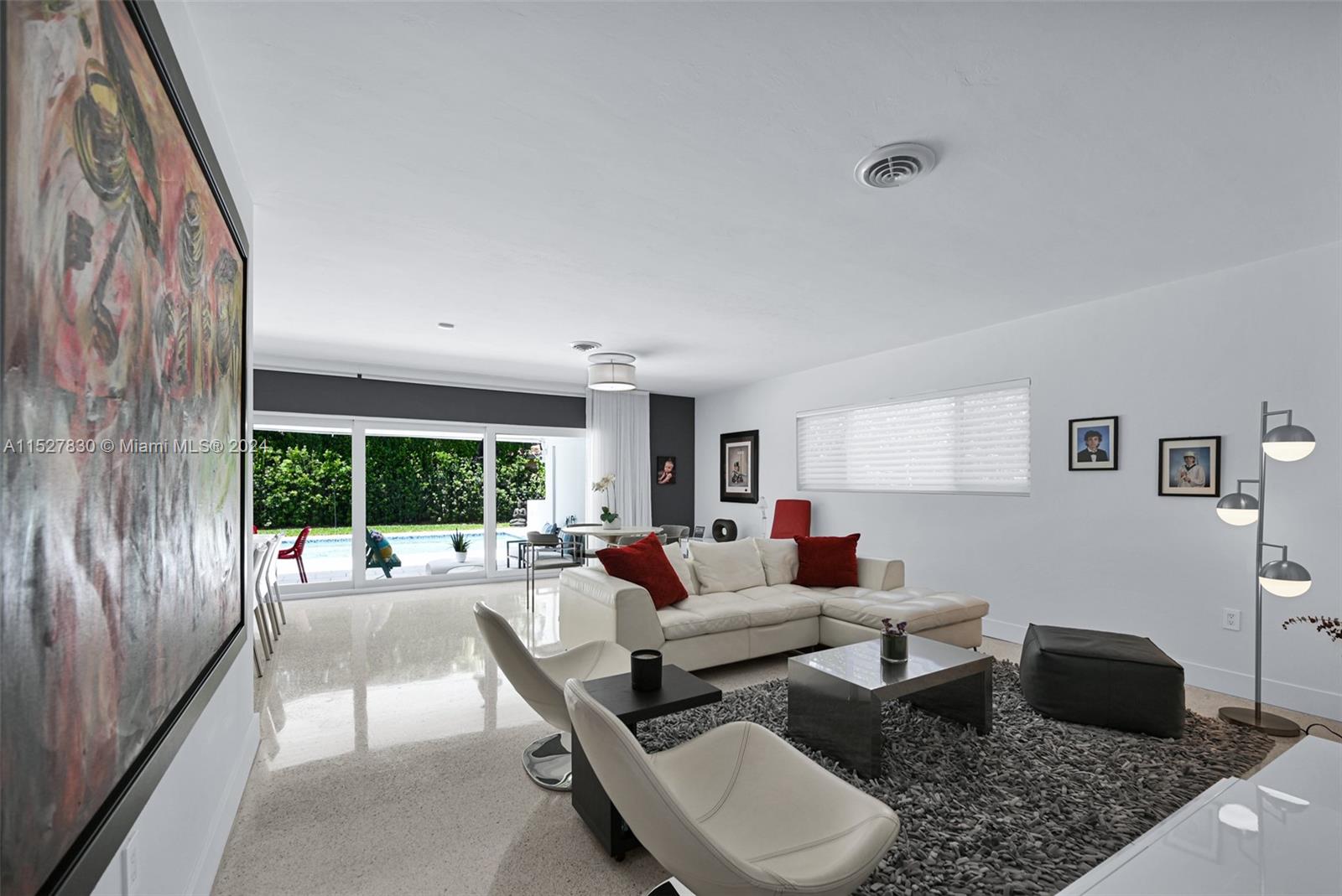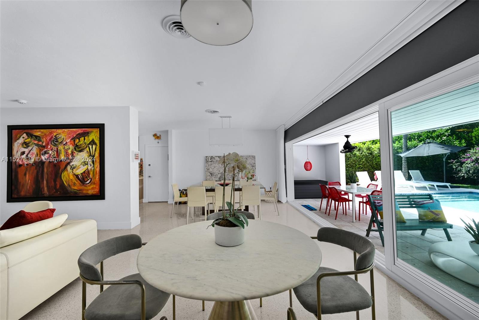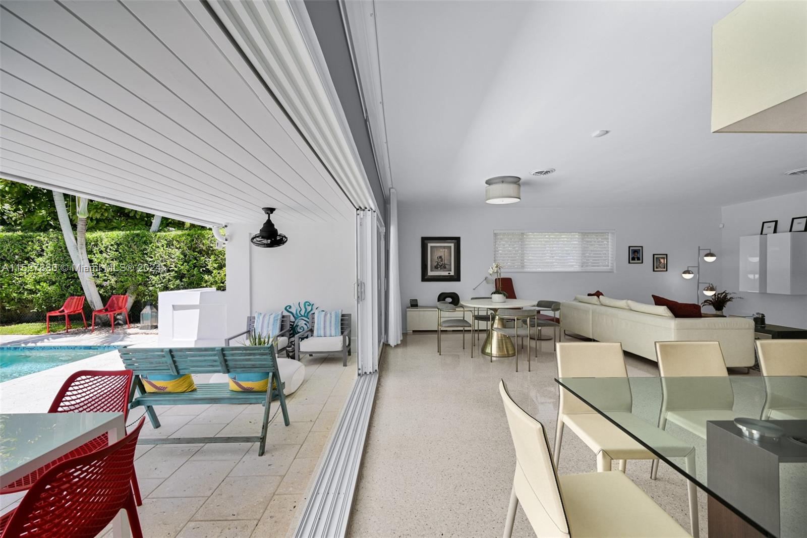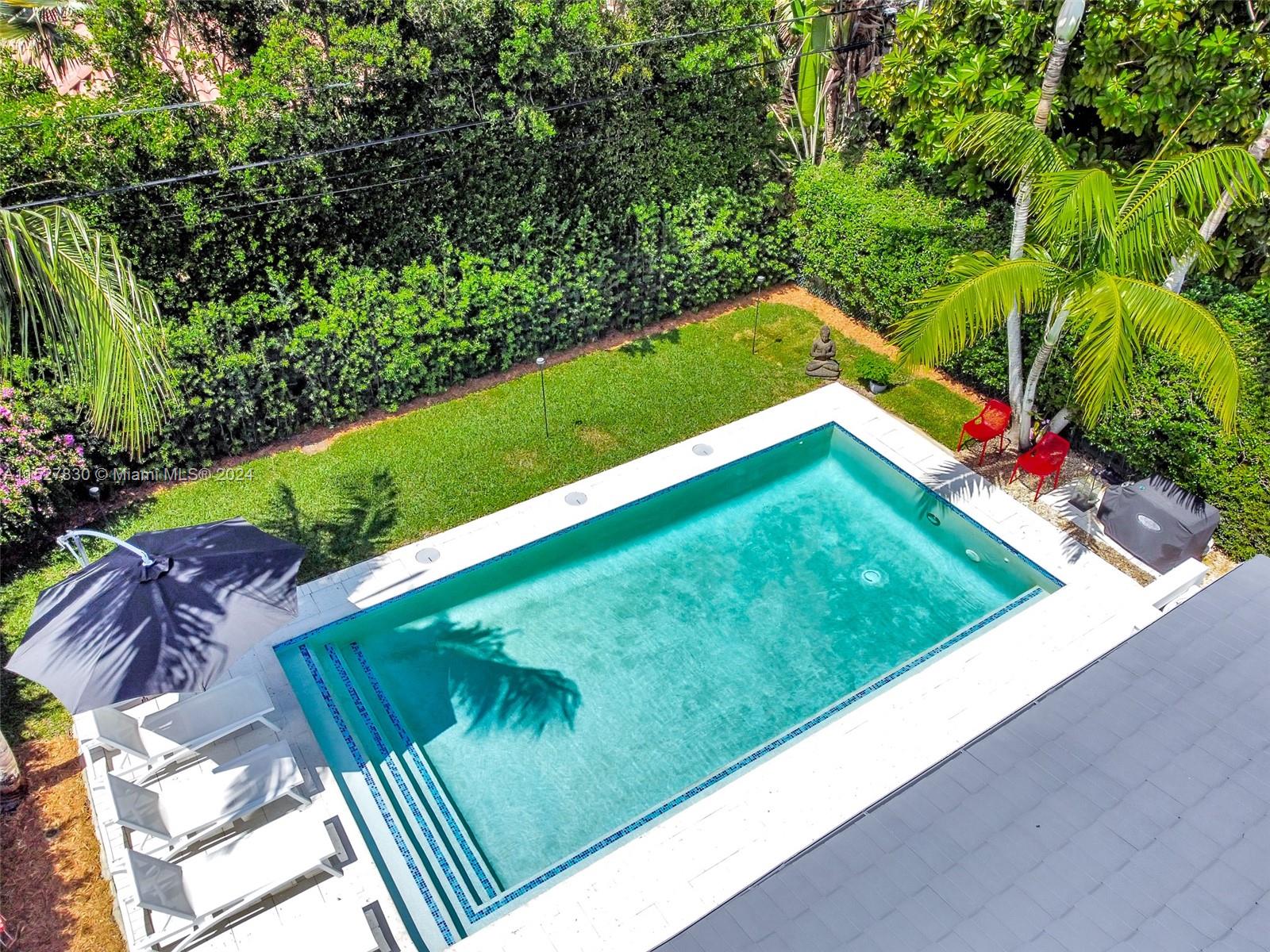 Excellent opportunity to own this modern home on prime location of coral gables golden triangle steps from Biltmore Hotel. Located in much desired tree lined street within walking distance to parks, recreation, markets and downtown coral gables. House has been updated with new bathrooms, high impact windows,italian kitchen with Miele and Sub zero appliances, bright spaces with separate dining, living and extra area to entertain. One car garage. Walk into a foyer which separates both entertaining spaces and your private 3 bedroom suites with many closet space. Walk out to private terrace/patio area from both dining living through wall to wall glass modern sliding doors combining the inside with the outside of home. Salt water pool and patio is privately fenced with surrounding landscaping.