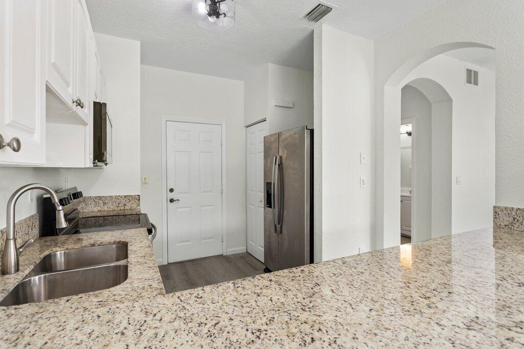 Fantastic Corner Lake View unit Townhouse in Gated Community 3 bedrooms, 2,5 bathrooms, 1 car garage and very large private backyard. kitchen with granite counter tops, stainless steel appliances, new flooring, and bathrooms, fresh painting, ac- unit outside new ,NEW PVC PIPES, lots amenities in Santorini at Vizcaya.