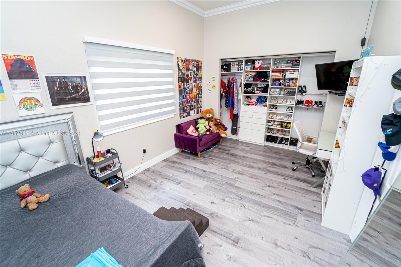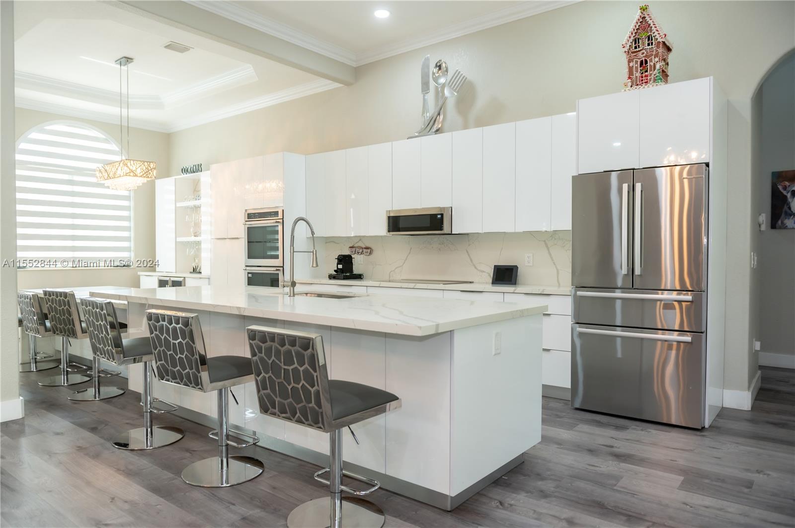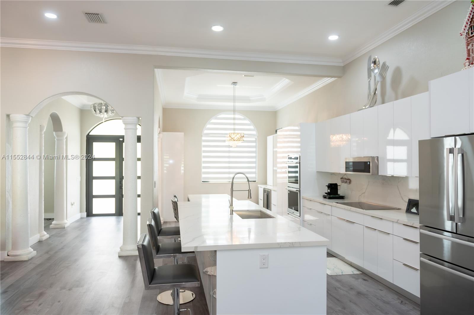 Welcome to this stunning 5-bedroom, 3-bathroom home located in the highly sought-after North Links Country Club in Hialeah. With its high hat ceilings reaching 12 feet, this residence immediately impresses with its sense of grandeur and sophistication. The splendid tri-split floor plan offers privacy and functionality, while the porcelain floors measuring 25 x 25 inches or larger add a touch of luxury. With electronic surveillance ensuring security and surround sound wiring enveloping the entire home, you'll experience a modern and seamless living environment. Situated on an oversized lot spanning 11,700 square feet, this property offers ample space for family and friends to gather and special occasions. The master bath boasts a spectacular bathtub, providing a luxurious retreat.
