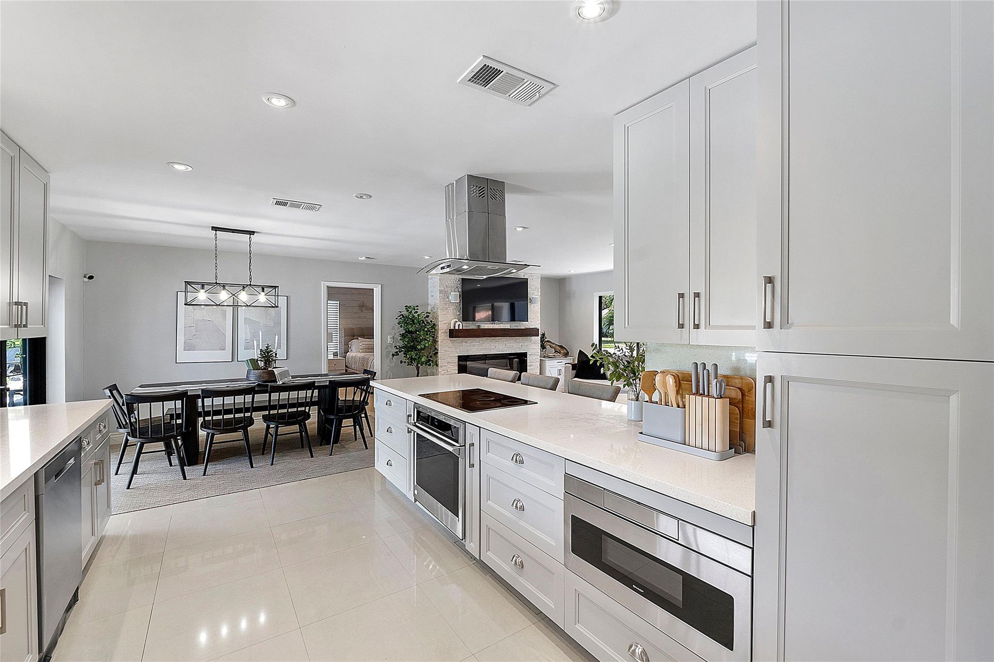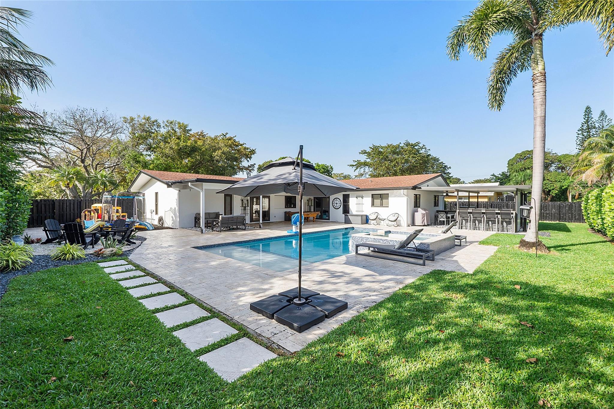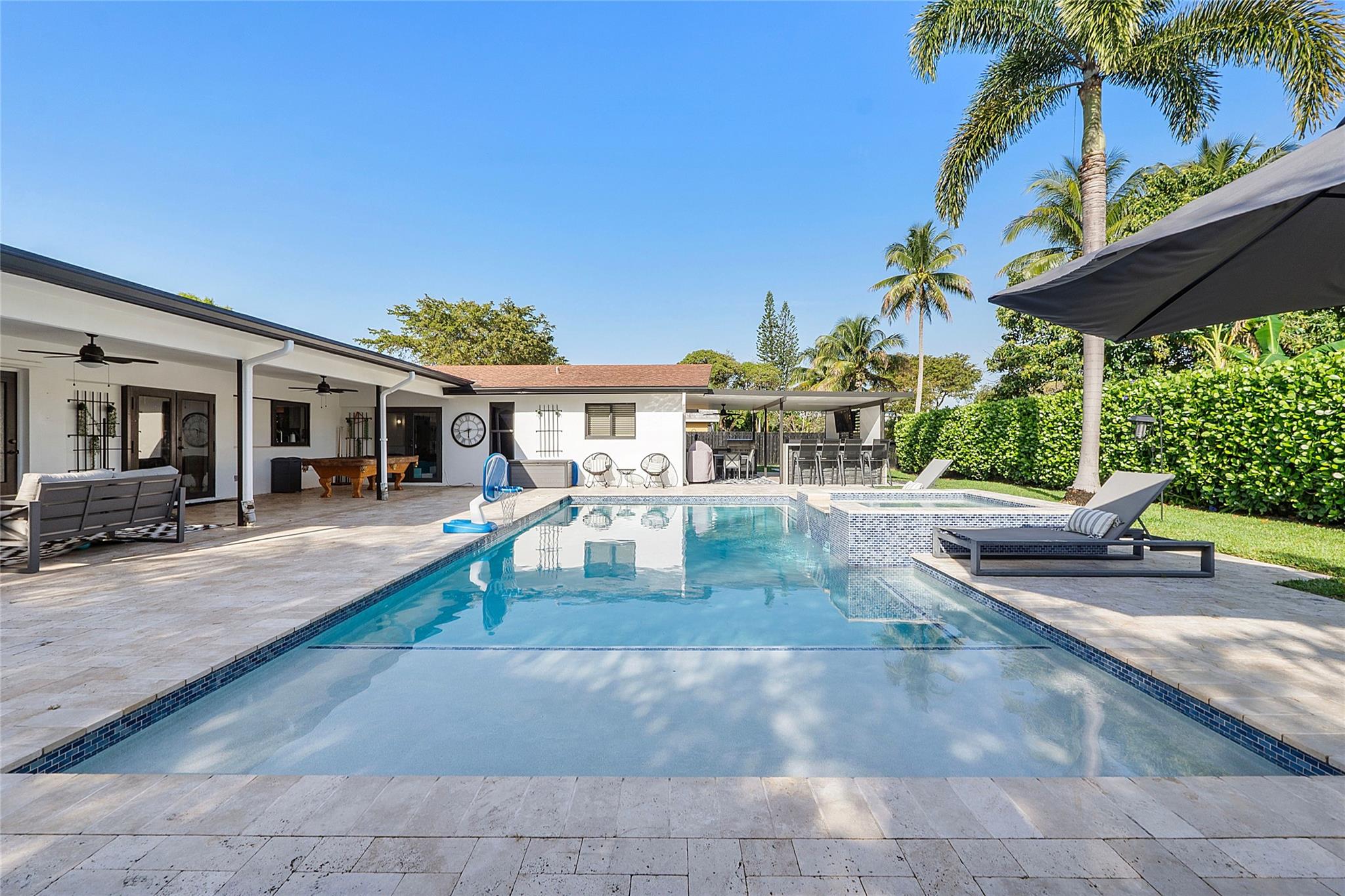 Step into luxury with this fully renovated home, featuring a contemporary open-concept layout. Enjoy a chef's kitchen with quartz countertops, custom cabinetry, and stainless steel appliances. The spacious living area boasts a stunning quartz fireplace wall. Retreat to the owner suite with a walk-in closet and spa-like bathroom. Additional upgrades include a half bath,laundry room,updated lighting,tankless water heater, Rainsoft whole house water system,and reverse osmosis drinking system. Outside, a 37' pool with LED-lit waterfall spa creates a serene outdoor oasis, complete with a brand-new pergola and built-in kitchen. Stay refreshed with a spritzer water system for plants , gorgeous lanscaping. This home offers the perfect blend of modern luxury and functionality.