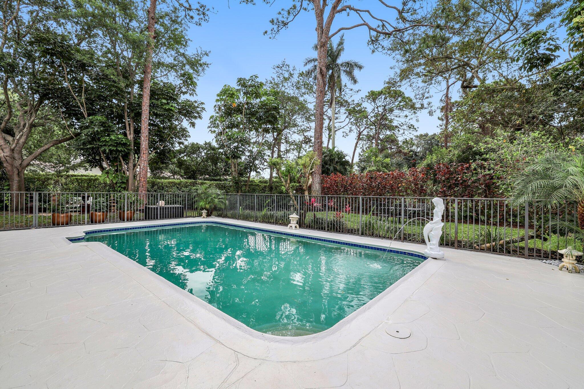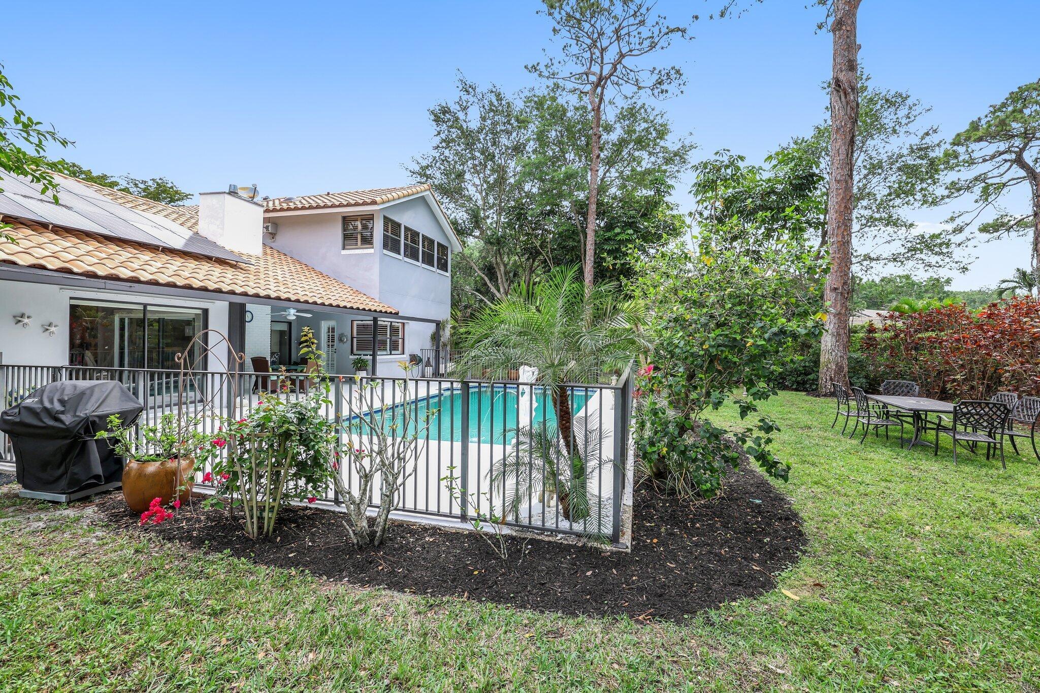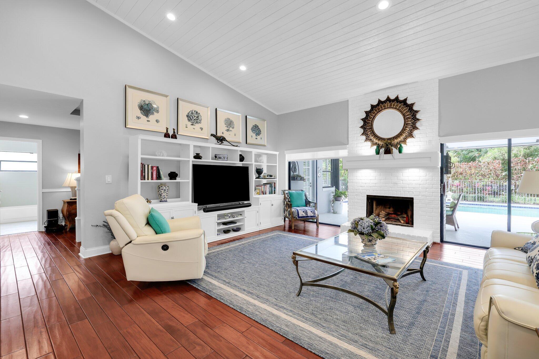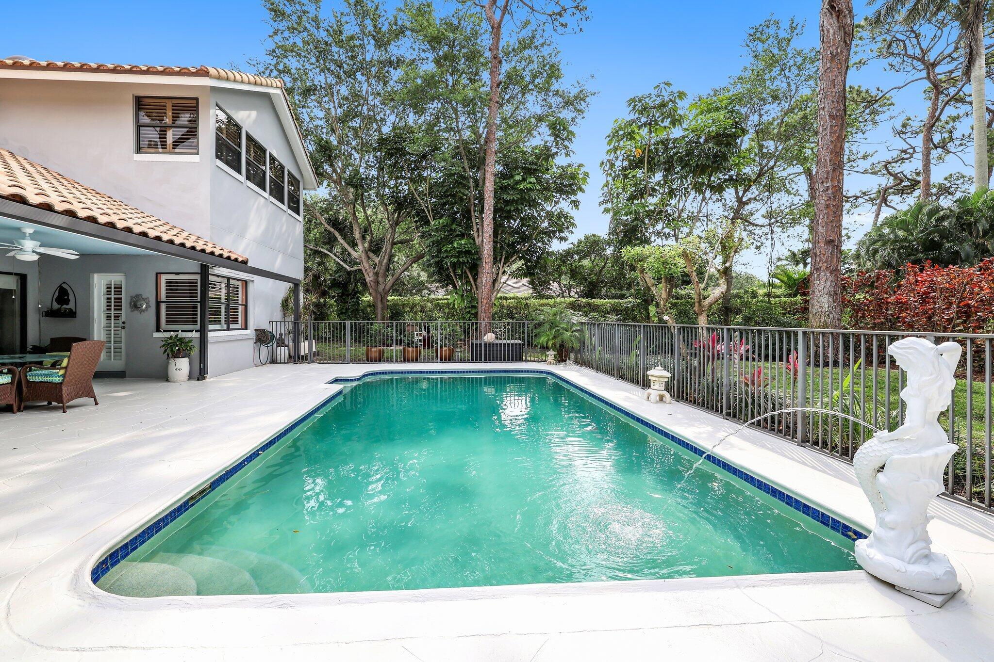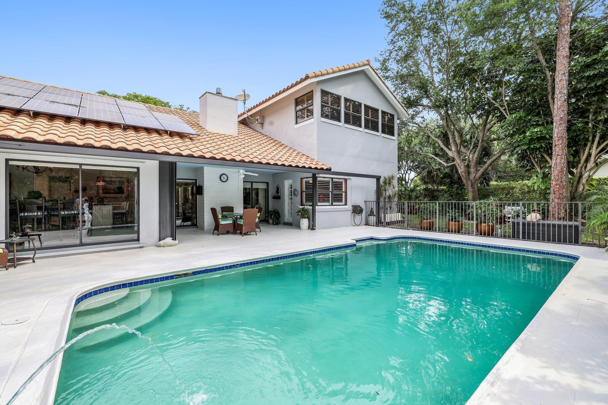 Located in sought-after Millpond in Boca Raton, this elegant home features wood floors, expansive windows, and sliding glass doors, filling the space with natural light. With a spacious open floor plan, shiplap cathedral ceilings, and a cozy fireplace, it offers 3 bedrooms downstairs (one primary) and one bedroom upstairs (second primary) with a stunning loft/office/den with garden views. The masterful chef's kitchen boasts quartz countertops, stainless steel appliances, large pantry w lazy Susan, rolling island and custom window treatments. Outside, enjoy a private backyard with a large fenced in pool, lush landscaping, no rear neighbors and whole house solar panels. Close to Town Center Mall, top-rated private and public schools, beaches, parks and entertainment, Best location in Boca.