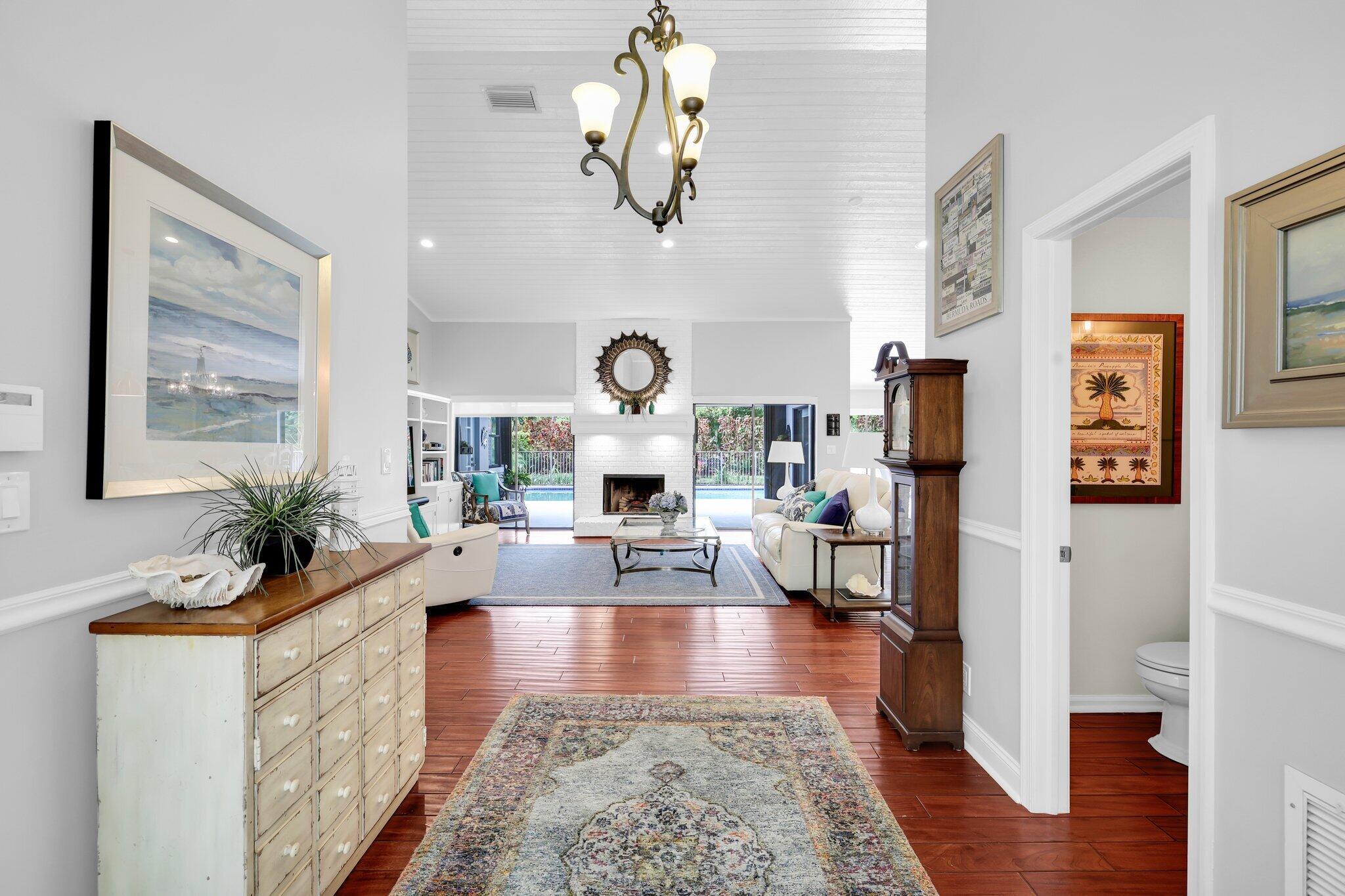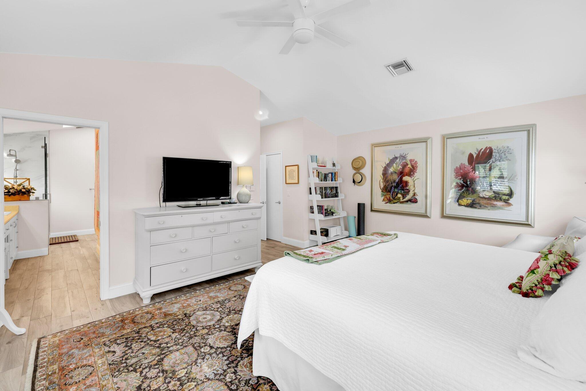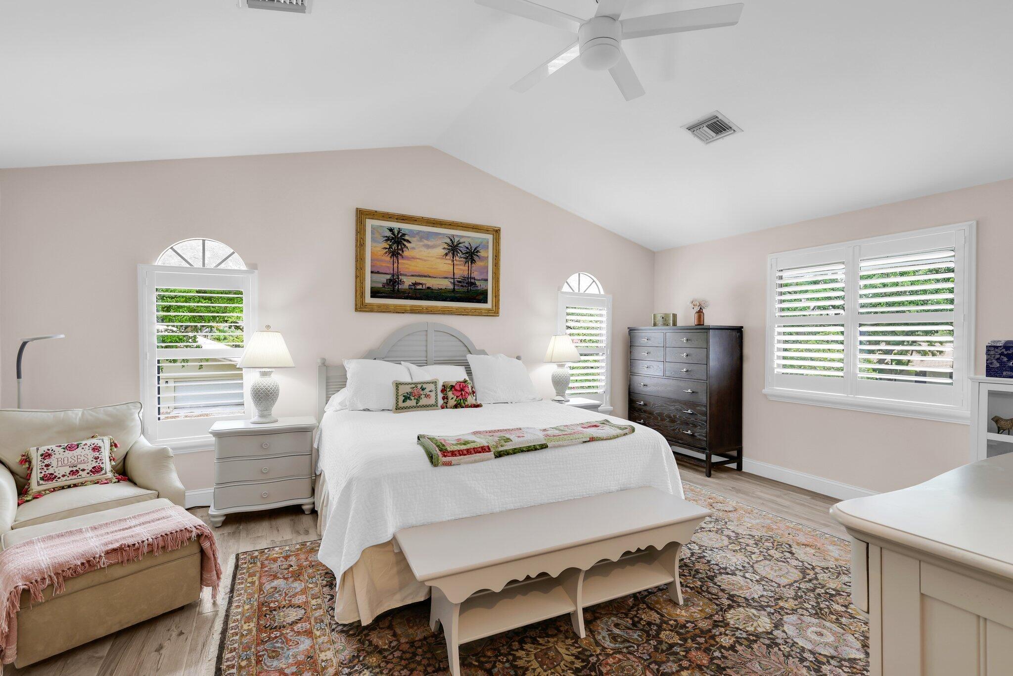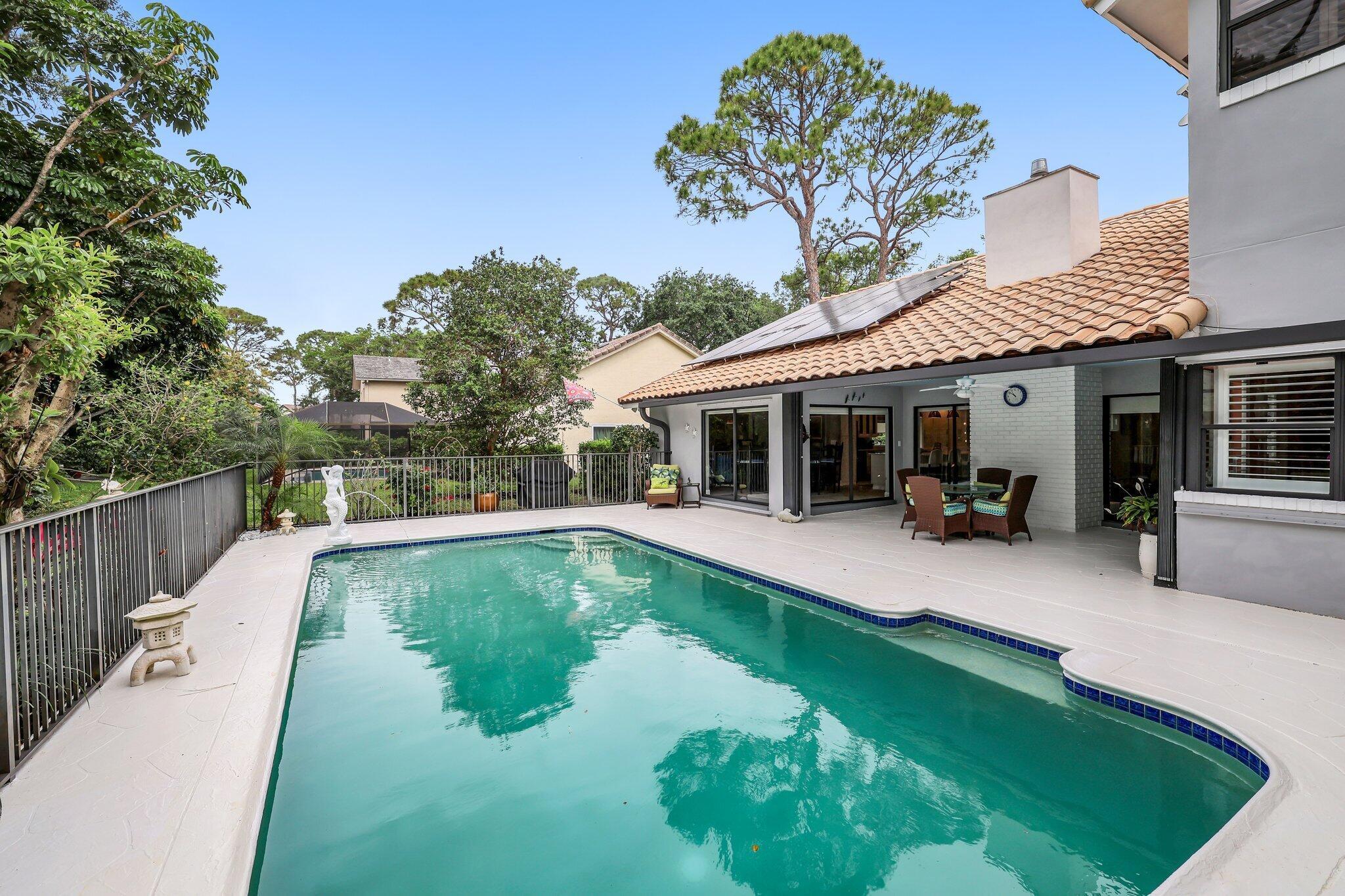 Located in sought-after Millpond in Boca Raton, this elegant home features wood floors, expansive windows, and sliding glass doors, filling the space with natural light. With a spacious open floor plan, shiplap cathedral ceilings, and a cozy fireplace, it offers 3 bedrooms downstairs (one primary) and one bedroom upstairs (second primary) with a stunning loft/office/den with garden views. The masterful chef's kitchen boasts quartz countertops, stainless steel appliances, large pantry w lazy Susan, rolling island and custom window treatments. Outside, enjoy a private backyard with a large fenced in pool, lush landscaping, no rear neighbors and whole house solar panels. Close to Town Center Mall, top-rated private and public schools, beaches, parks and entertainment, Best location in Boca.