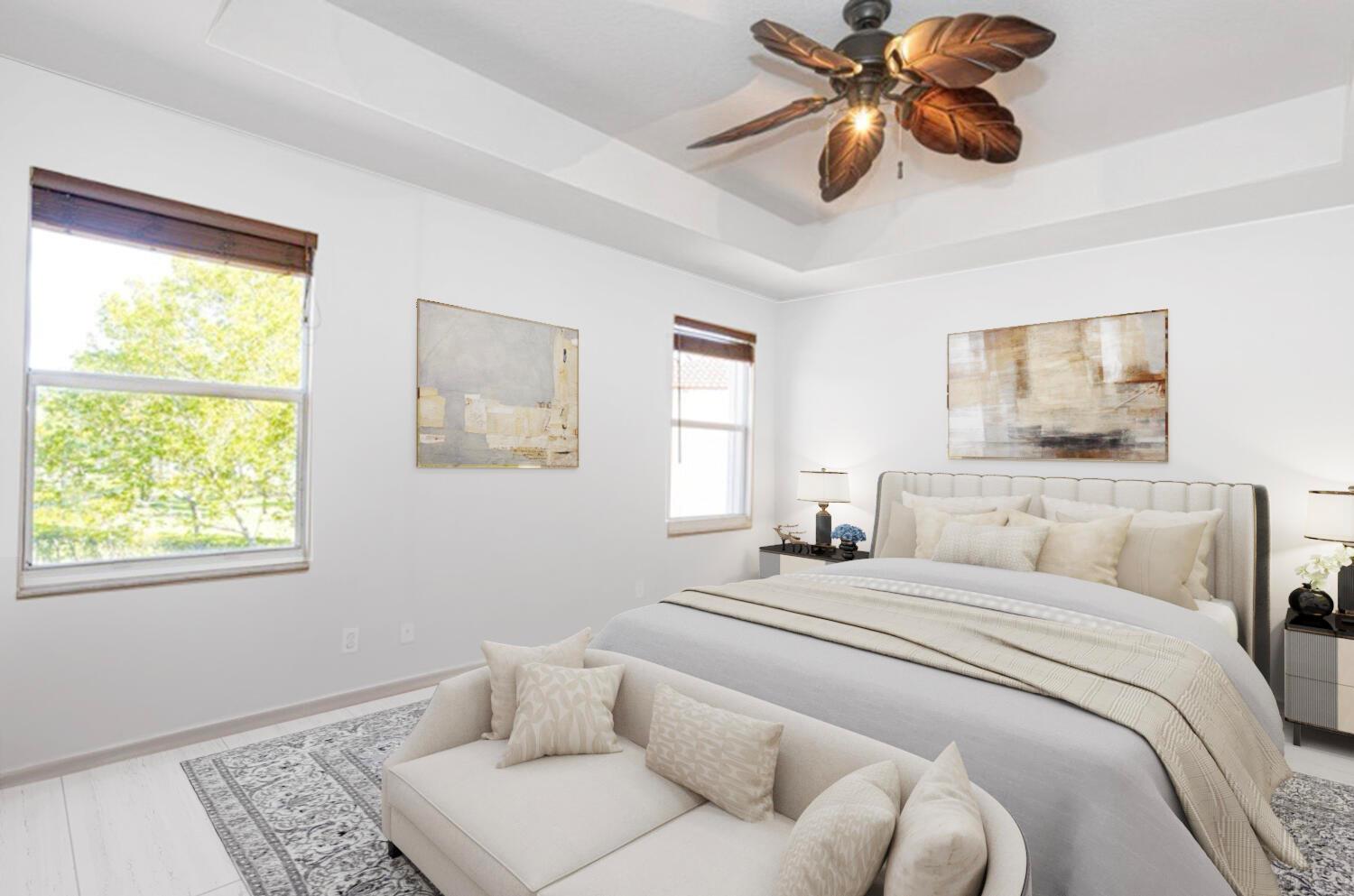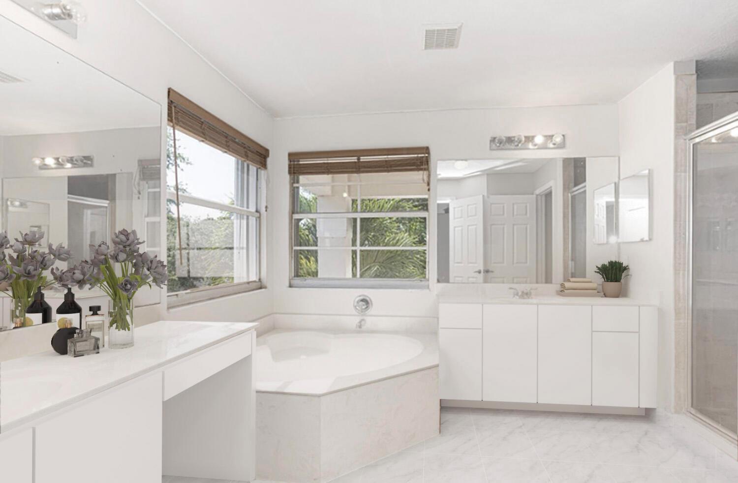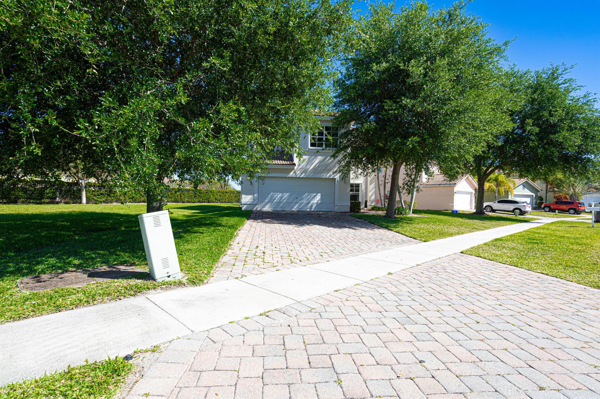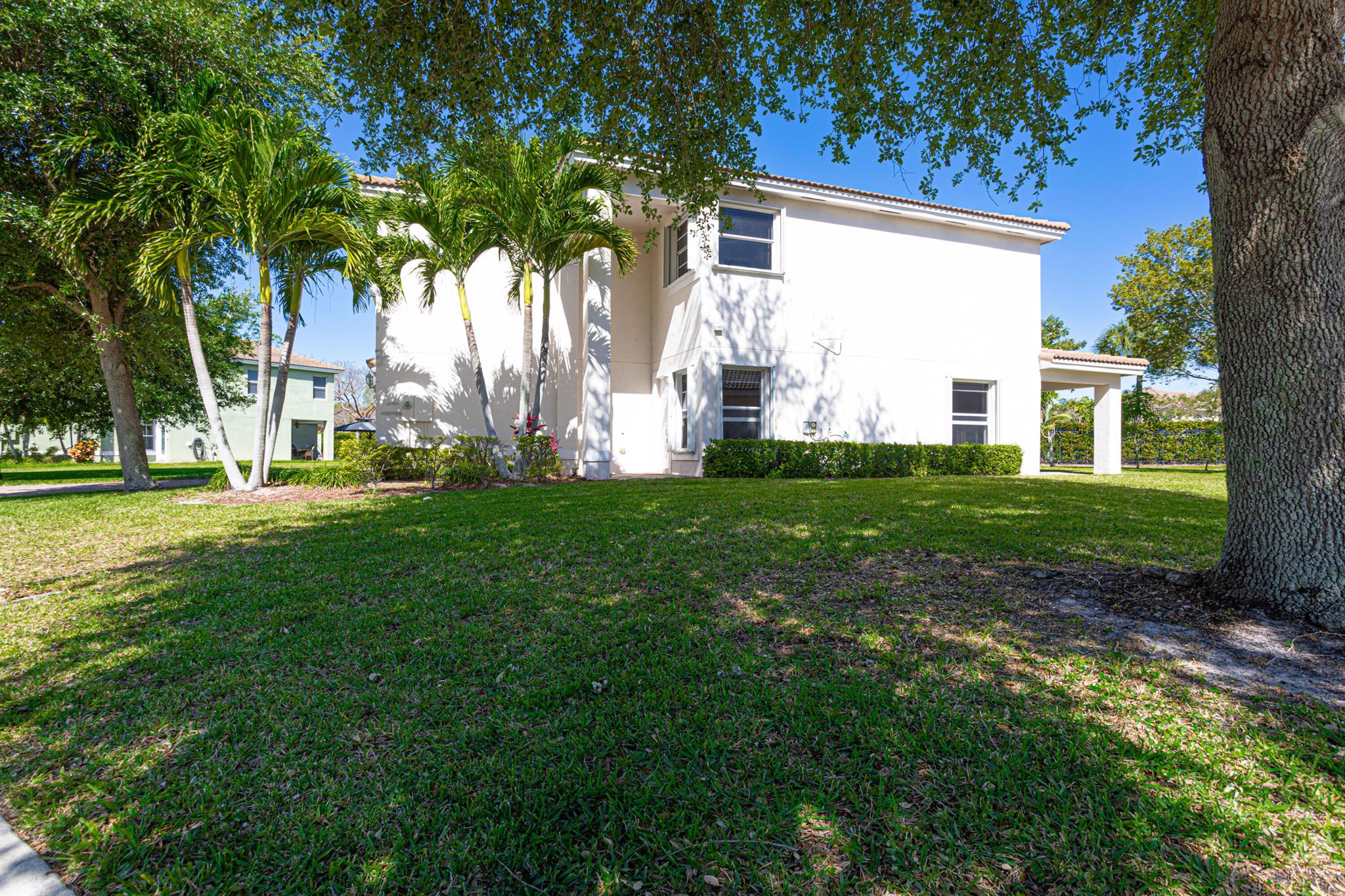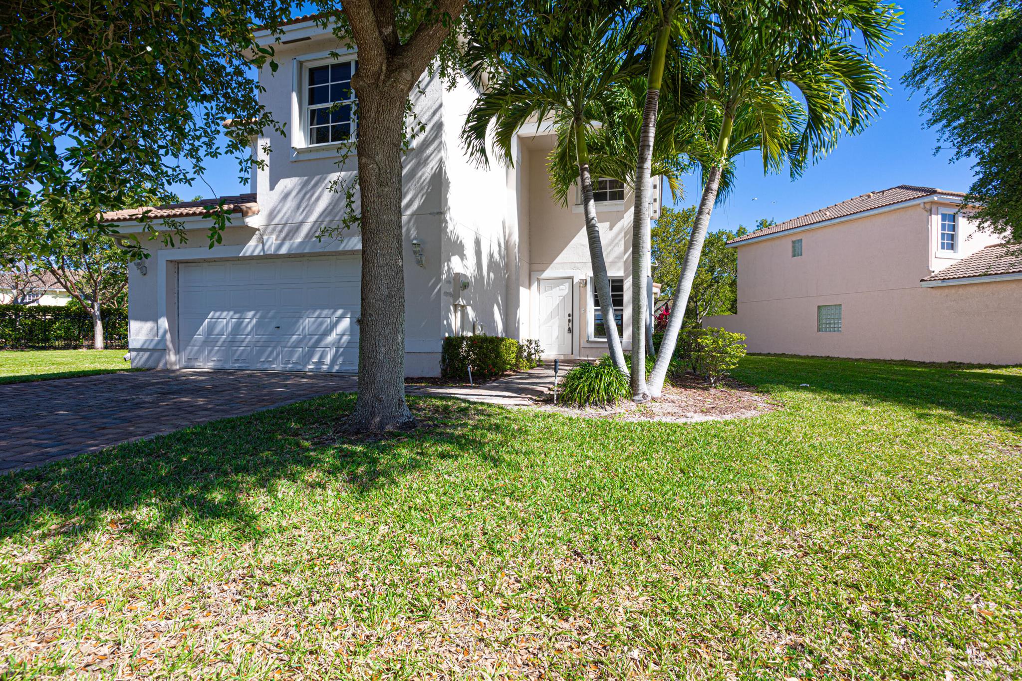 Beautiful 4 bedroom 3 1/2 bath home with 2 master bedrooms. 2,926 total sqft with 7 parking spaces, including a 2 car garage. Plenty of room for a pool with one of the biggest lots in the neighborhood. Open concept home features a large living and family room, updated kitchen, walk in pantry. Freshly painted and now with brand new A/C unit. Large master suite boasts of his and hers closets, a roman tub, and double vanities. Your guests will feel comfortable in their own master suite complete with its own bathroom and tub. Mature shade and fruit trees. Enjoy low HOA fees, community pool, children's playground, and tennis court. Close to Florida Turnpike, and minutes to PBIA airport, and I-95.