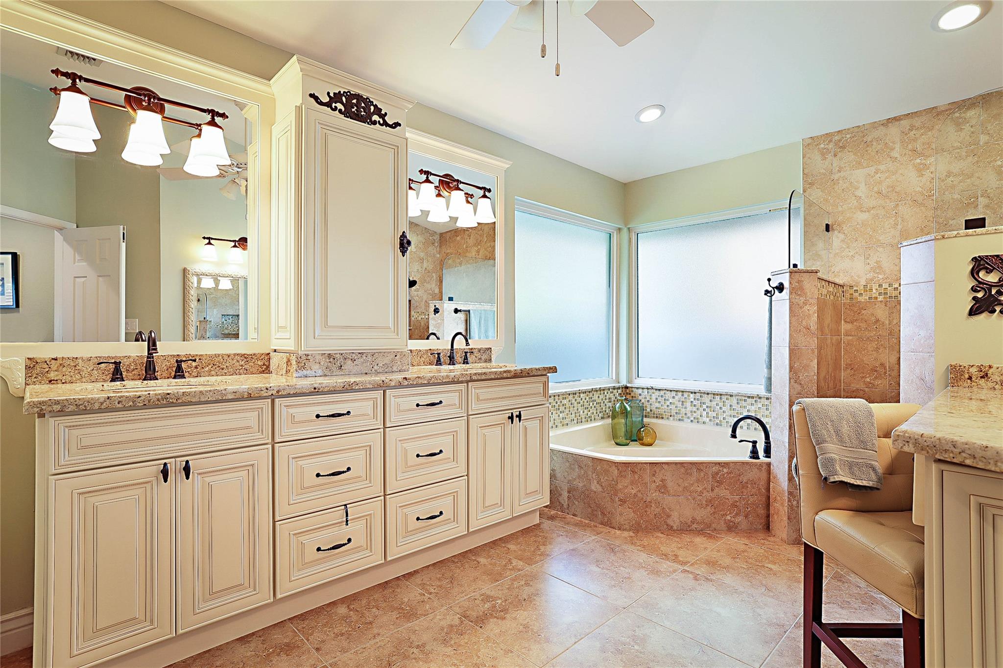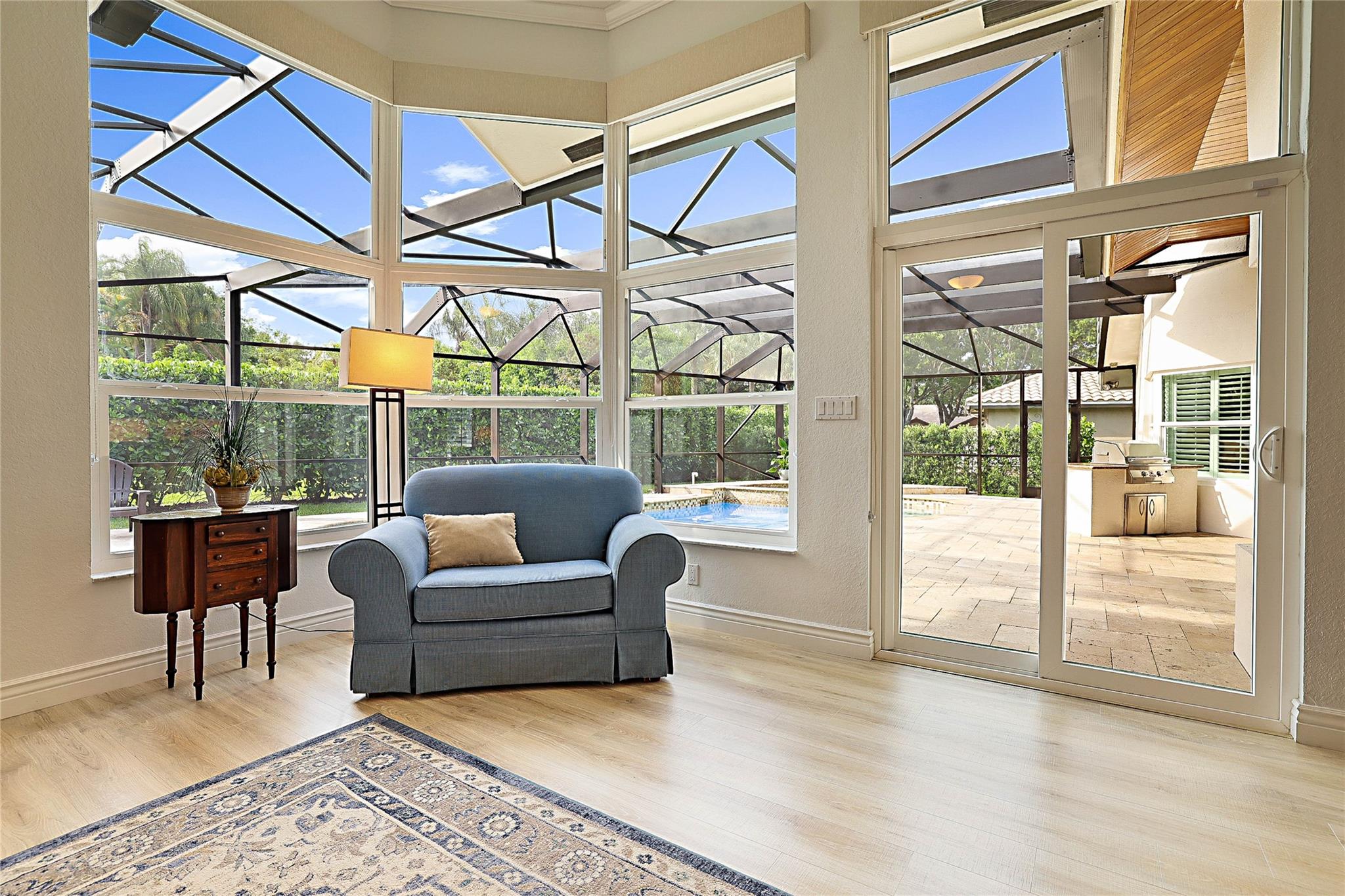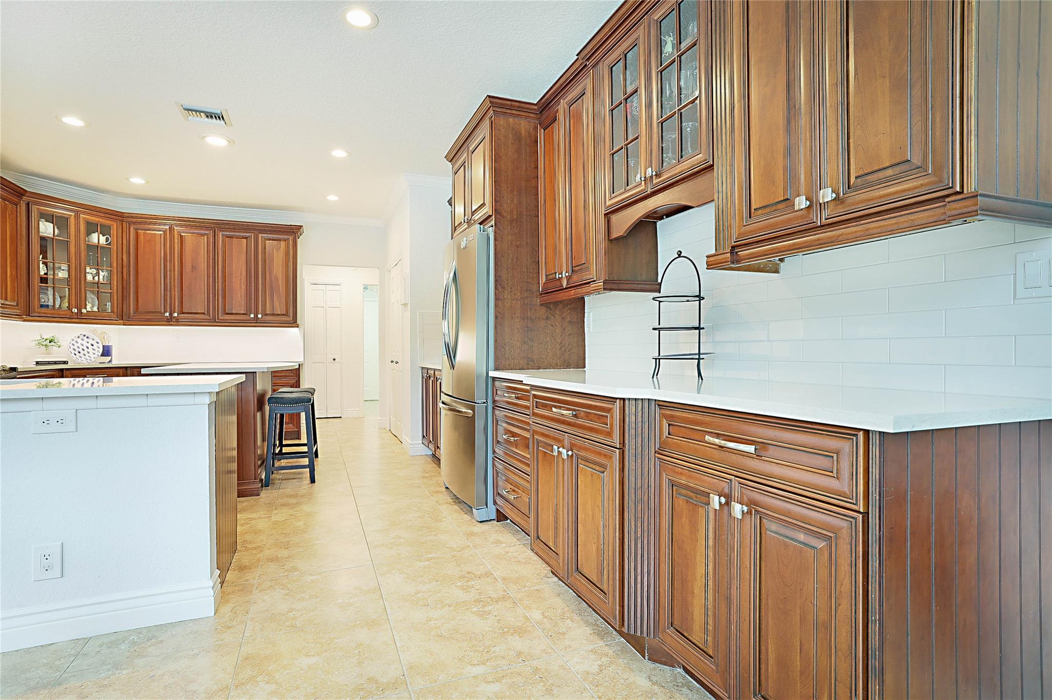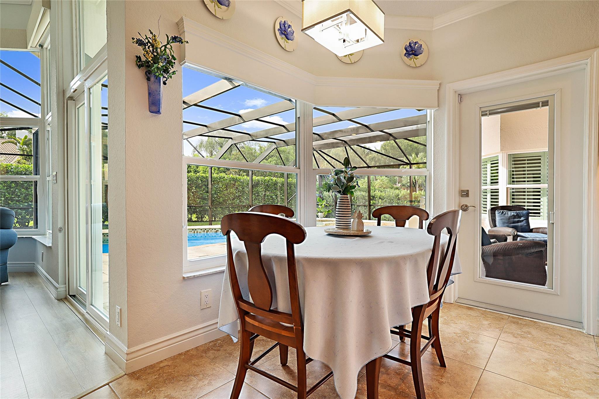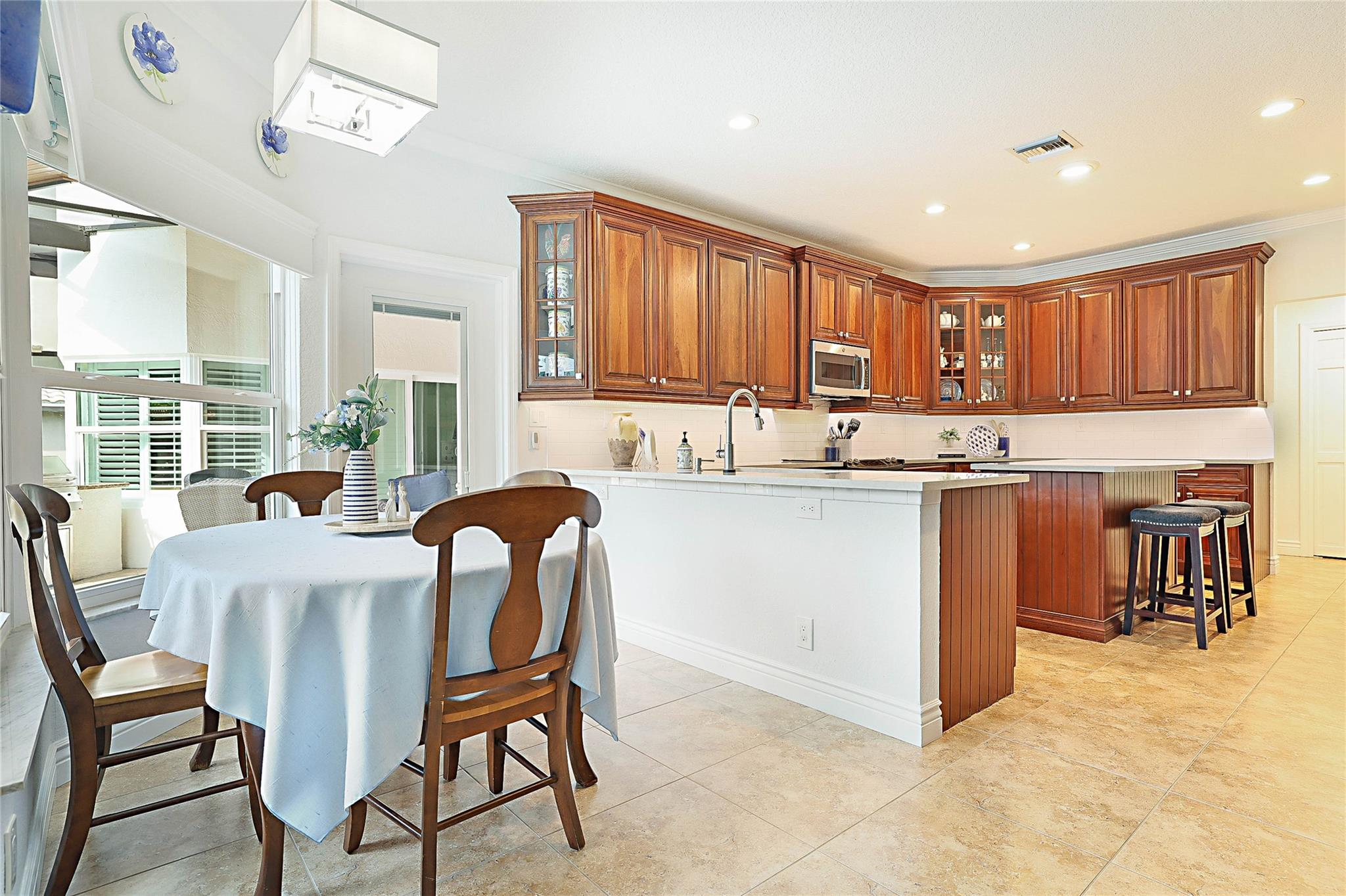 Beautiful Custom Home in Pine Ridge! Spacious Split Floor plan everything UPDATED: All Tile or Laminate Floors, Knockdown Ceiling/Walls, Plantation Shutters, Blinds, LED Hi-Hat lighting. Gourmet eat-in Kitchen: S/S Appliances, extensive Custom Cabinets, new Quartz Counters, Subway Tile Back Splash, Work Station Sink & Touch Faucet. 4 Spacious Bedrooms, Primary with huge Walk-in Custom Closet, Sitting Area. 3 Full baths with newer Cabinets, Granite Counters, Tile. Extras: Crown Molding, 5" Base Boards, A/C 2018, HWT 2022, Impact Windows & Doors 2019, Oversized Garage w/Workshop, Custom Cabinetry & Epoxy Floor. Oversized Travertine Patio, Diamond Brite, Salt Water Pool, Hurricane rated Screen Enclosure with new Screens, Built-in InfraRed Grill, Sink, Alarm System w/Cameras. As-Is! Low HOA.
