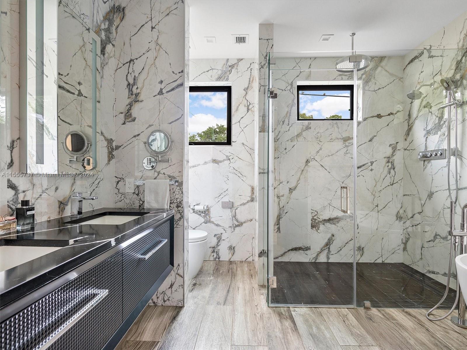 A newly built extraordinary Miami Shores listing east of Biscayne Blvd sits on an expansive 18k sq ft triple lot. The modern marvel showcases a Tesla roof with 72 hours of electrical energy, a surround system, an outdoor kitchen, a heated salt system pool w/marble deck, an outdoor shower, two AC units, and a water filter. It also has a two-car garage, carport, basketball court, and alarm system with cameras. Discover this magnificent home w/ 5 bedrooms adorned w/motorized blinds, an additional den/office &/or gym, and 5 bathrooms with upscale Koehler finishes. The chef's kitchen boasts Sub-zero and Wolf appliances. This epitomizes elegance and functionality for the discerning homeowner in a newly constructed haven.
