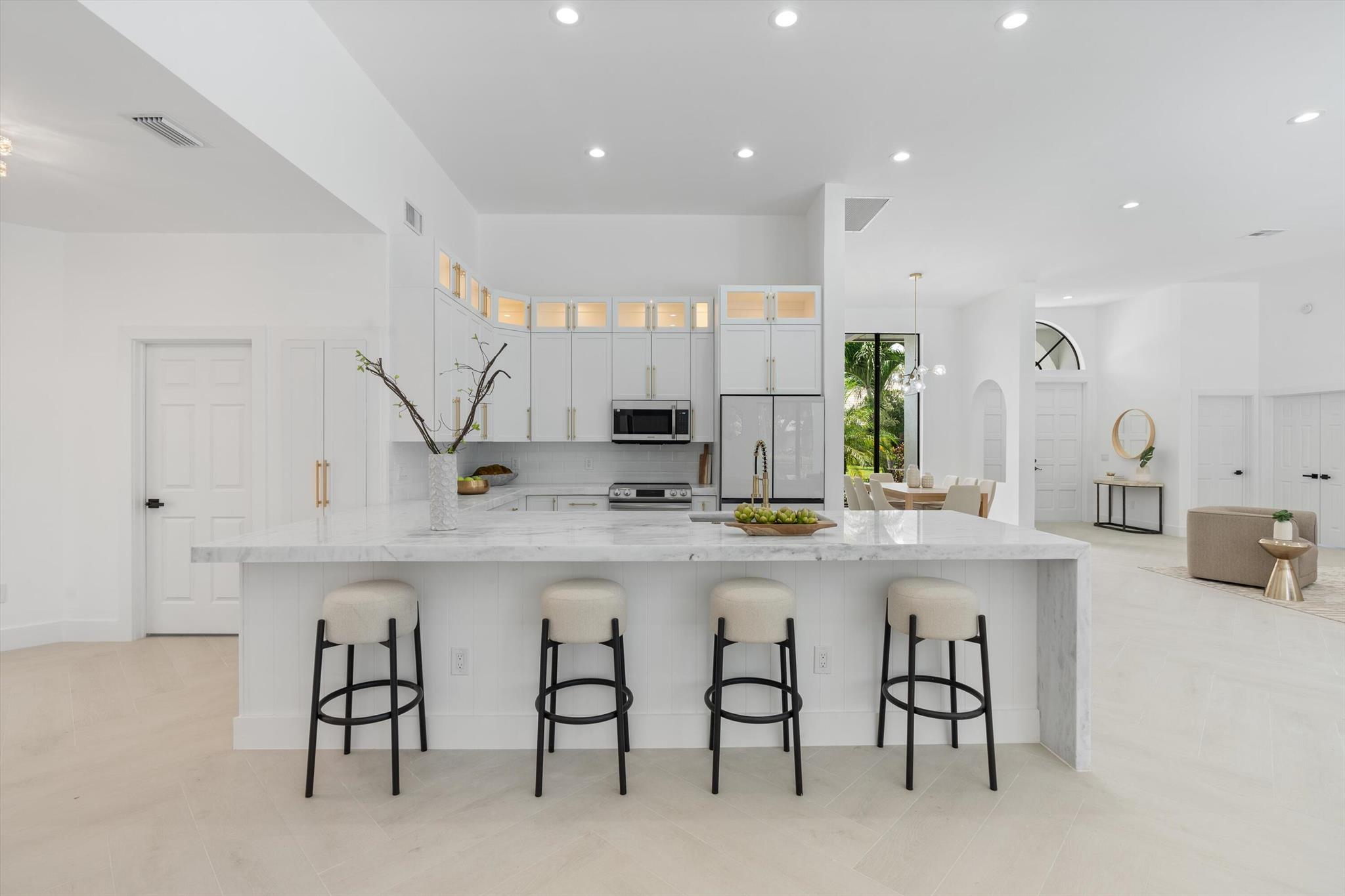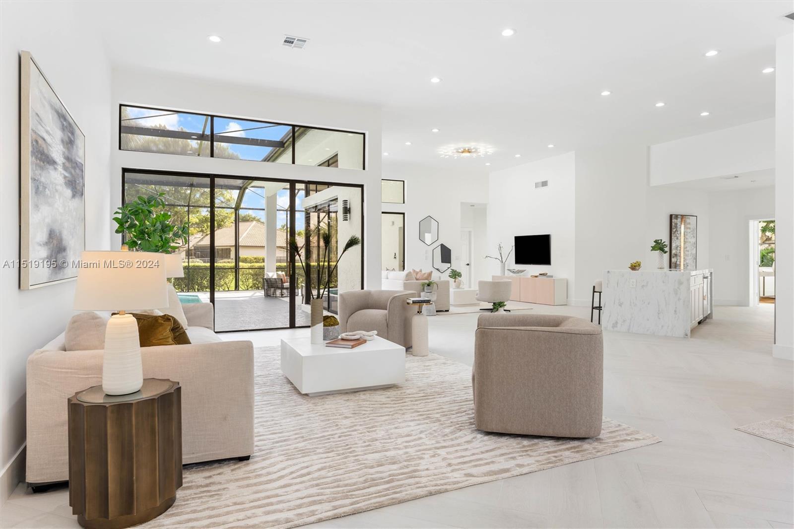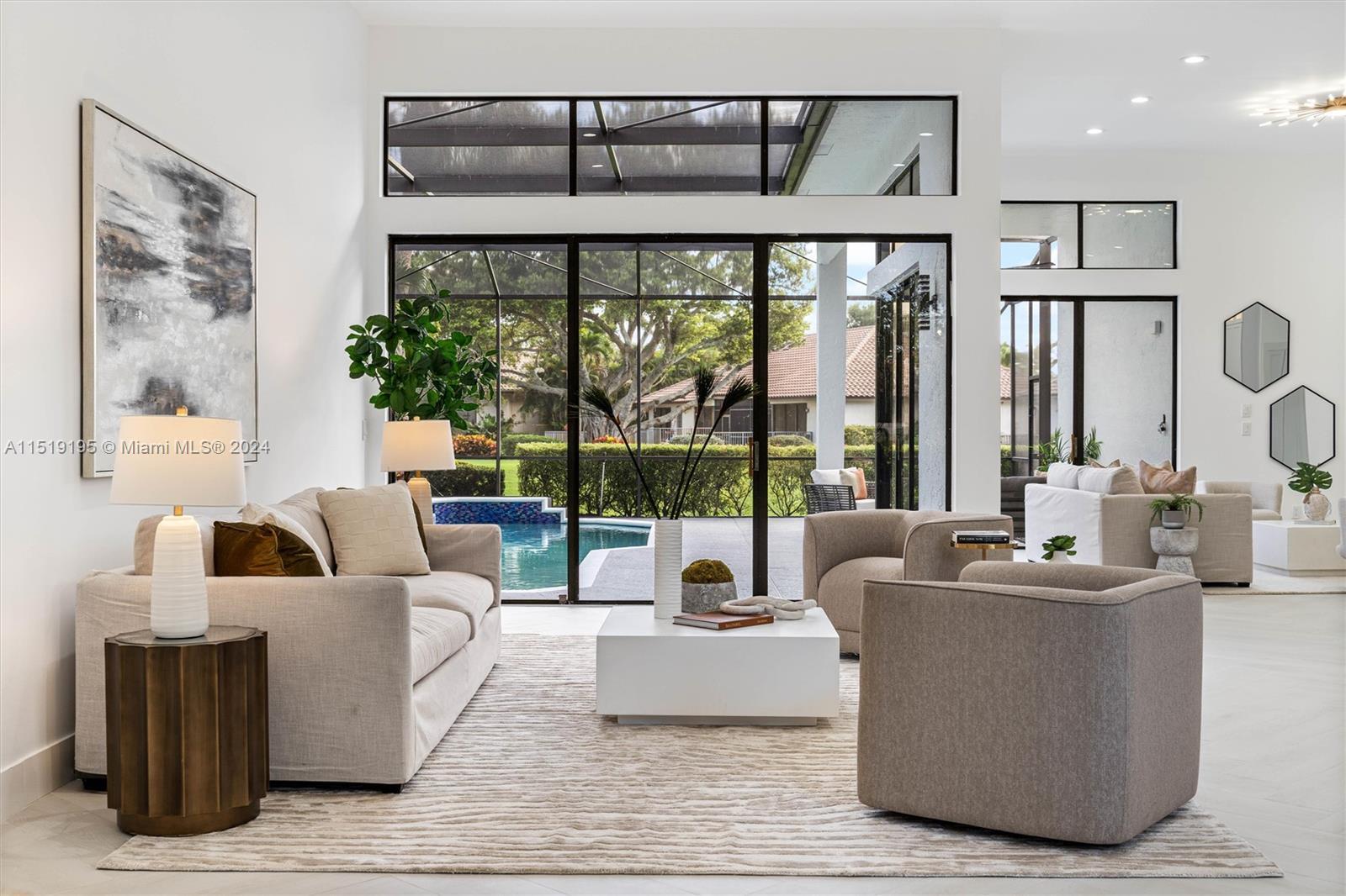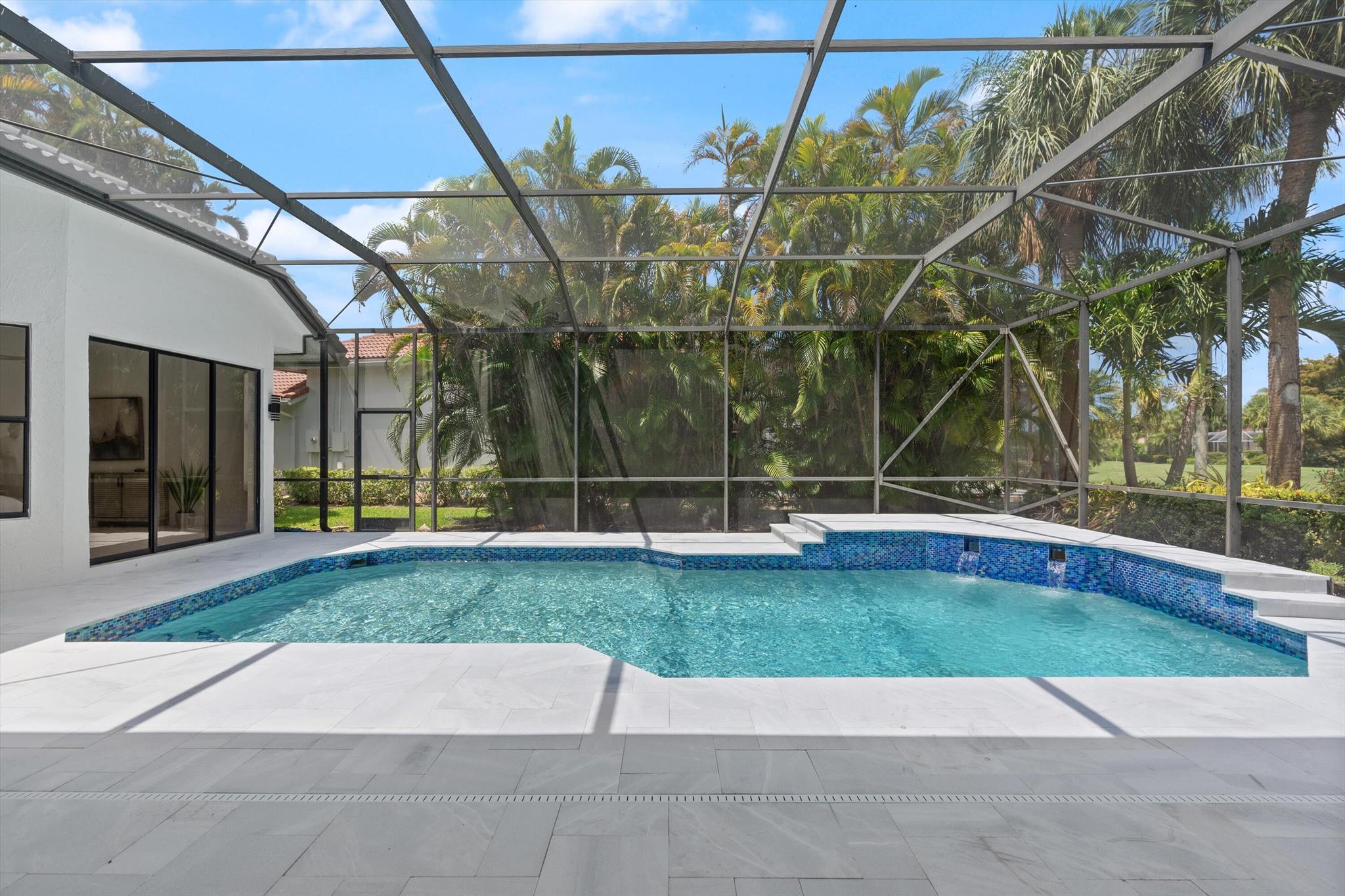Stonebridge country club in West Boca Raton fully remodeled and stunning 4 bedroom showcase home with screened in swimming pool. A newer roof punctuates this gorgeous and large home that has been renovated to the highest exacting standards. Chevron laid porcelain wood look tile floors, brand new EVERYTHING, including all new kitchen with top of the range model stainless steel appliances, lighted custom cabinetry, and hosting island with quartzite waterfall countertops plus seating. Floor to ceiling windows with 24' ceilings highlight the outside pool area and give the home an immense feel and look. Master bath with slipper tub, and walk in flush laid infinity tile shower with rain head and individual handheld wand. This custom masterpiece is truly second to none with tons of upgrades.