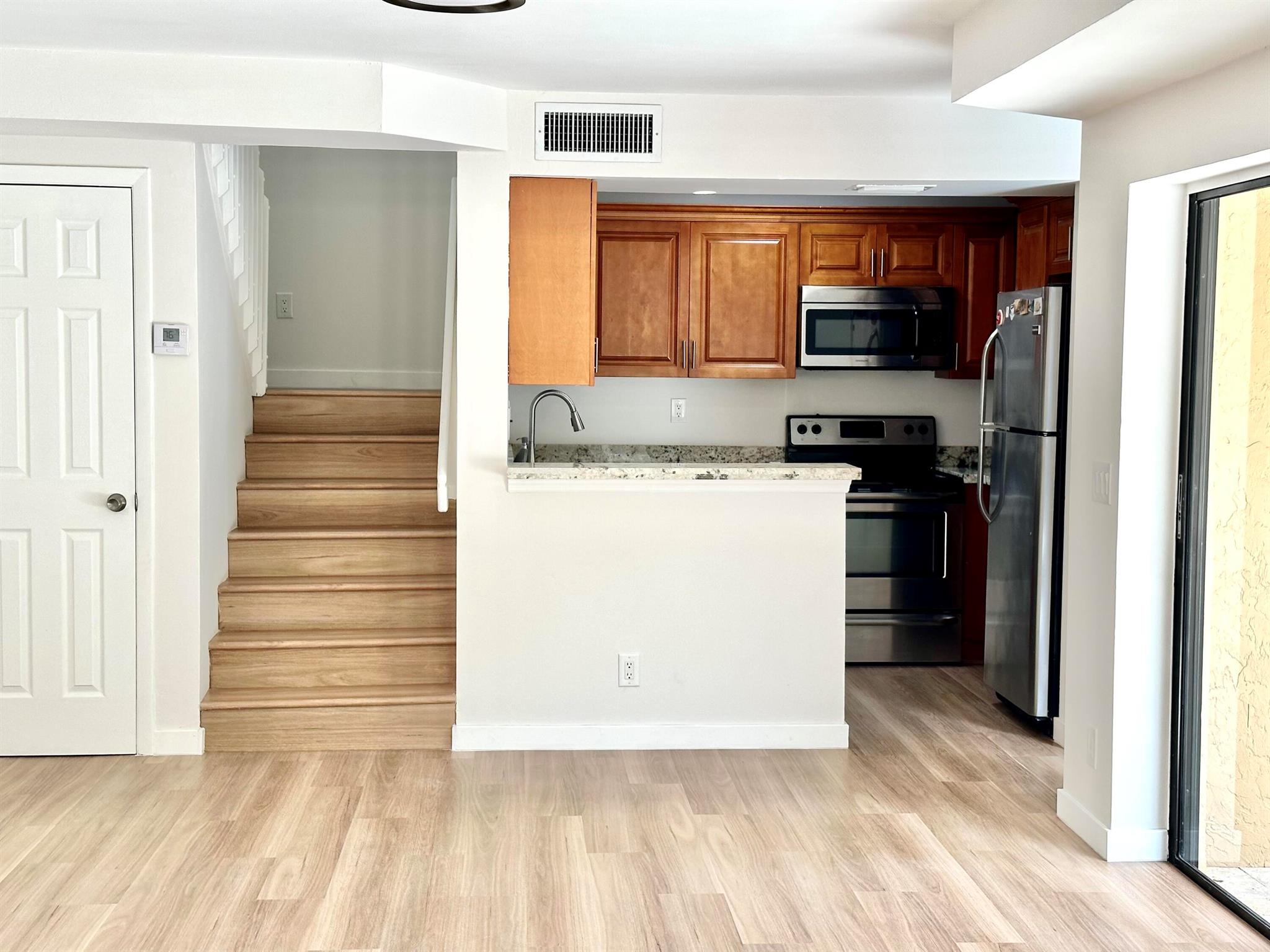 TASTEFULLY RENOVATED, SPACIOUS 3 BEDROOM, 3 FULL BATH CORNER TOWNHOUSE HAS A PRIVATE FENCED-IN FRONT MARBLE PAVER PATIO OFFERING MORE PRIVACY IN A GREAT NEIGHBORHOOD, CENTRALLY LOCATED IN BOCA RATON TOP RATED SCHOOL DISTRICT. NEW 2024 AIR CONDITIONING; BRAND NEW LUXERY VINLY FLOORING, ALL 3 BATHROOMS ARE RENOVATED, FRESHLY PAINTED WITH NEW LIGHT FIXTURES. NEWLY KITCHEN CABINETS WITH GRANIT COUNTER TOP. THE COMMUNITY FEATURES HEATED POOL, TENNIS COURT, RACQUETBALL COURT, BIKE PADS, GREAT SCHOOLS, CLOSE TO TURNPIKE, SHOPPING PLAZAS, RESTAURANTS. ASSIGNED PARKING AND GUEST PARKING IN FRONT OF THE PROPERTY...