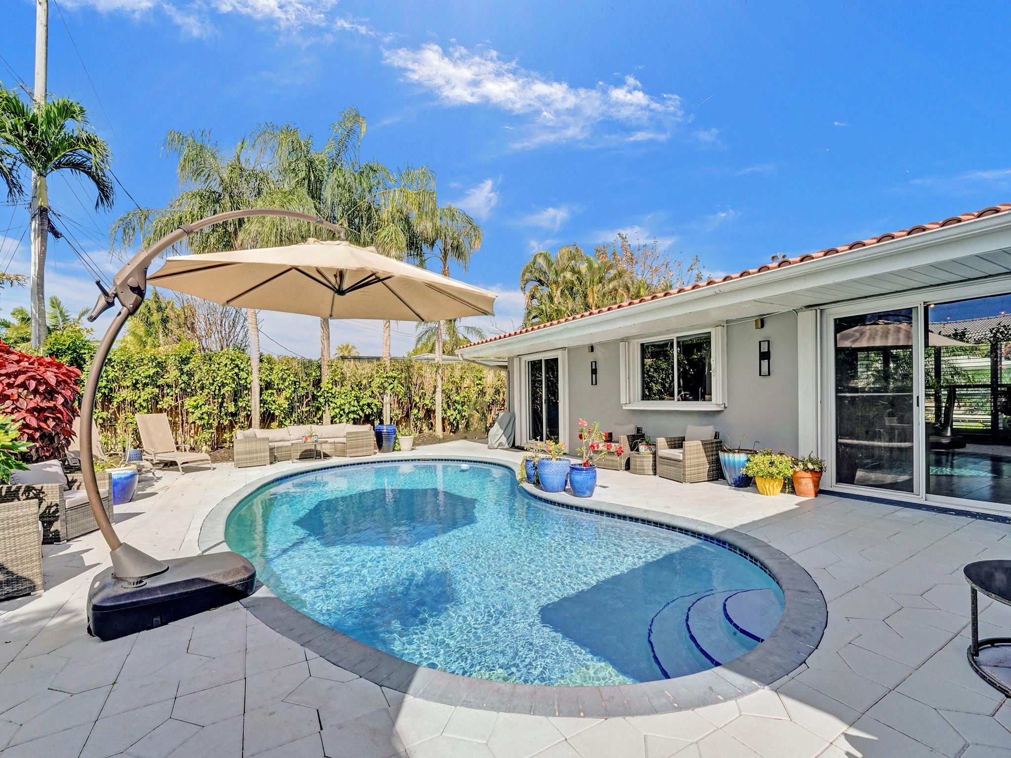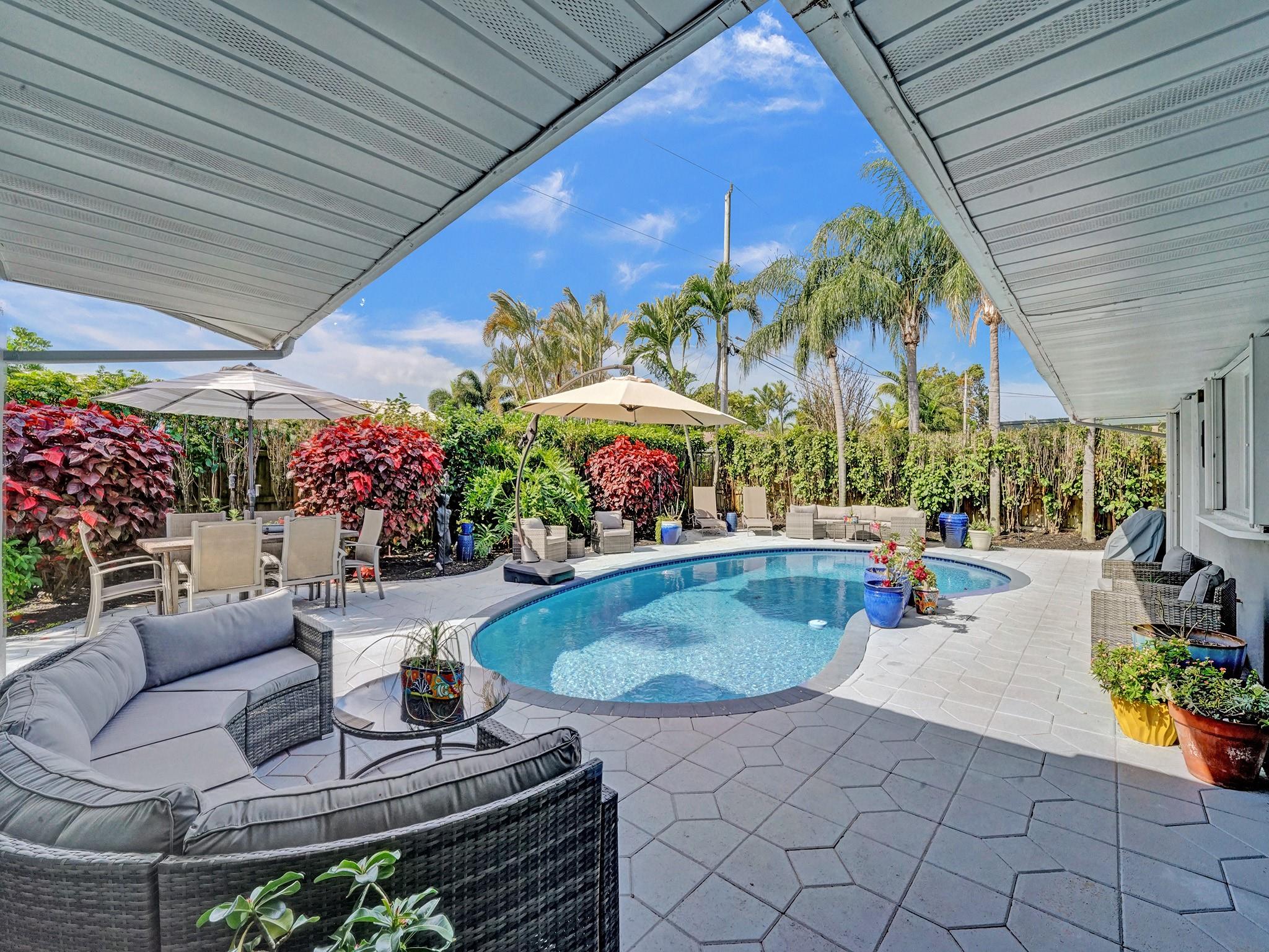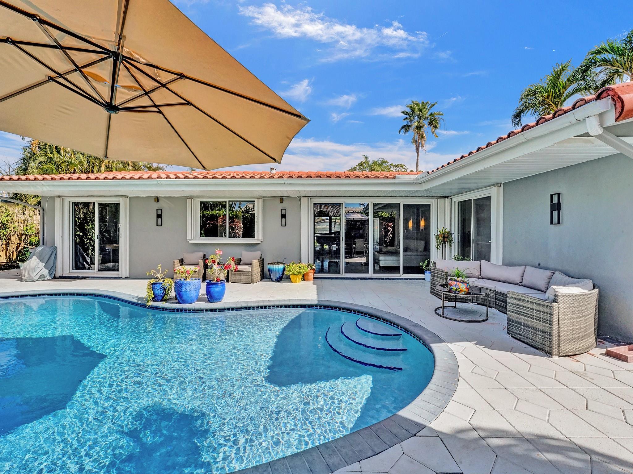 Your DREAM Imperial Point corner lot home awaits, featuring 3 beds, 2 baths, (3rd bedroom doesn't have closet), complemented by a private heated pool & a 2-car garage. Open concept layout, with consistent tile throughout , ideal for entertaining. A notable highlight is the neutral grey paver driveway seamlessly matching the pool deck. Additionally, it includes plantation shutters, an oversized closet in the primary bedroom, & a kitchen with a pass-through window to the pool area, enhancing the home's entertaining appeal. Notably, Westminster Academy & Pine Crest School are both within a few blocks' reach from the home. Front & backyard are beautifully landscaped, adding to the charm. LG washer & dryer, a hurricane-impacted bay window. All openings have hurricane protection.