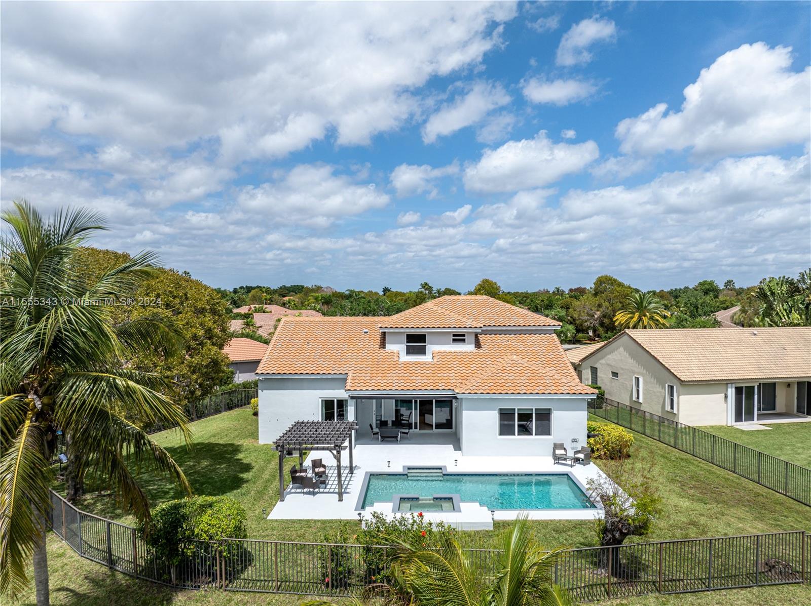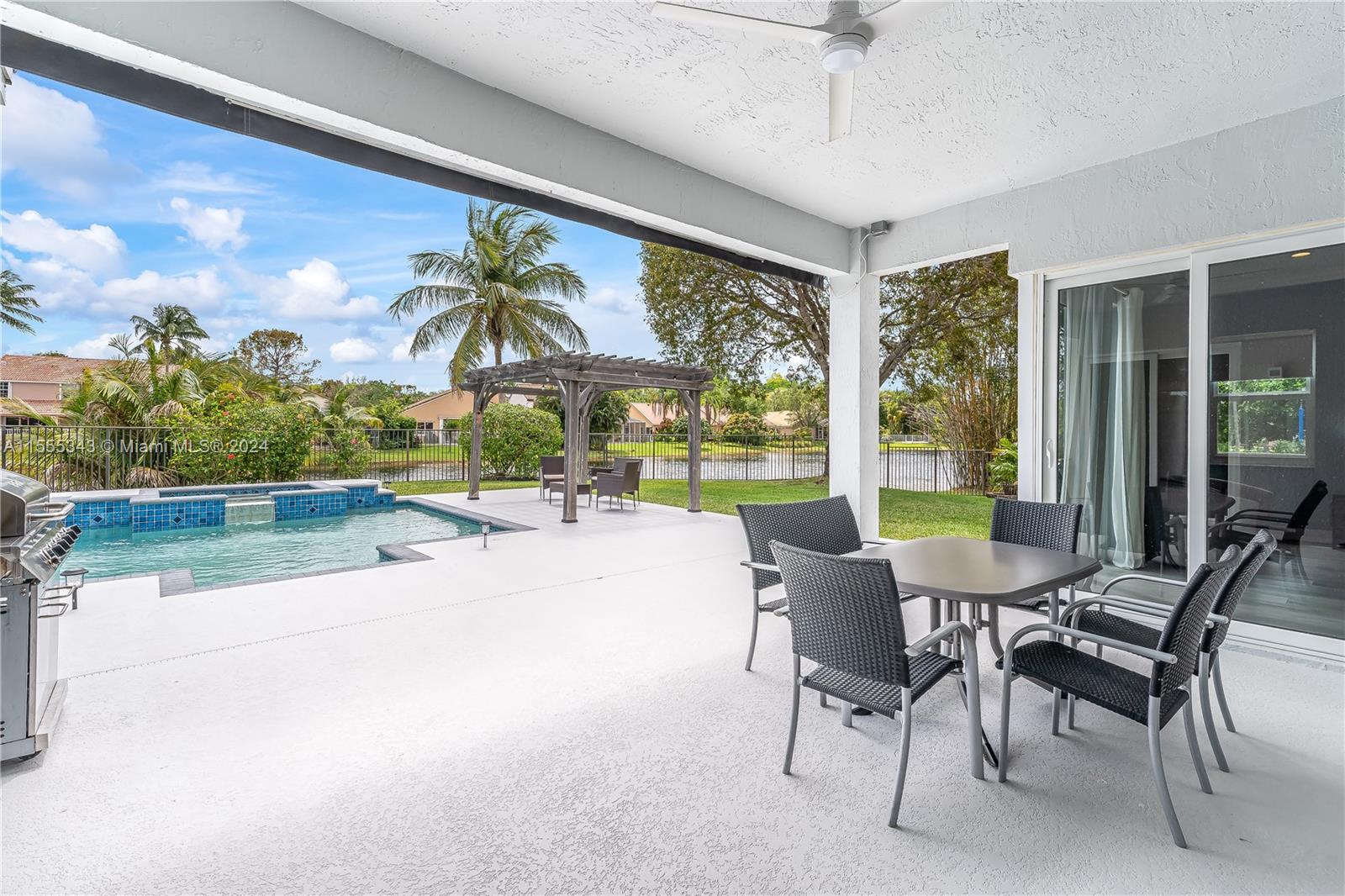 Beautiful 6b/4b Lakefront Pool Home nested on a pie shaped .39 Acre Cul-De-Sac Lot at The Hamptons in The Lakes! Be captivated by the spectacular panoramic lake views! 157 ft water frontage. Tons of natural light flows through the windows. This Home features a two story volume foyer, 10ft ceilings in first floor, 2020 Roof, 2022 Impact Windows & Sliding Doors, 2022 2 ACs, 2022 wood floors, stairs & baseboards, stunning marble floors, a gorgeous custom 2024 Chef's Kitchen w/quartz countertops & SS Appliances opens to an oversized FR & breakfast area, oversized main bedroom with lake views, 2023 window treatments, expansive concrete terrace with 2023 electrical awning extending the already large covered area, 2022 pool pump & more. Fully fenced. Beautifully landscaped. SEE VIRTUAL TOUR!